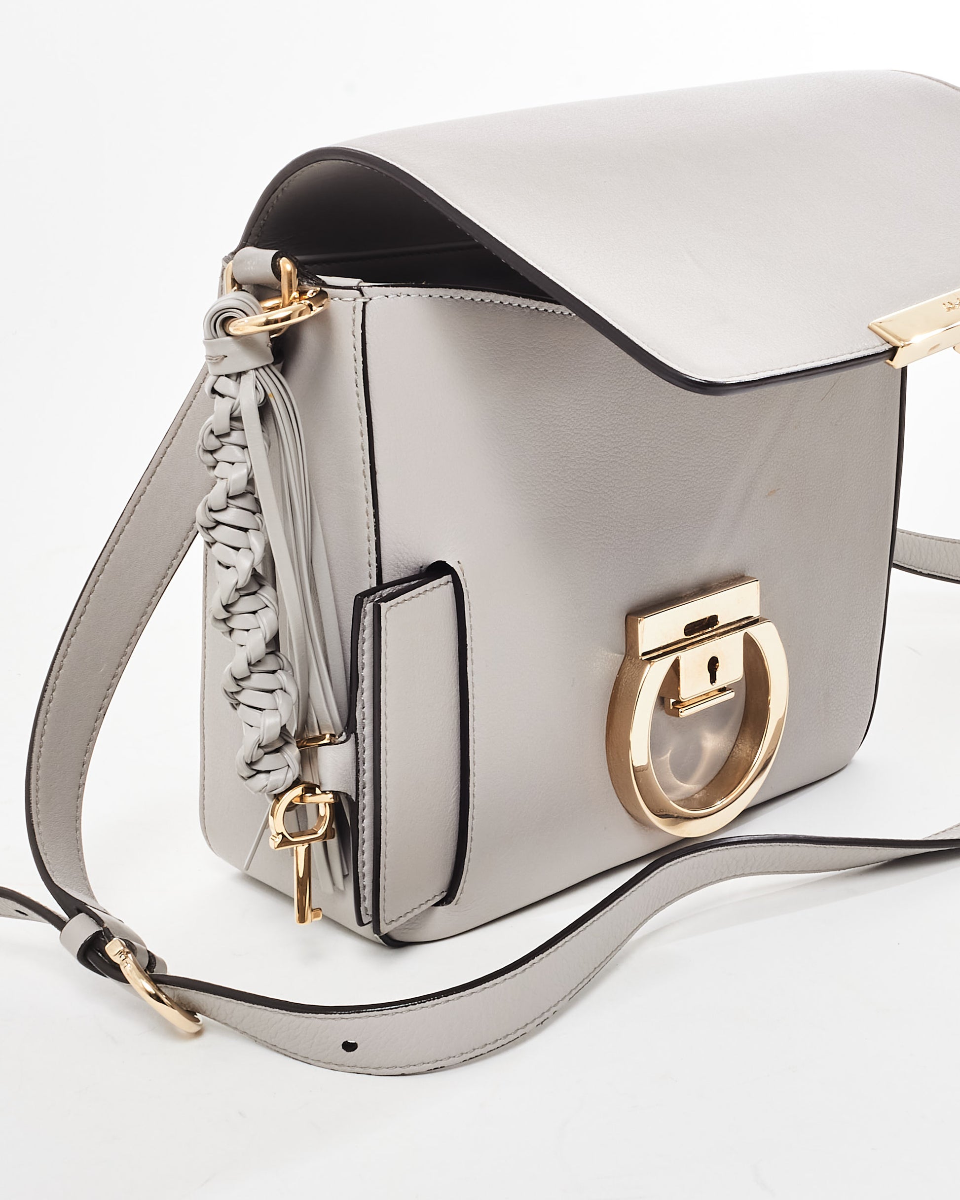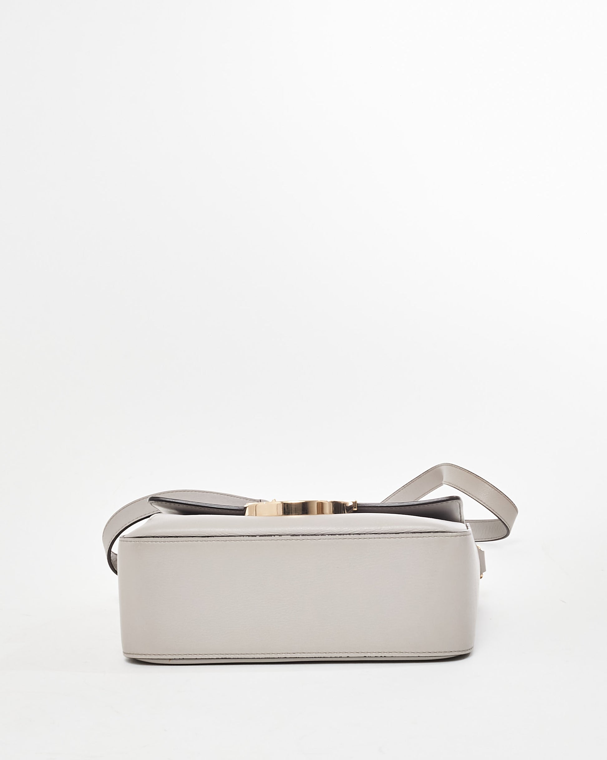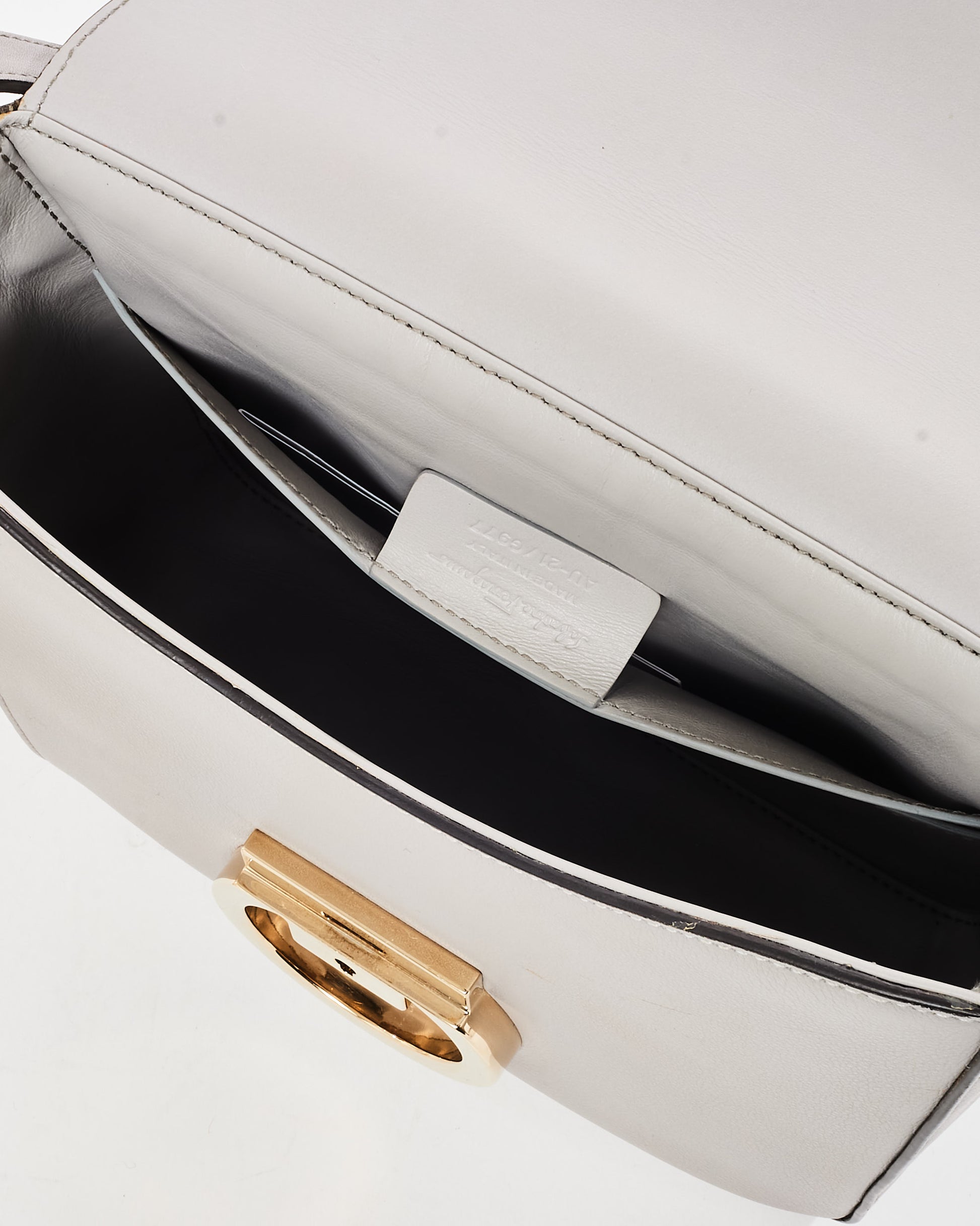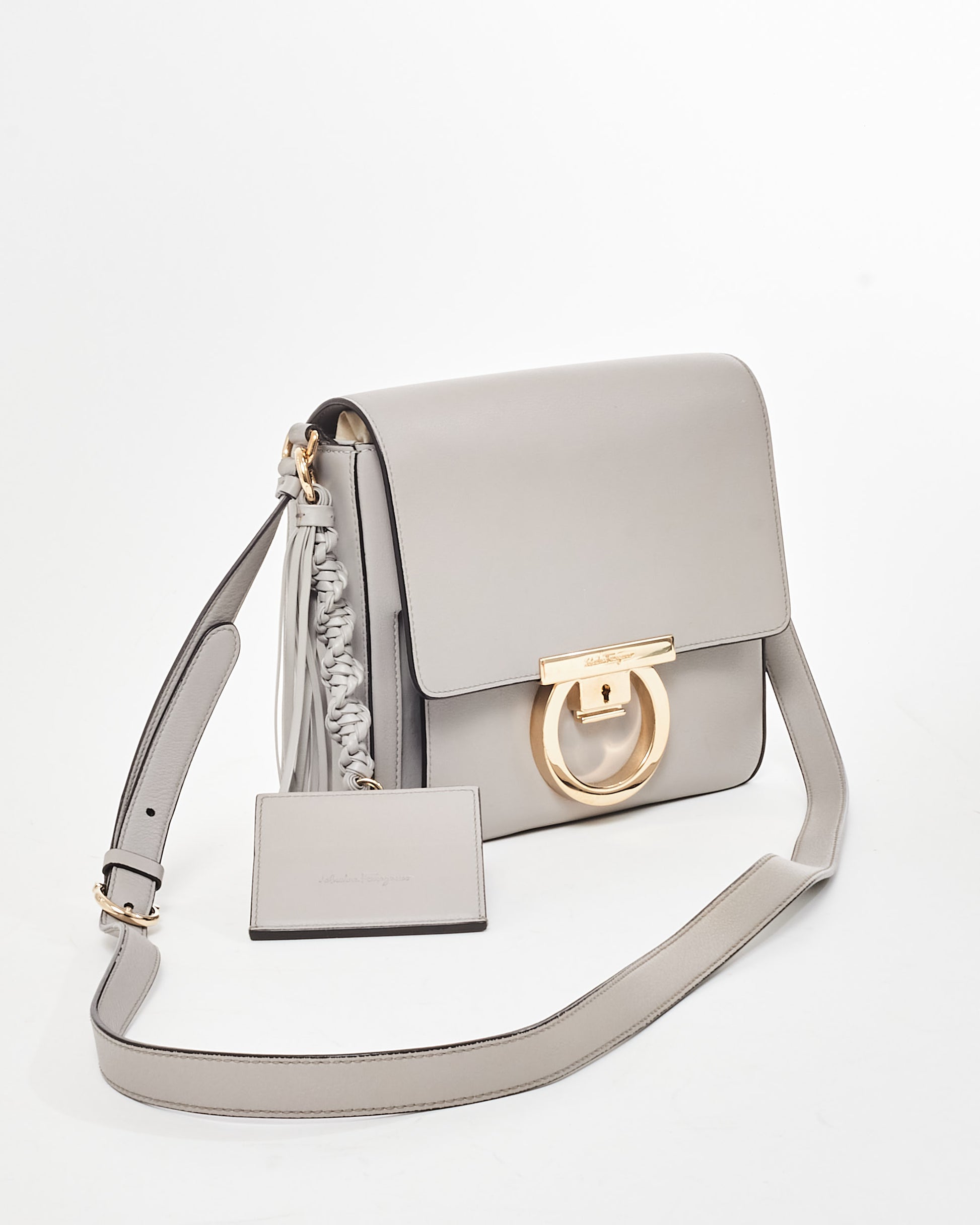 Exude understated sophistication with this authentic pre-owned Salvatore Ferragamo Light Grey Mini Tassel Gancini Lock Flap Shoulder Bag. Expertly crafted from smooth calfskin leather, this petite yet versatile piece features a stunning light grey hue, embodying timeless elegance and modern minimalism. The signature Gancini lock closure in polished gold-tone hardware adorns the front flap, adding a classic Ferragamo touch to this contemporary silhouette. A delicate leather tassel detail offers playful movement and charm, while the compact size ensures it’s perfect for carrying essentials like a phone, wallet, and keys. The bag’s chain and leather shoulder strap allows for
