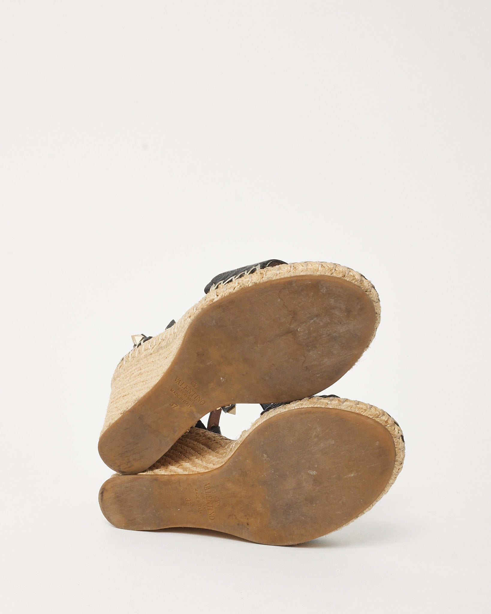 Black Leather Double Rockstud Espadrille Wedge Sandals 105mm - 37