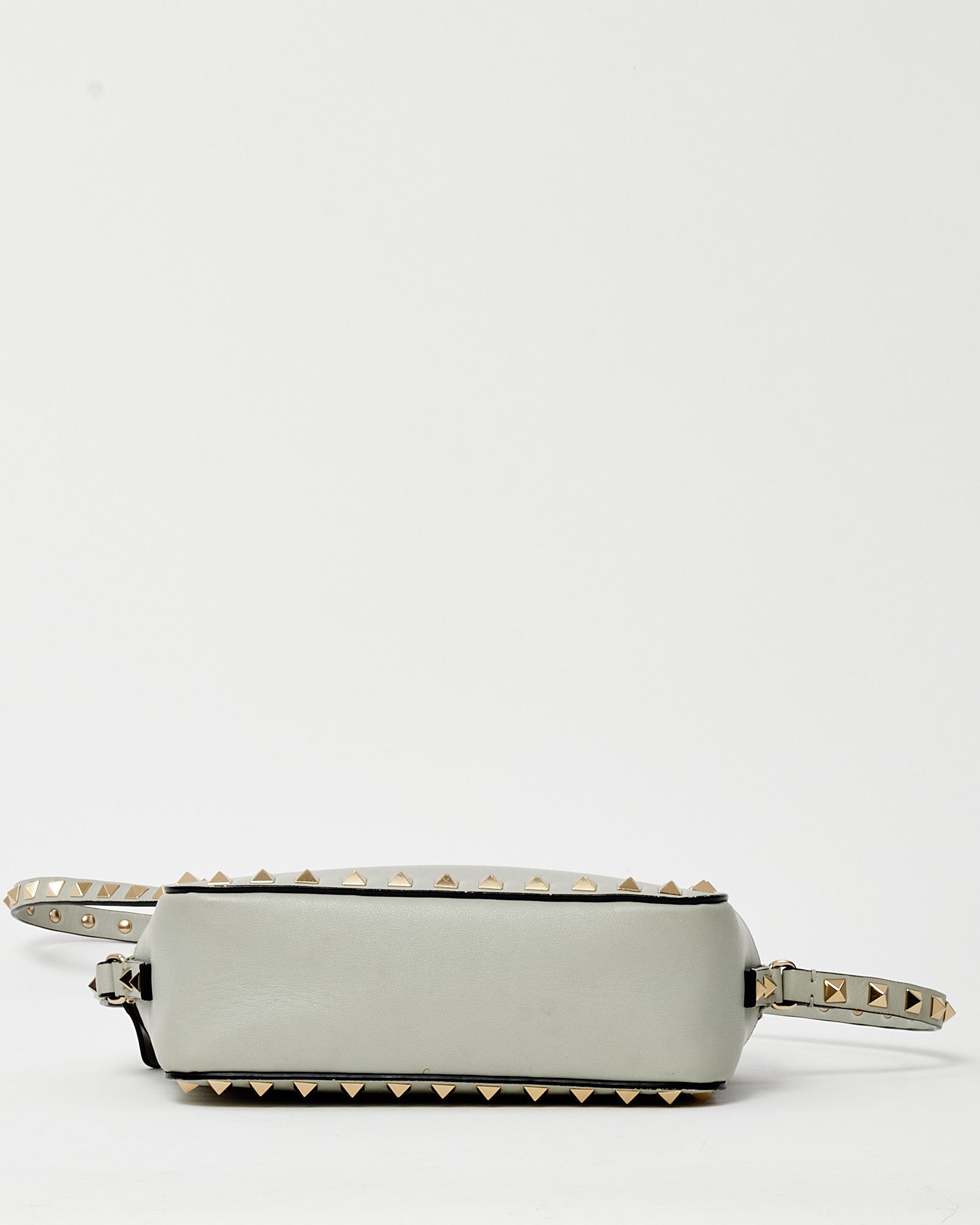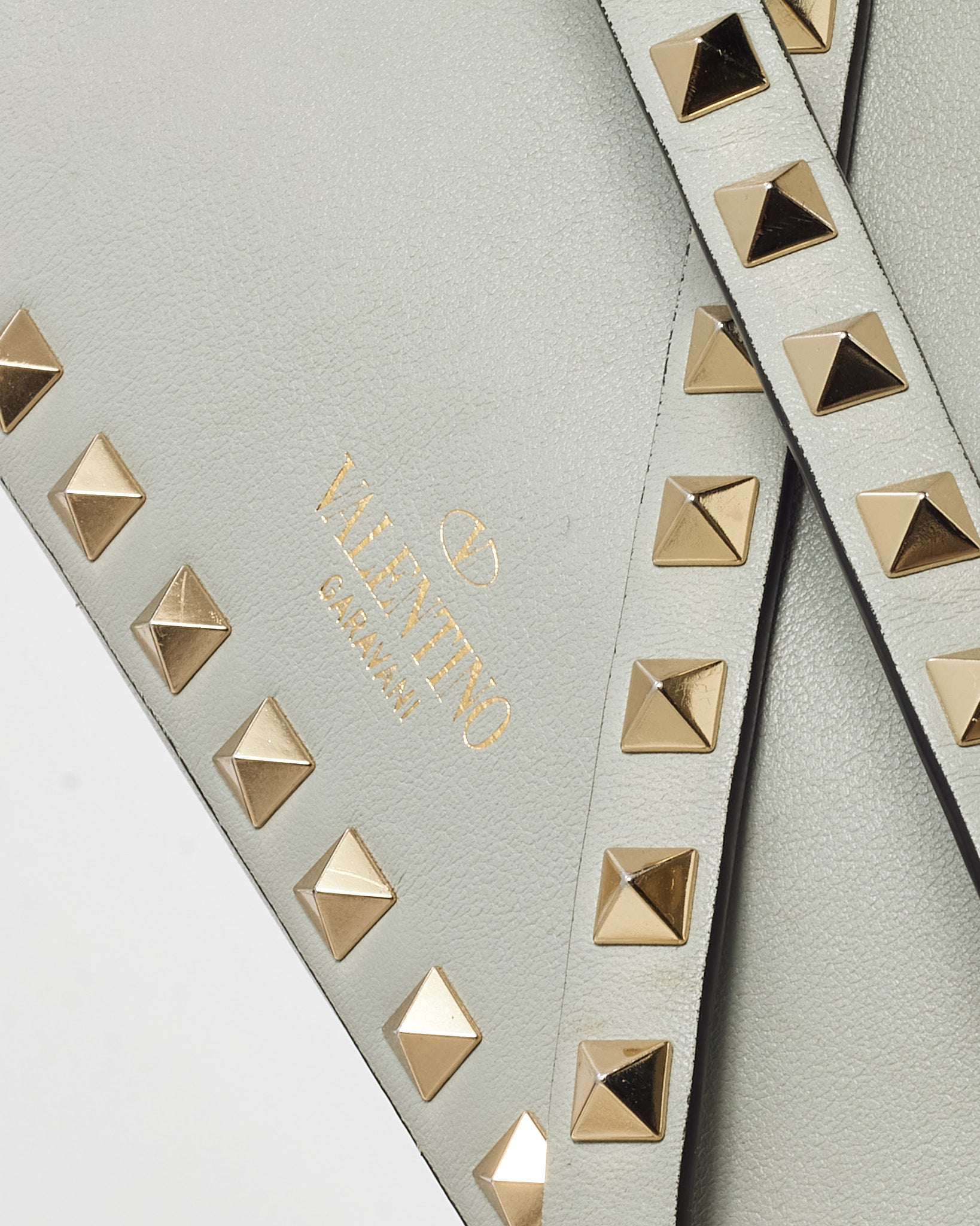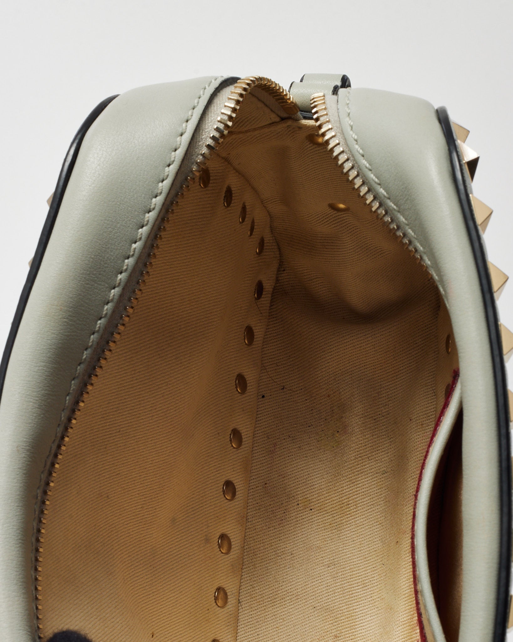 Add a soft touch of pastel sophistication with this pre-loved authentic Valentino Rockstud Camera Bag in pale blue leather. Iconic gold-tone pyramid studs edge the compact silhouette, offering a bold contrast against the serene tone of the calfskin exterior. A zip-top closure opens to a practical interior sized for everyday essentials, while the adjustable crossbody strap ensures effortless wear. Perfect for injecting both edge and elegance into your rotation, this Valentino piece is a versatile day-to-night companion.