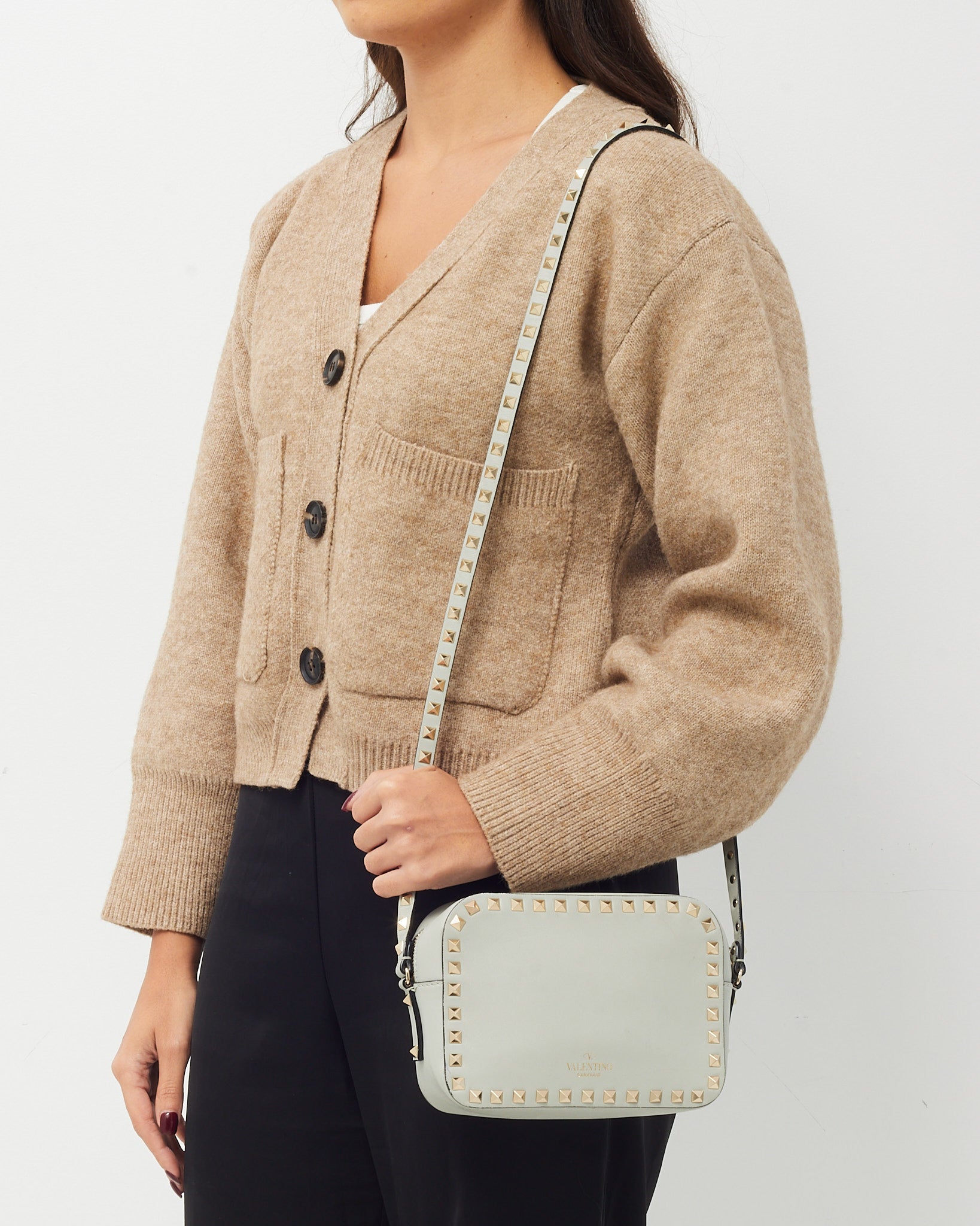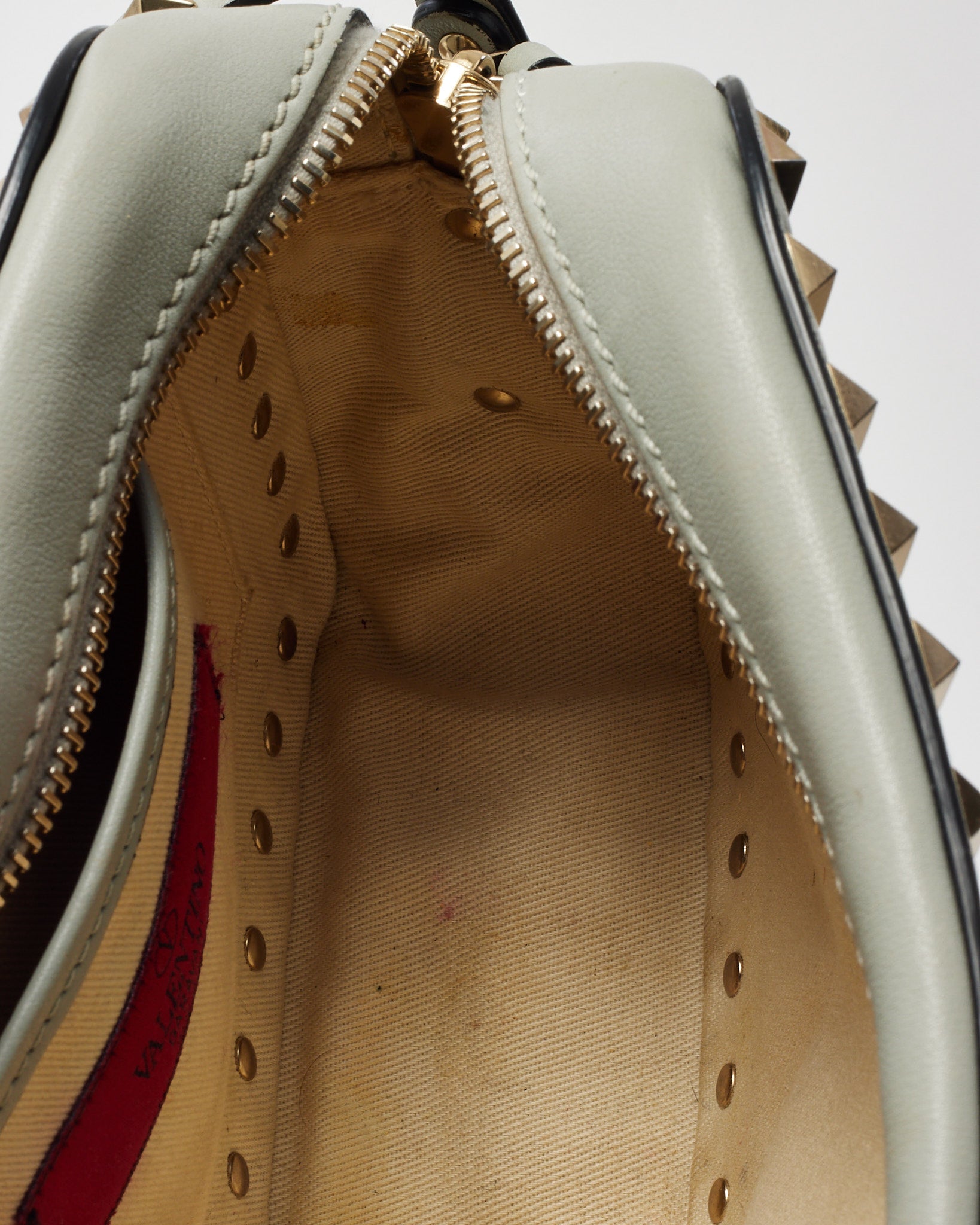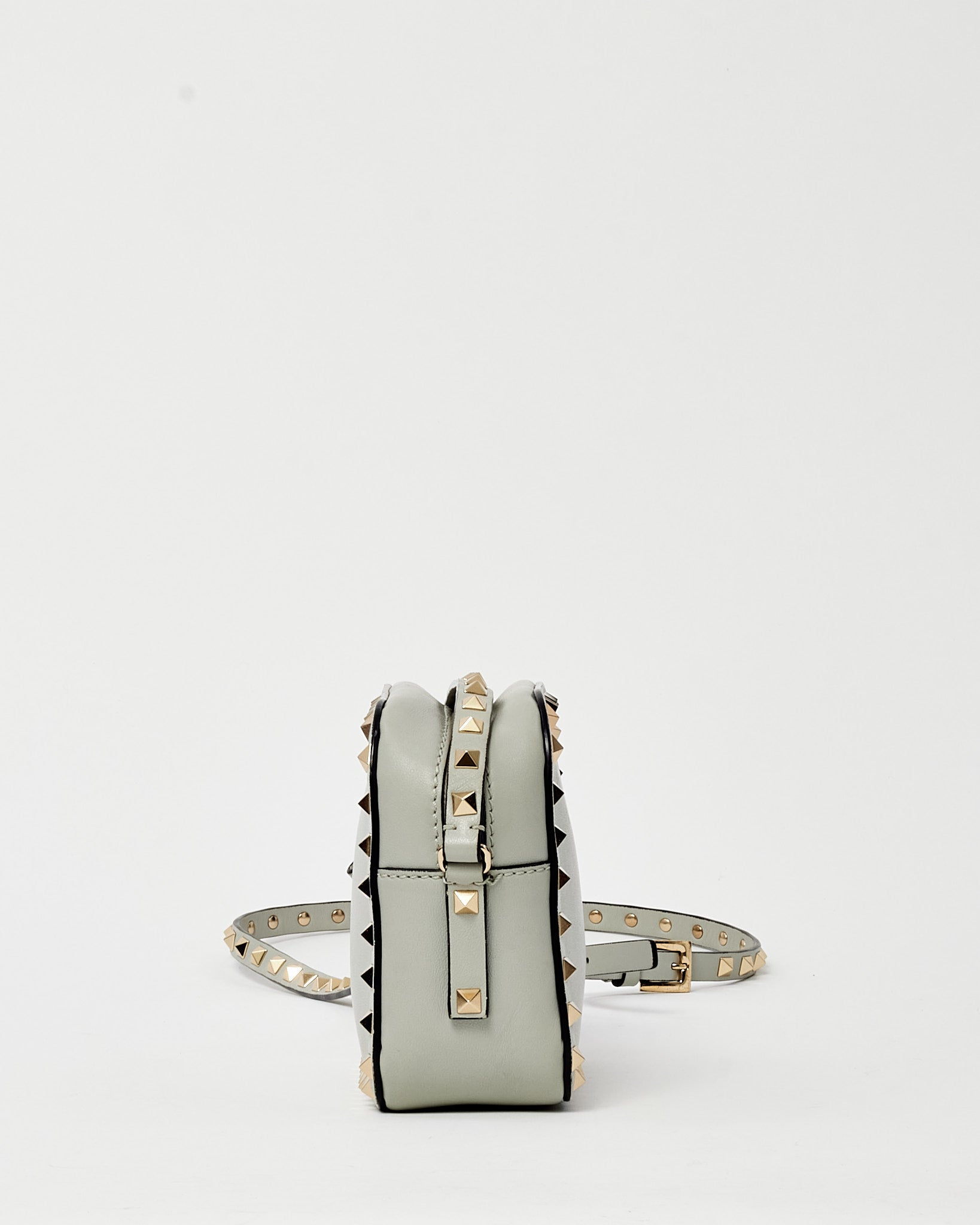 Add a soft touch of pastel sophistication with this pre-loved authentic Valentino Rockstud Camera Bag in pale blue leather. Iconic gold-tone pyramid studs edge the compact silhouette, offering a bold contrast against the serene tone of the calfskin exterior. A zip-top closure opens to a practical interior sized for everyday essentials, while the adjustable crossbody strap ensures effortless wear. Perfect for injecting both edge and elegance into your rotation, this Valentino piece is a versatile day-to-night companion.