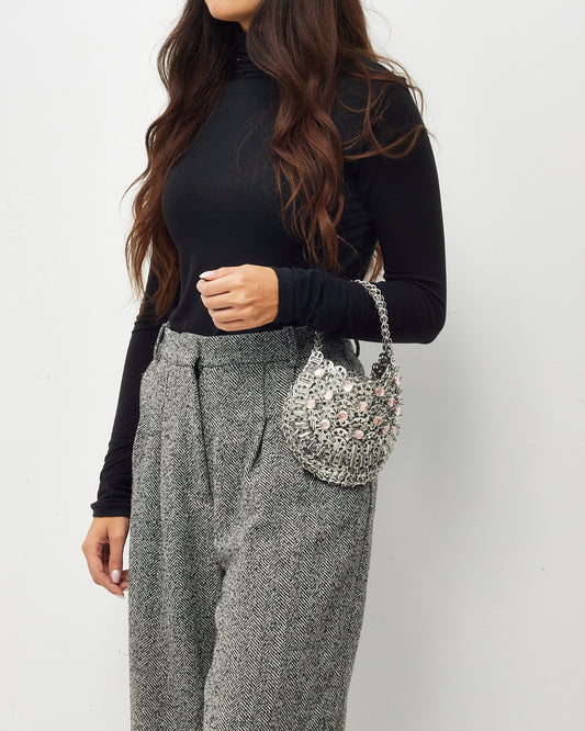 Silver Chain Mail Brass and Pink Crystal Stud 1969 Moon Small Shoulder Bag