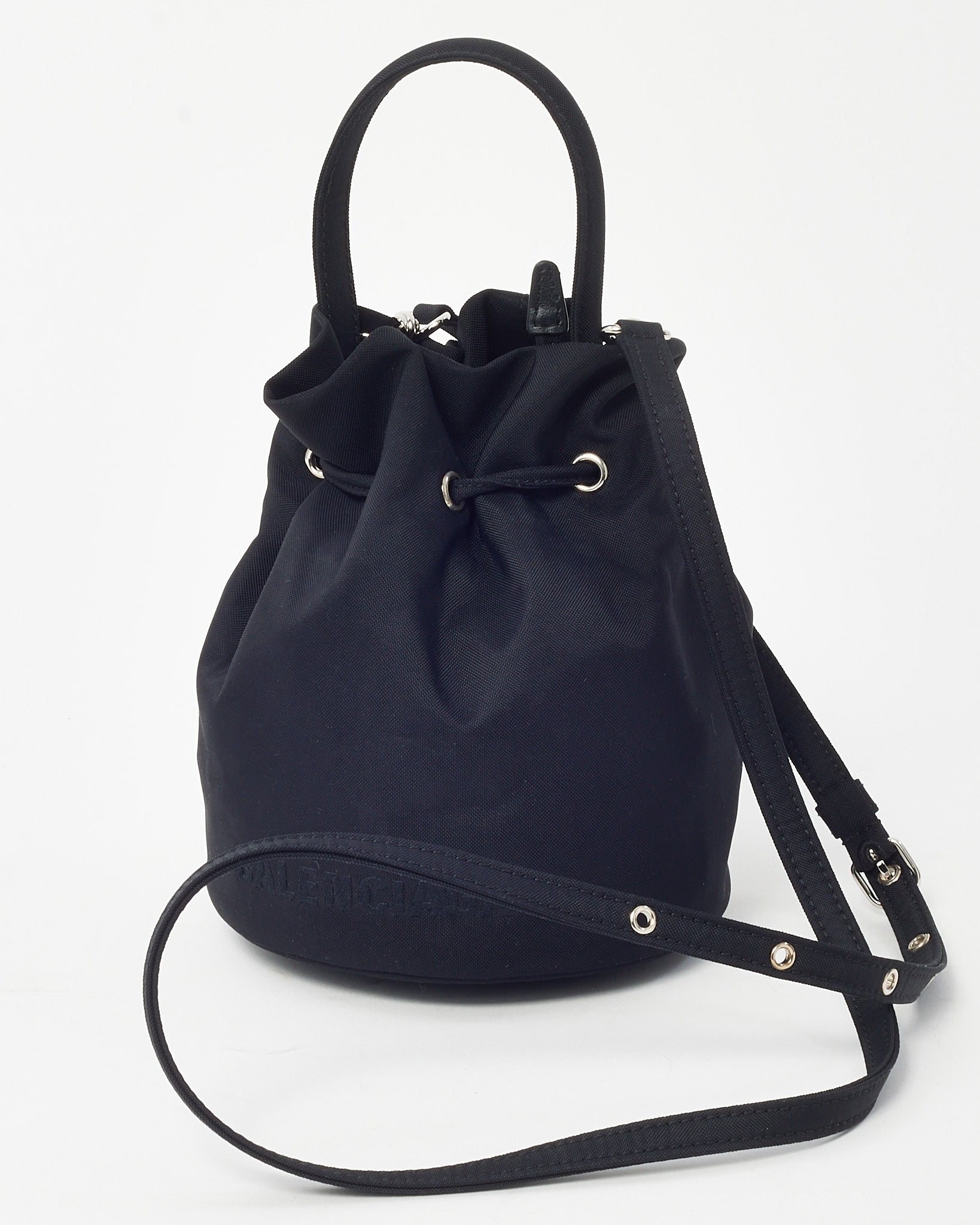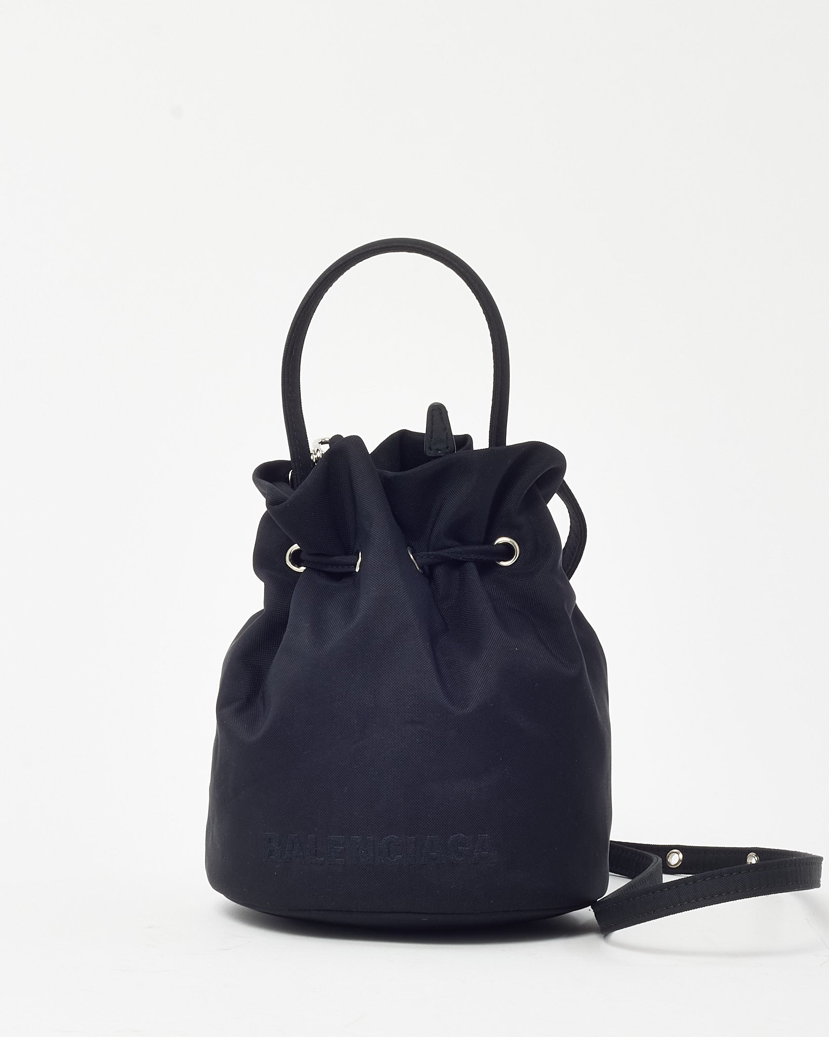 Channel effortless street-chic style with this pre-loved authentic Balenciaga Wheel XS Bucket Bag, crafted in durable black nylon with tonal black logo detailing. Its compact silhouette is cinched with a sporty drawstring closure, while a detachable and adjustable strap offers versatile wear as a crossbody or shoulder bag. Lightweight and easy to carry, this minimalist design is perfect for on-the-go essentials, blending everyday functionality with unmistakable Balenciaga attitude. A contemporary must-have for fashion lovers seeking sleek urban edge.