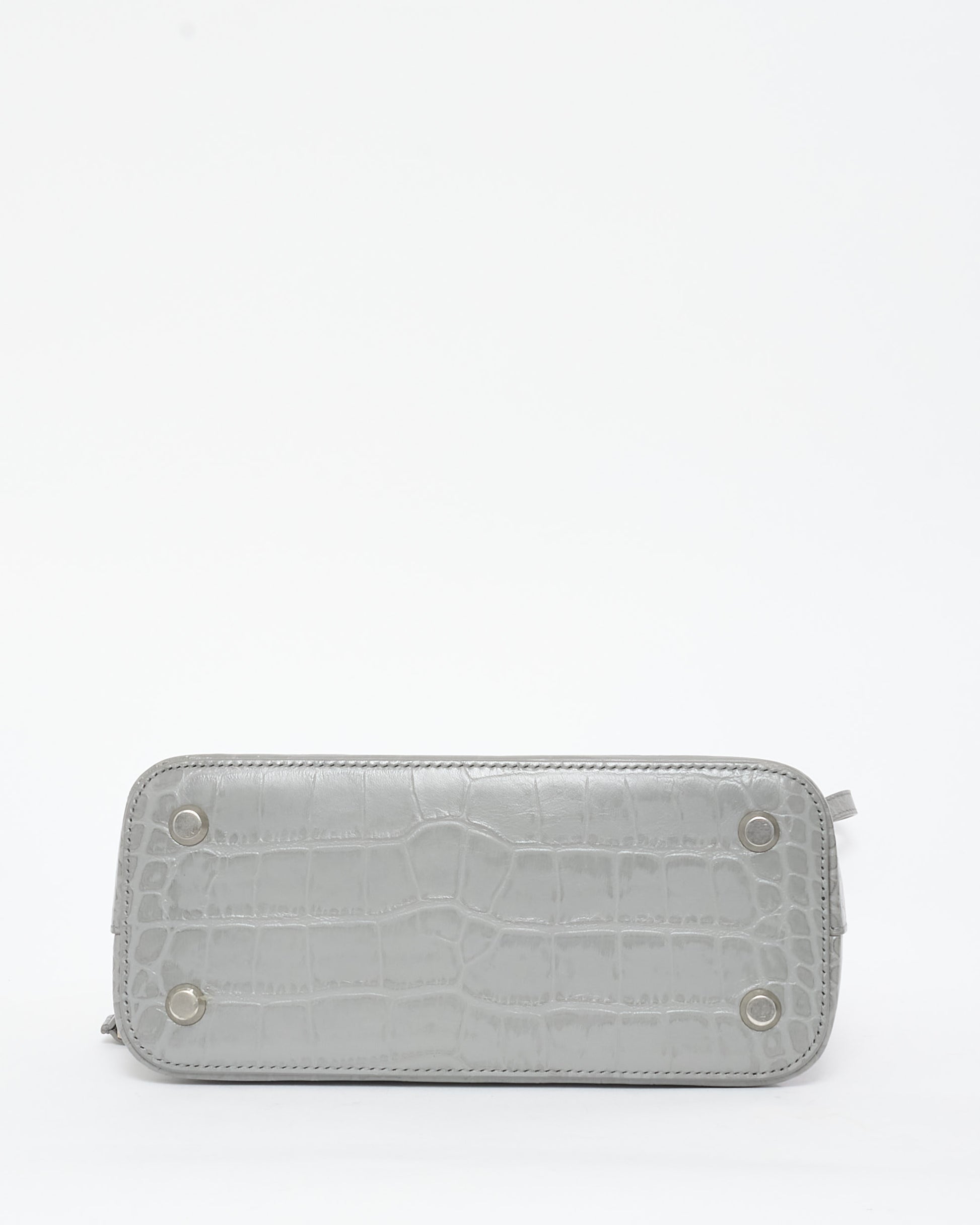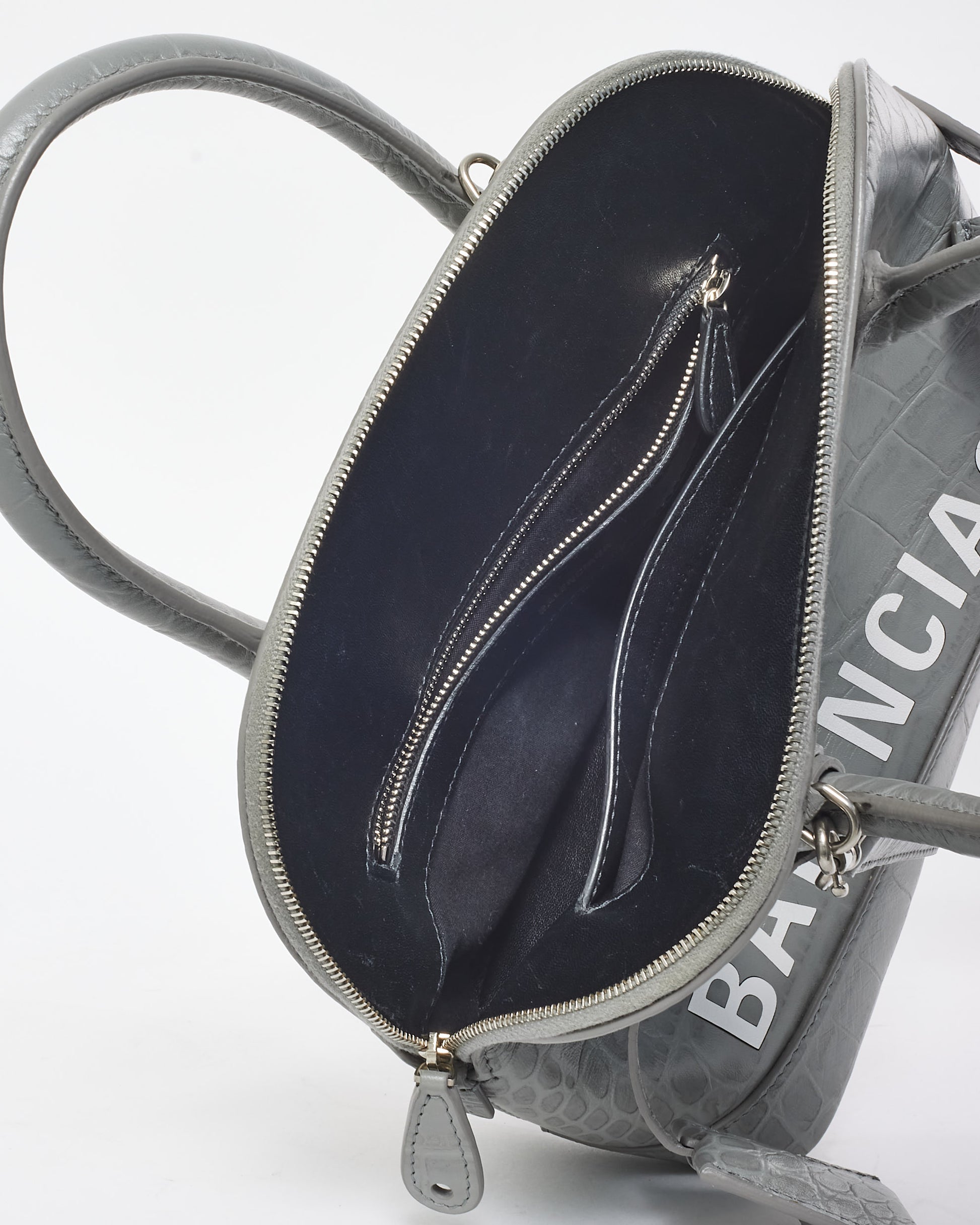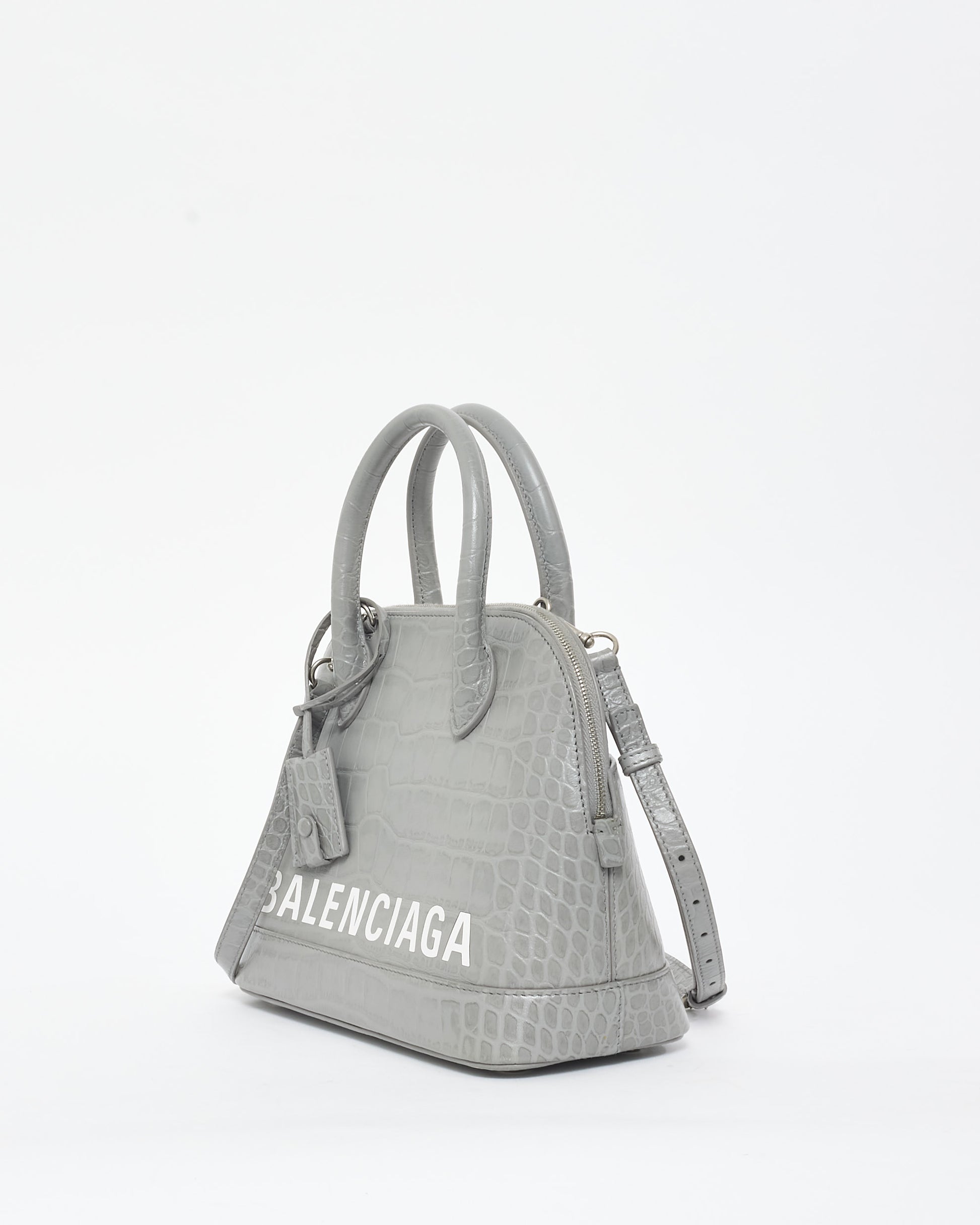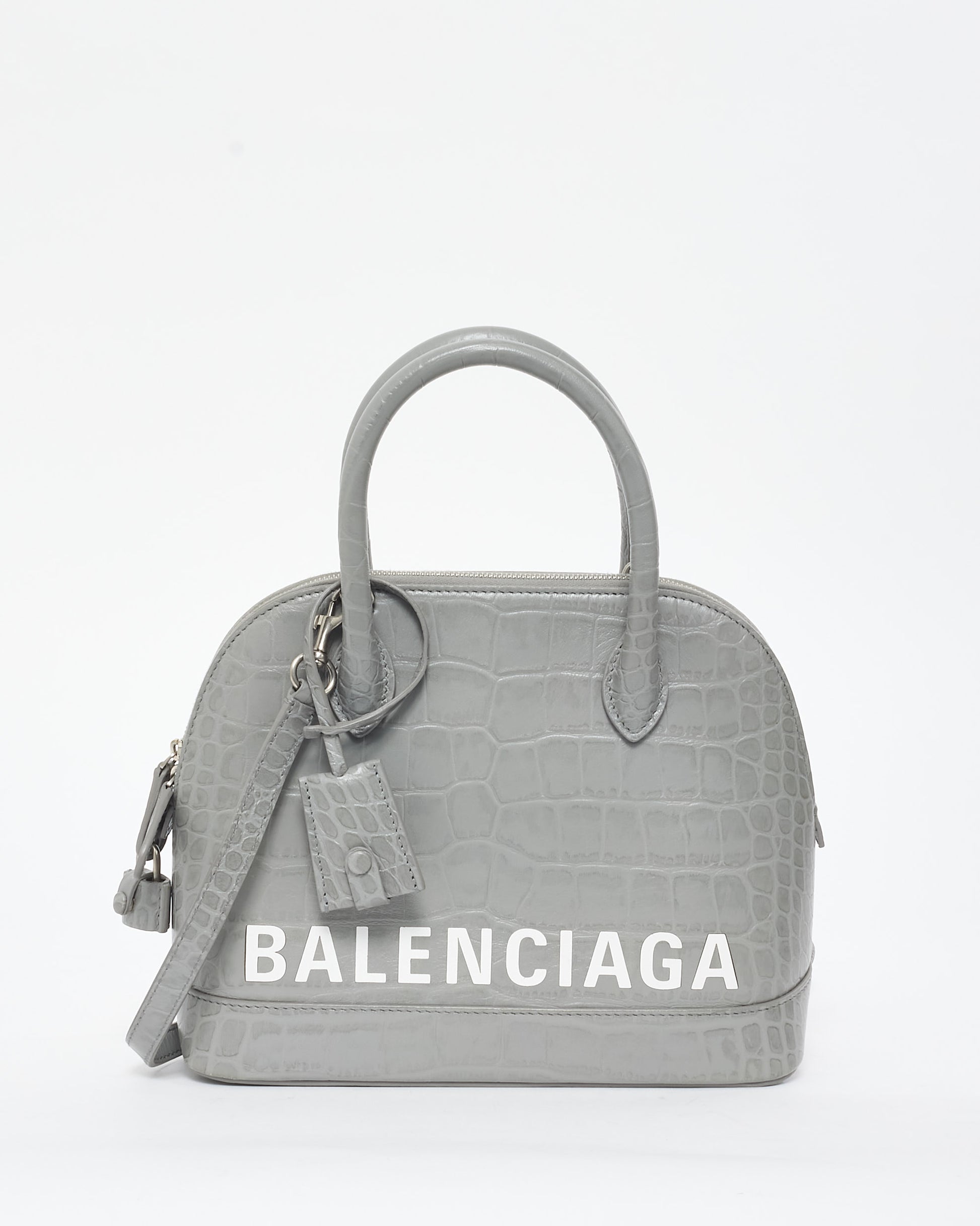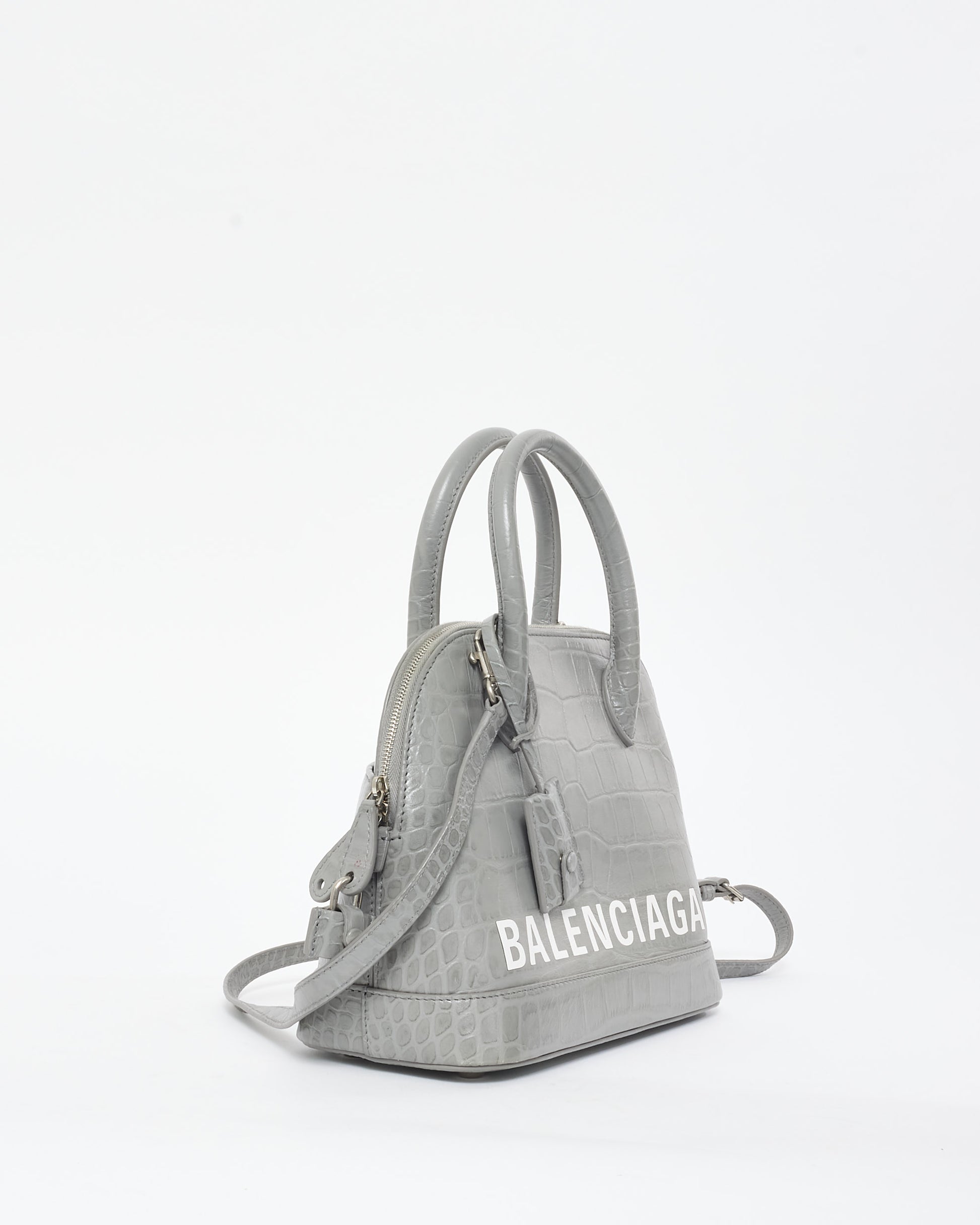 Elevate your style with the 100% authnentic pre-owned Balenciaga Light Grey Croc Embossed White Logo Ville Small Top Handle Bag. Crafted from premium croc-embossed leather, dome shape, top handles, adjustable and removable strap, leather lining this - chic accessory features a striking white logo that adds a modern touch. Its compact size is perfect for your daily essentials. Shop pre-owned Balenciaga at Retyche.