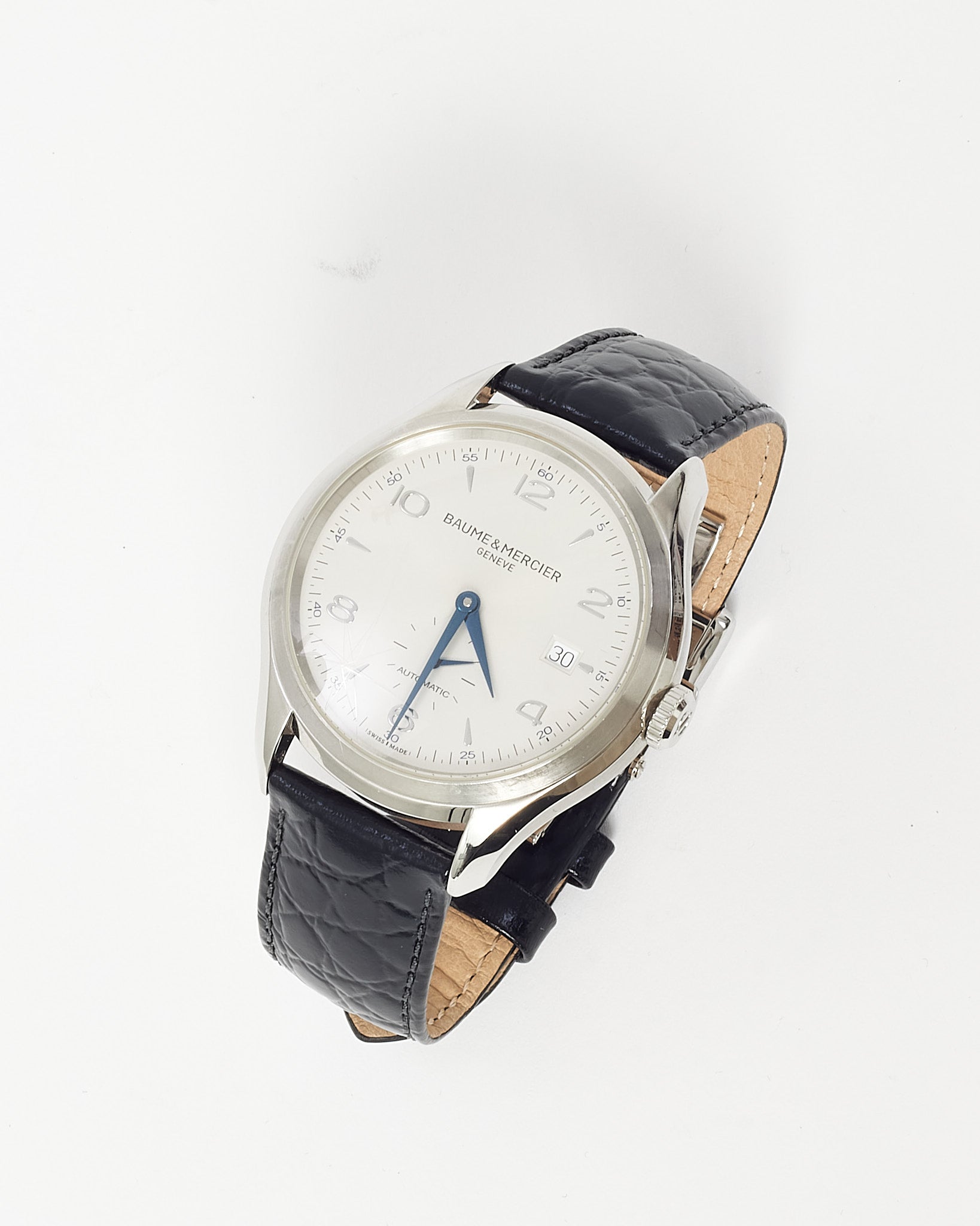 Refined and timeless, this pre-loved authentic Baume & Mercier Stainless Steel White Dial Black Croc Leather Clifton Baumatic 40mm Watch showcases precision and elegance. The polished stainless steel case frames a clean white dial with silver-tone hour markers and a date window for understated sophistication. Powered by Baumatic automatic movement, it ensures exceptional accuracy and reliability. The black crocodile-embossed leather strap adds a touch of luxury, making this timepiece perfect for both professional and formal wear.