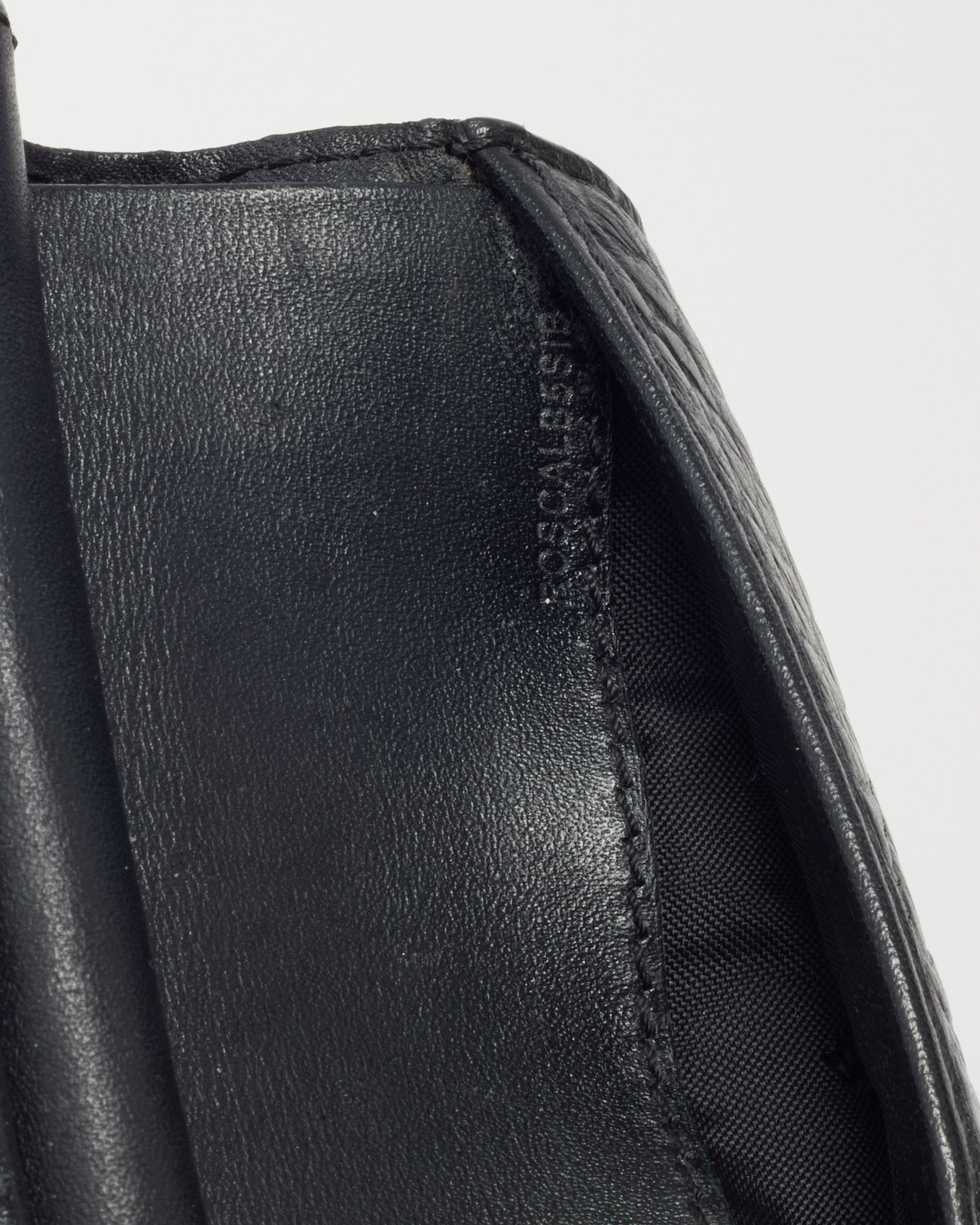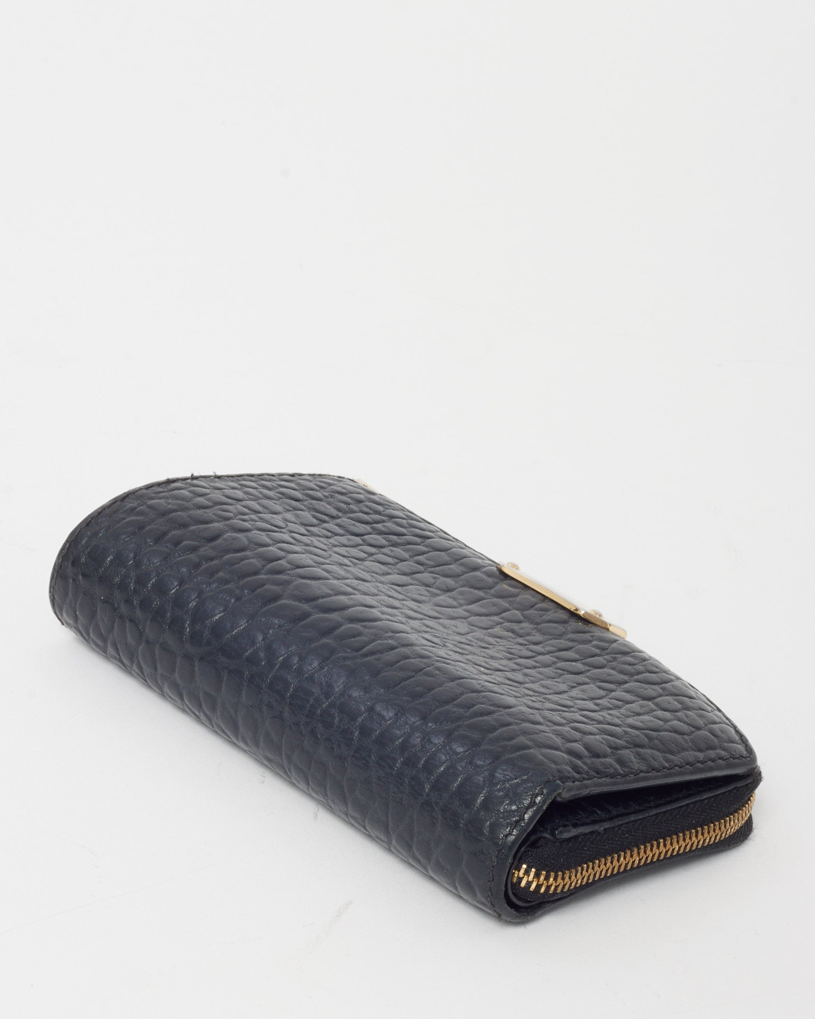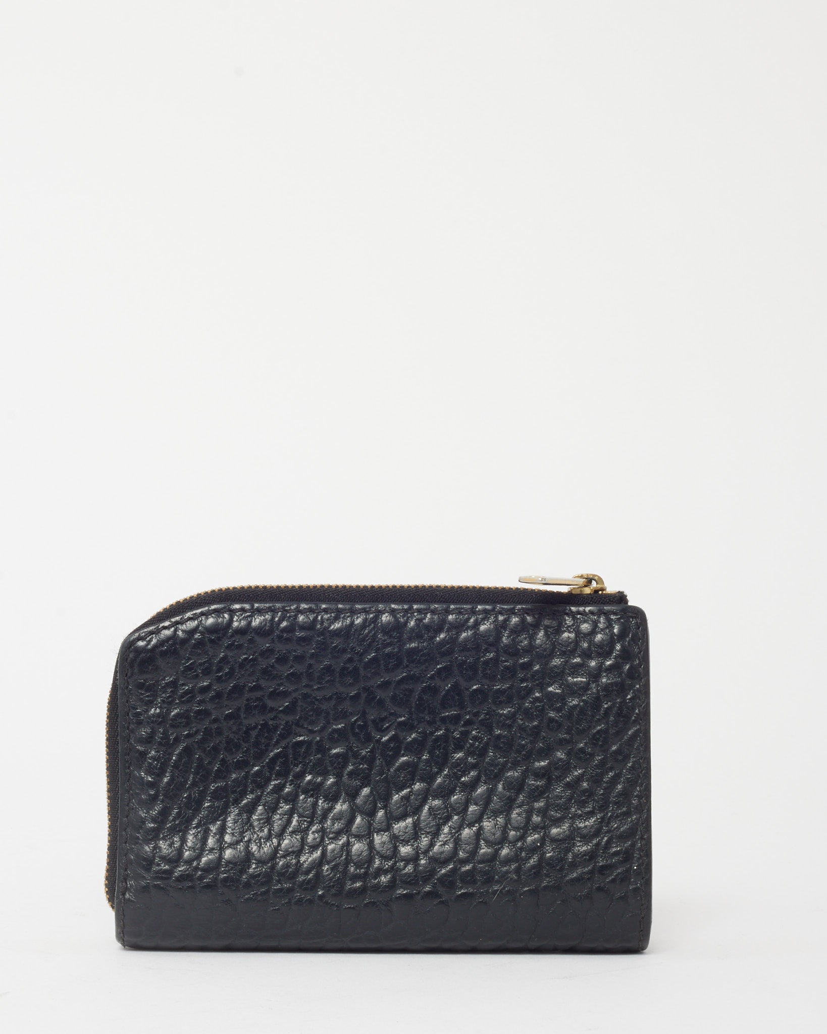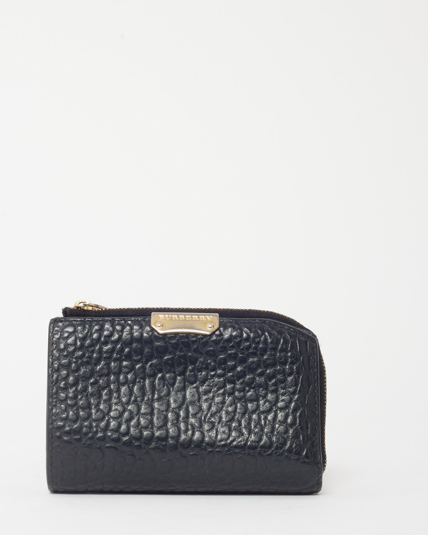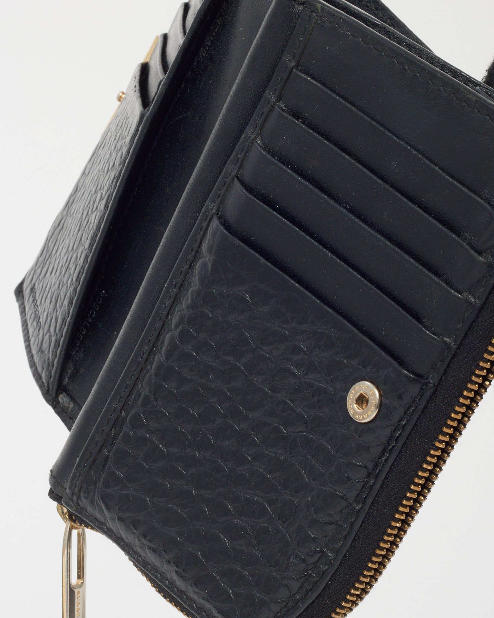 Compact and timeless, this pre-loved authentic Burberry Black Textured Leather Gold Logo Small Wallet is a sleek essential for refined everyday organization. Crafted from grained black leather for durability and a luxurious hand-feel, this bifold wallet features a gold-plated Burberry logo for a touch of understated elegance. The interior offers card slots, a bill compartment, and a snap coin pocket, making it both stylish and practical. A perfect companion for structured bags or on-the-go minimalism.