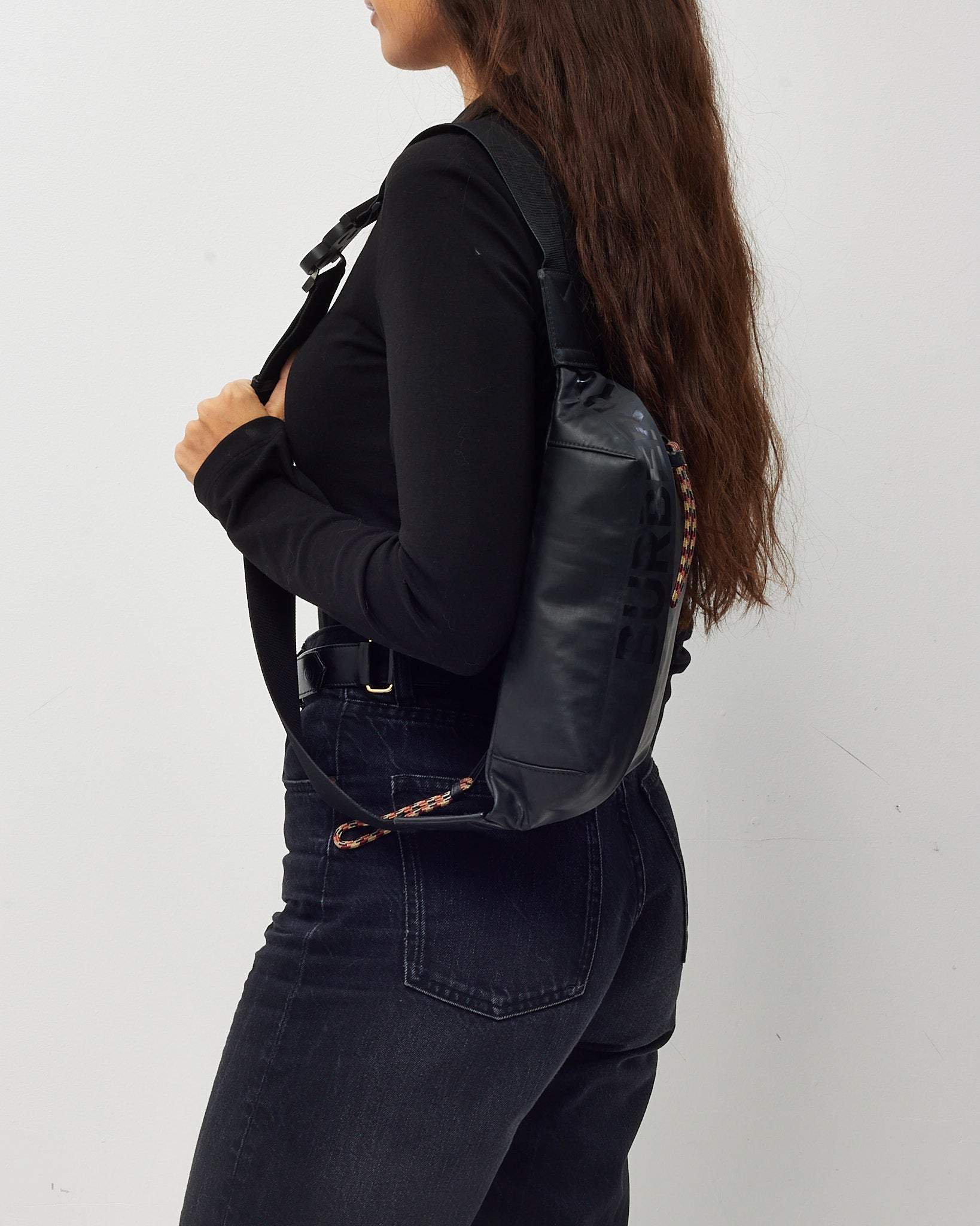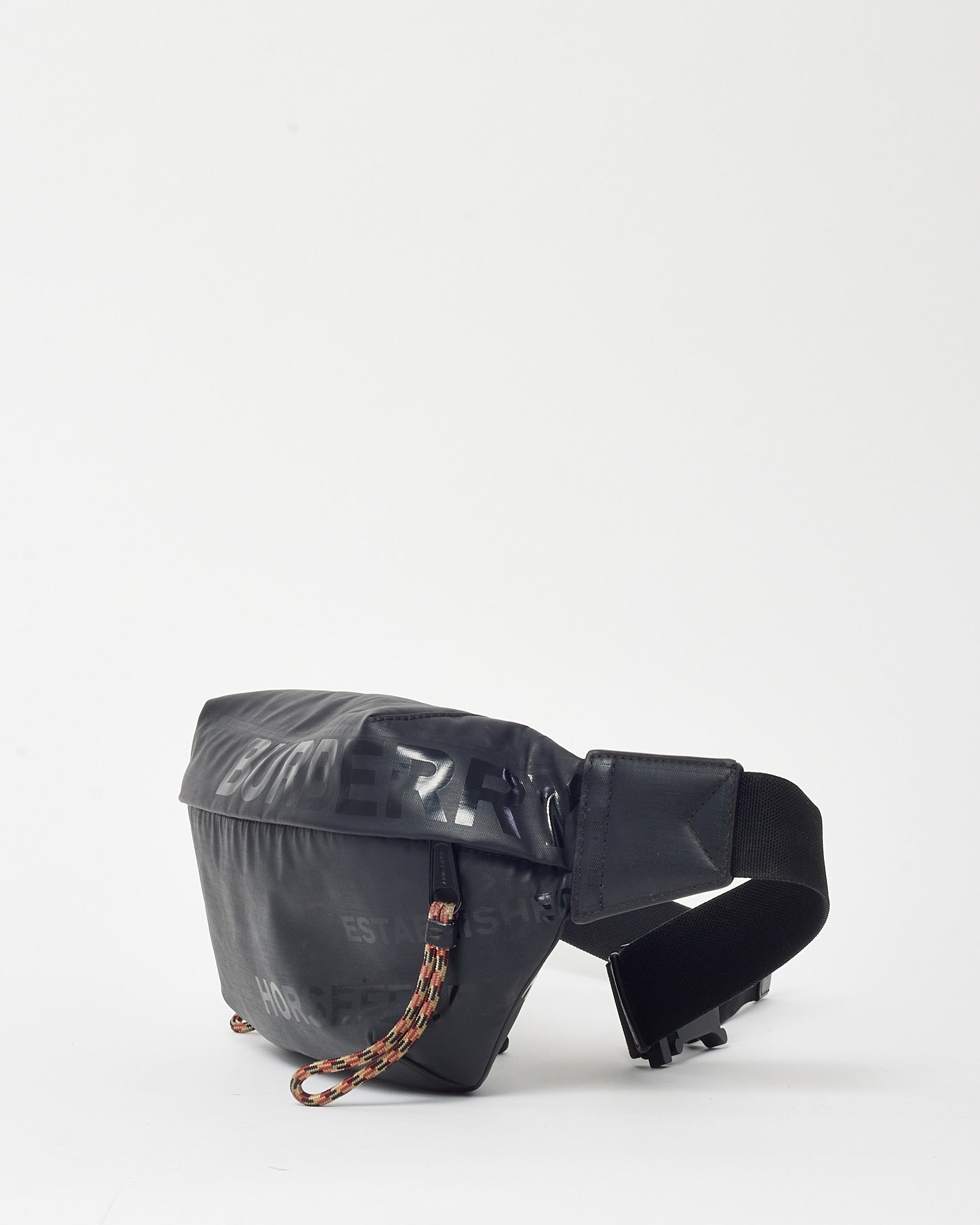 Make a bold statement with this pre-loved authentic Burberry Sonny Bum Bag, crafted in black waxed cotton-coated canvas and detailed with the striking Horseferry logo print. This streetwear-ready silhouette features a zip-top closure, adjustable strap for crossbody or waist styling, and sleek tonal hardware. Compact yet functional, it’s the perfect hands-free piece for elevating casual looks with modern Burberry edge.