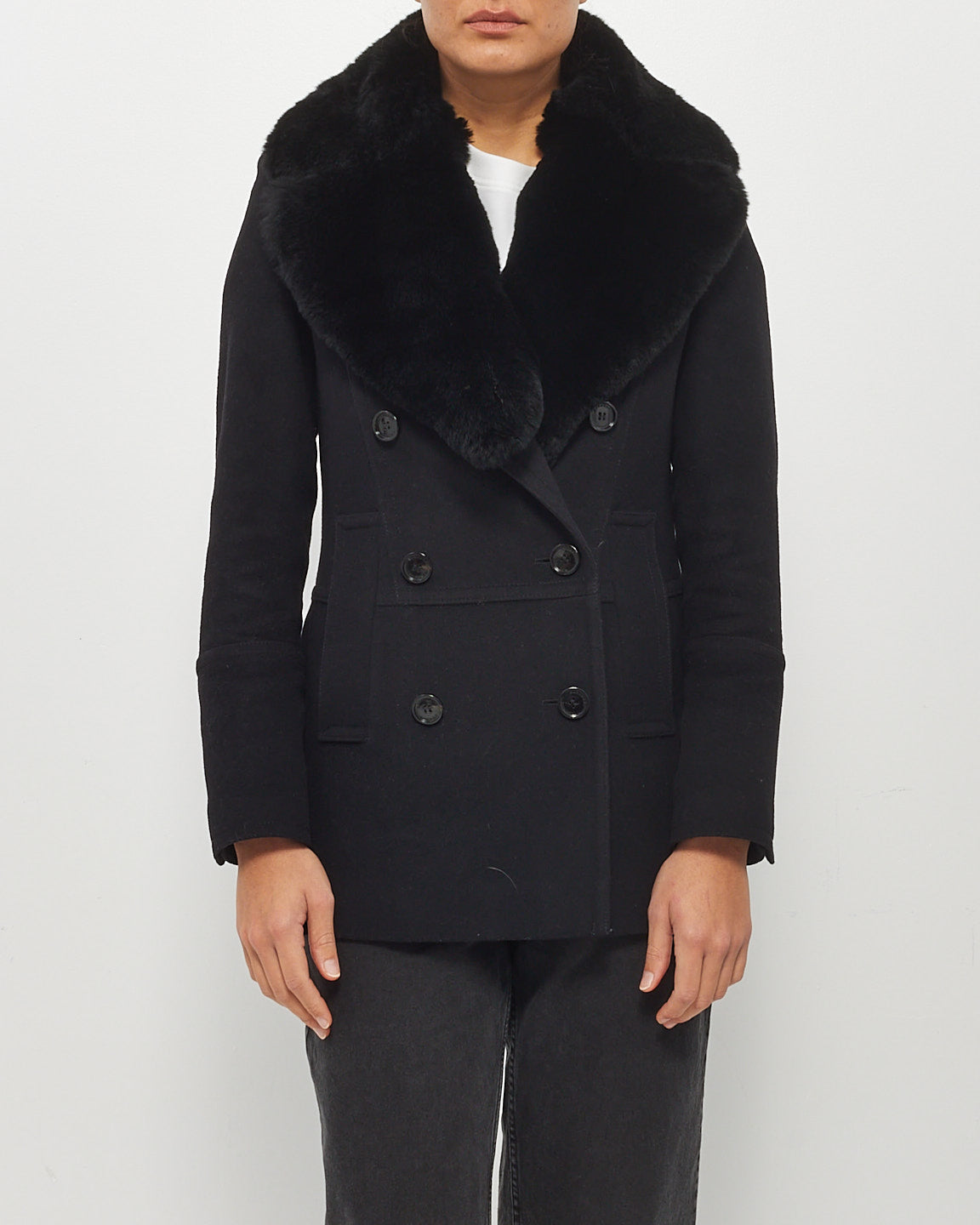Manteau double poitrine à col en fourrure de laine noire - 4