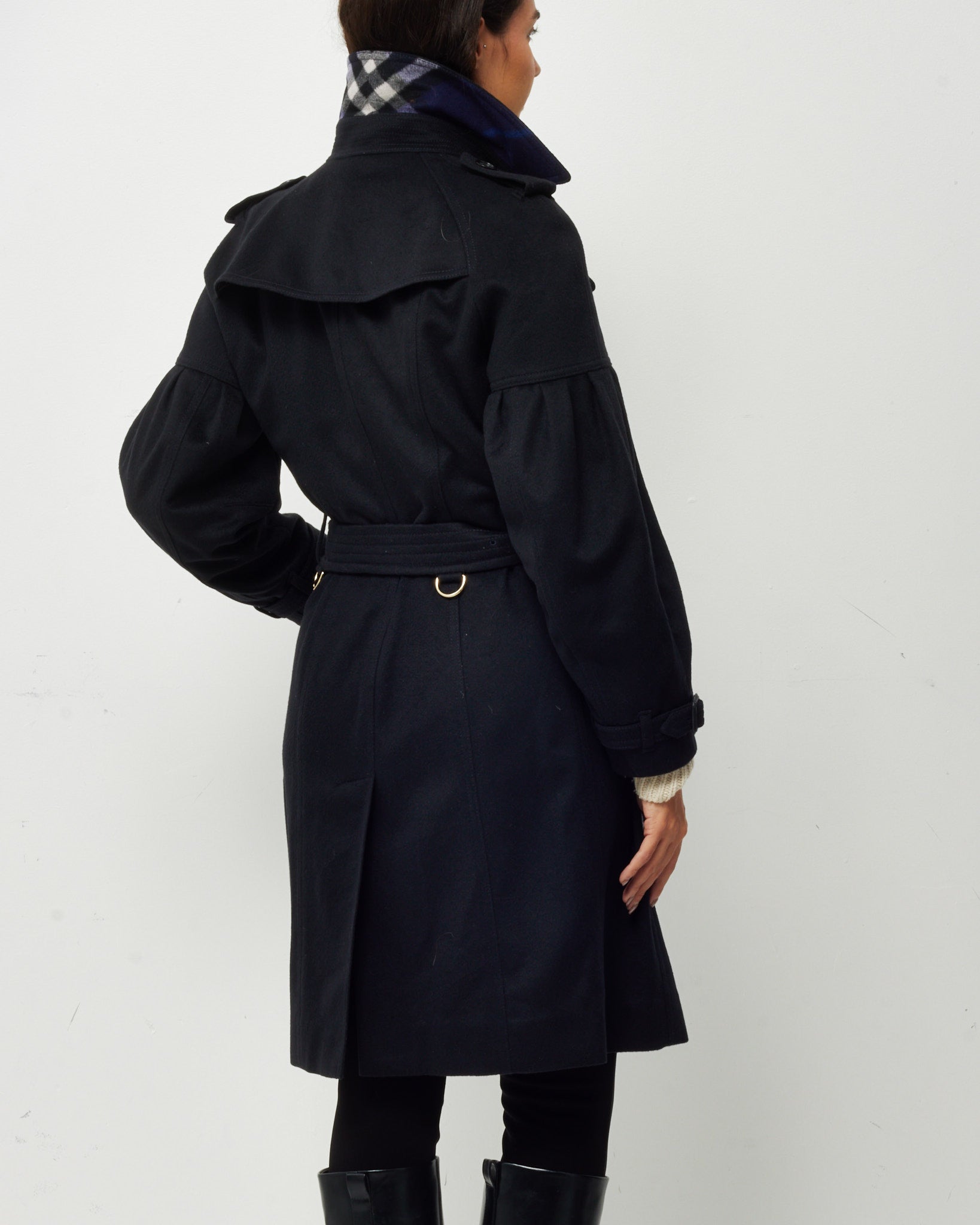 Black Wool Mid-Length Balloon Sleeve Belted Trench Coat - US 8