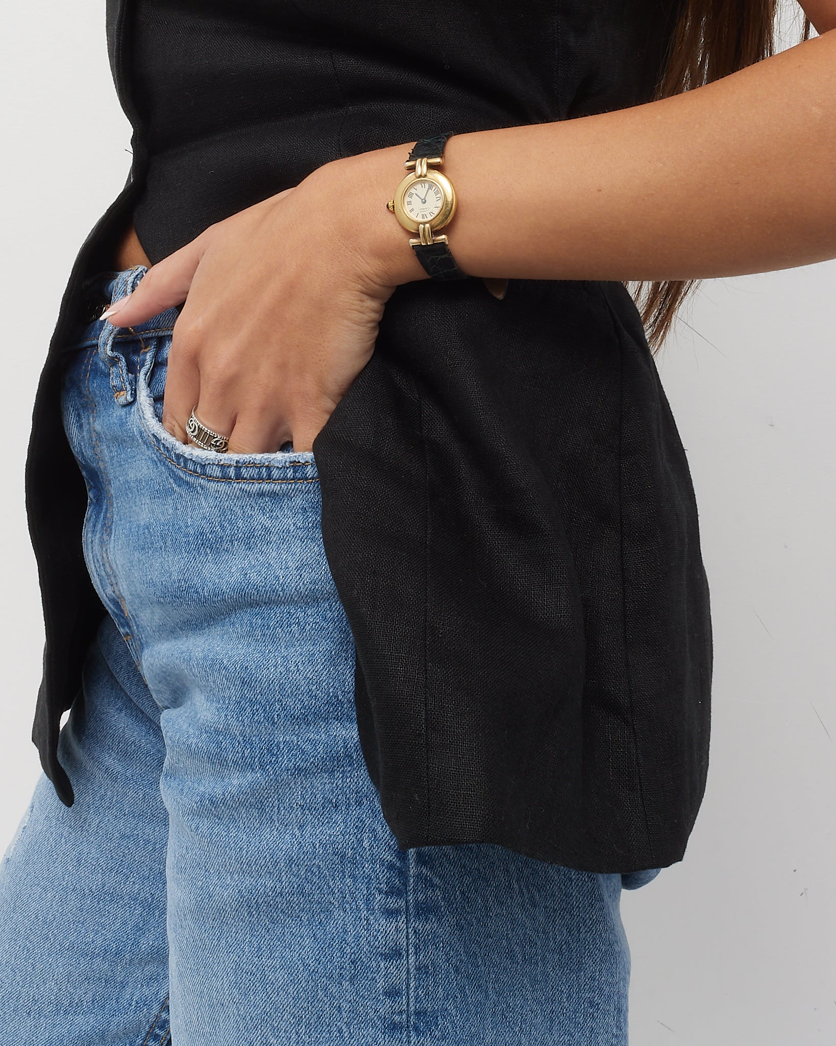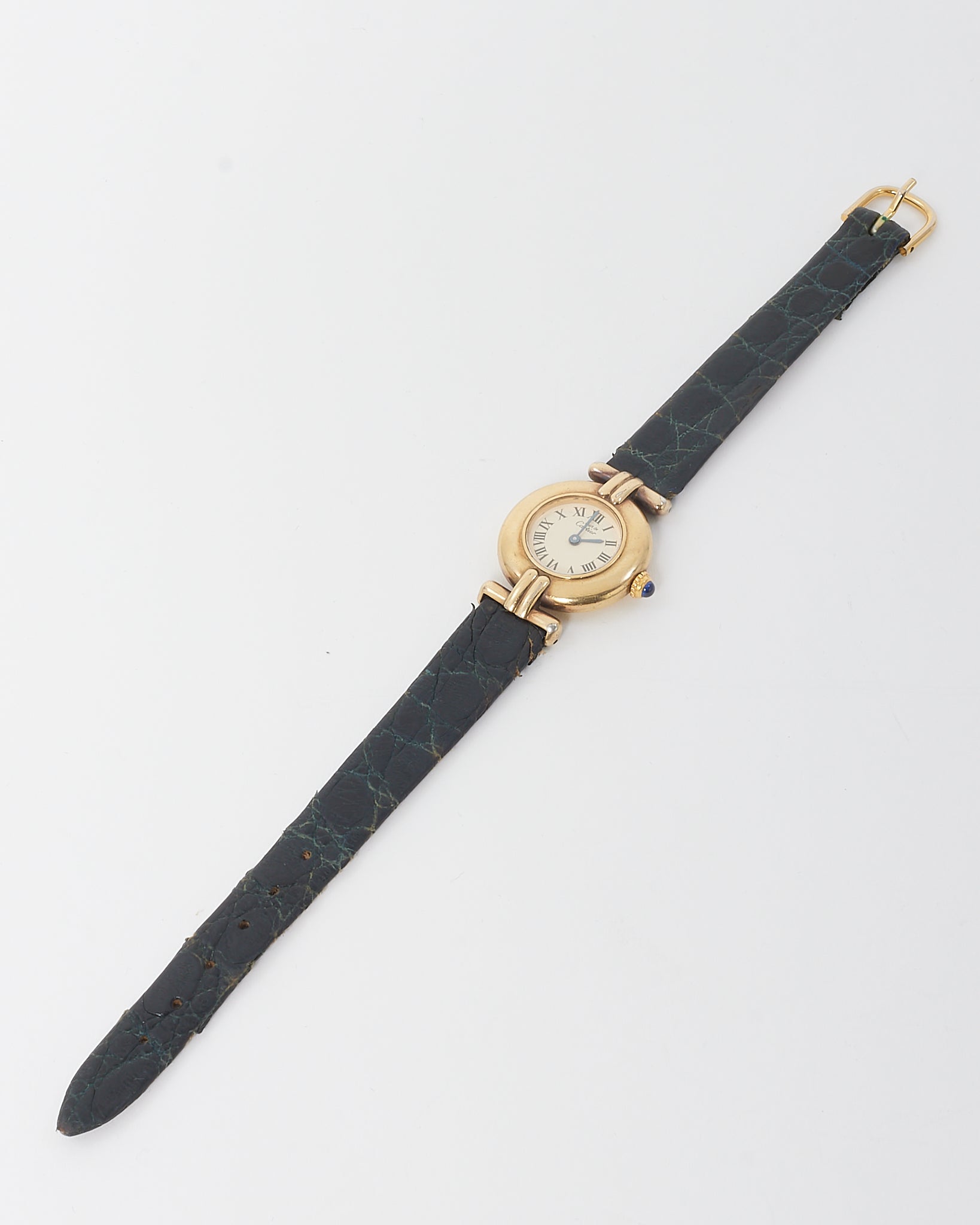 Make a refined statement with this pre-loved authentic Cartier Vintage Must Gold Vermeil Black Croc Embossed Leather Colisée Watch. Showcasing the timeless elegance of Cartier’s vintage design, this piece features a gold vermeil round case paired with a classic black croc-embossed leather strap. The minimalist ivory dial is accented with black Roman numerals and blue steel hands, a signature touch of the Maison. Perfect for elevating any look, this watch combines old-world luxury with understated sophistication, ideal for collectors and those who appreciate iconic heritage pieces.