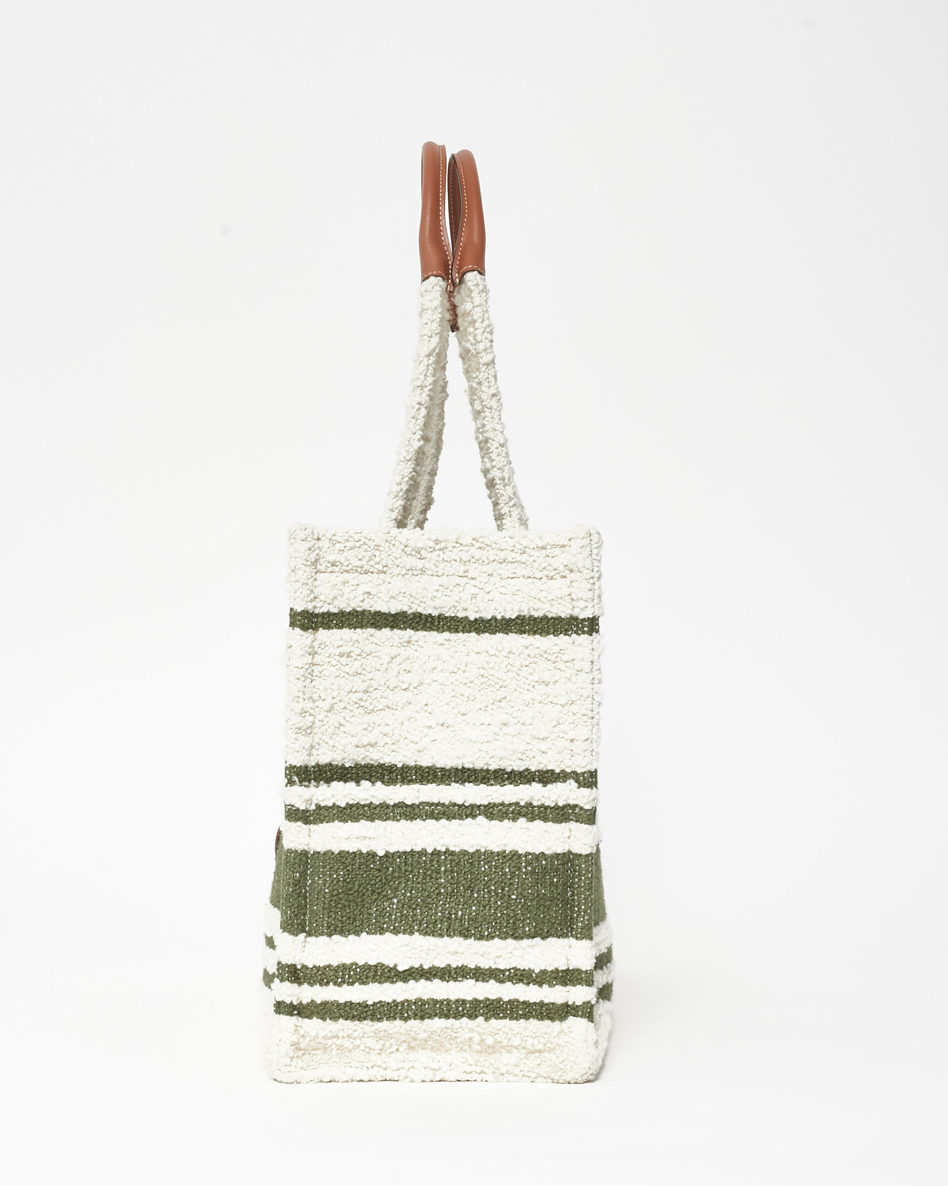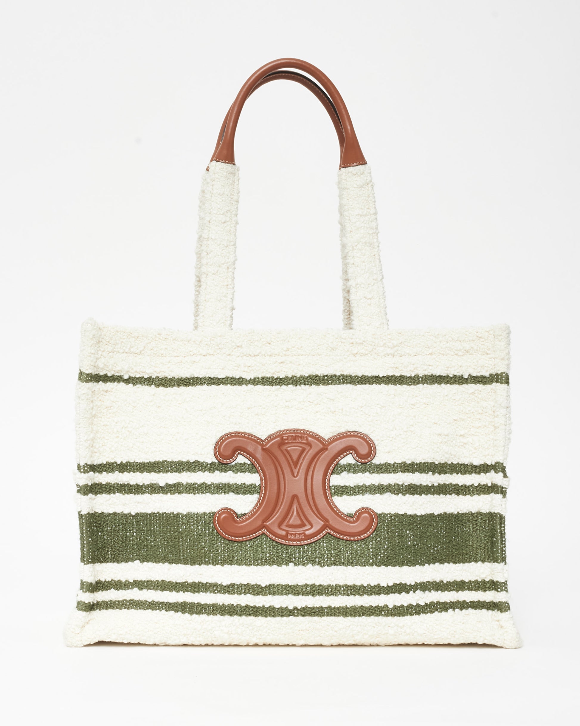 This authentic pre-owned Celine Ivory & Green Shearling Tote with the iconic Triomphe leather logo is a unique blend of luxury and casual elegance. Crafted from soft ivory shearling with green stripes, this tote features a standout brown leather Triomphe logo on the front, adding a touch of sophistication. The design includes sturdy leather handles, making it comfortable for shoulder or hand carry, and its spacious interior is perfect for everyday essentials. Shop pre-owned authentic Celine at Retyche.