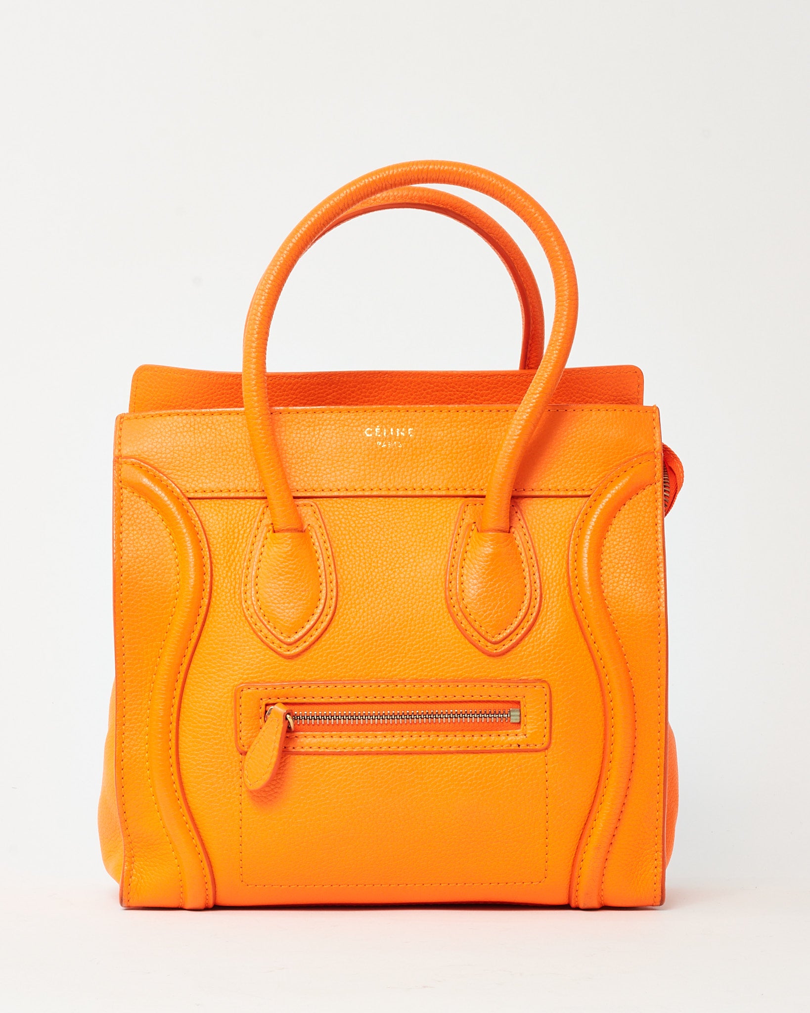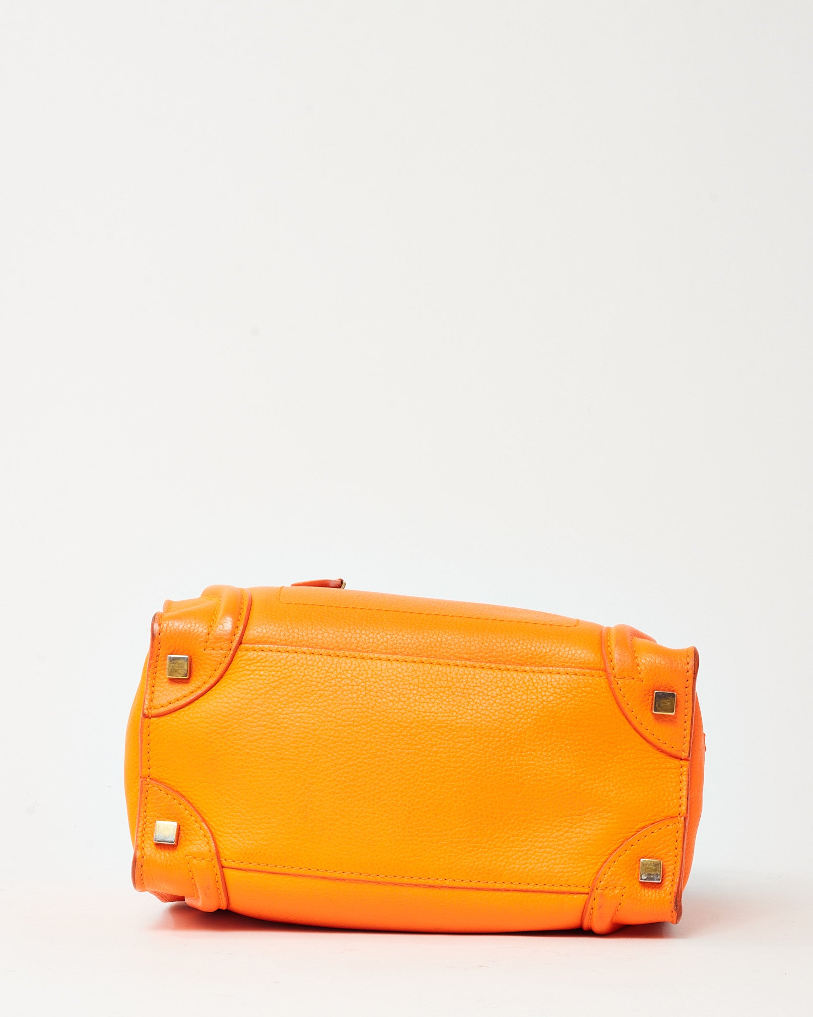 Audacieux et iconique, ce sac cabas Celine Mini Luggage d'occasion est confectionné en cuir grainé orange vif avec le panneau avant incurvé emblématique et la silhouette ailée. Fini avec des poignées roulées, une poche zippée à l'avant et un intérieur ouvert structuré, il allie fonctionnalité et attrait haute couture.