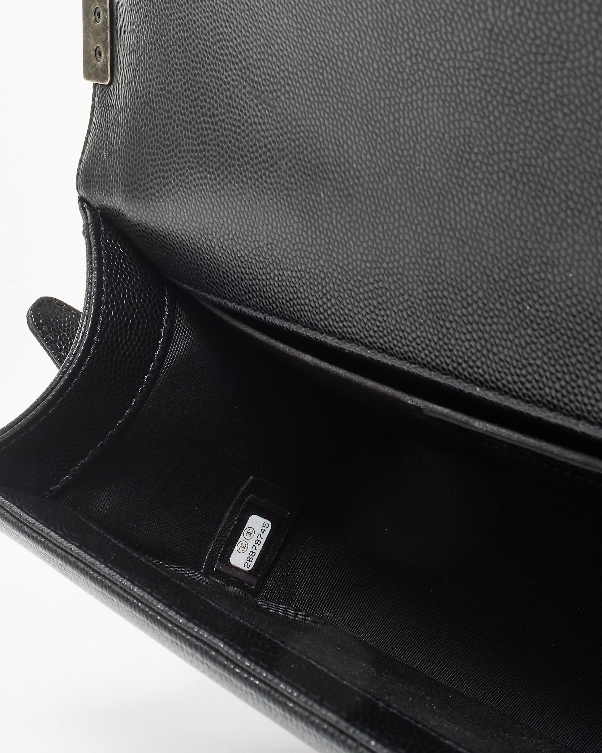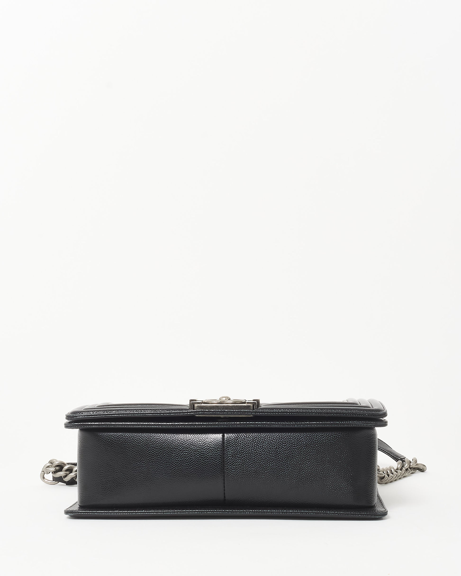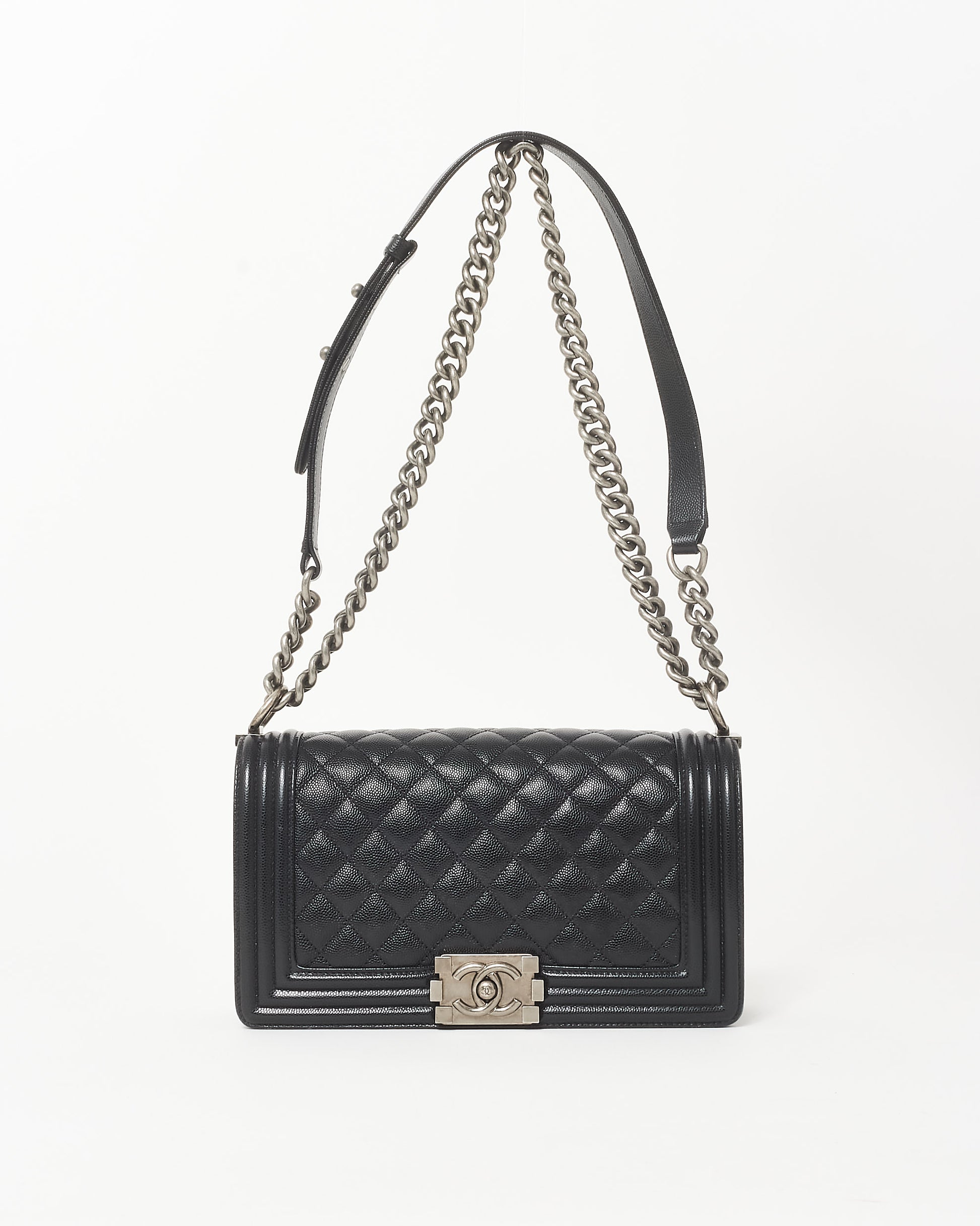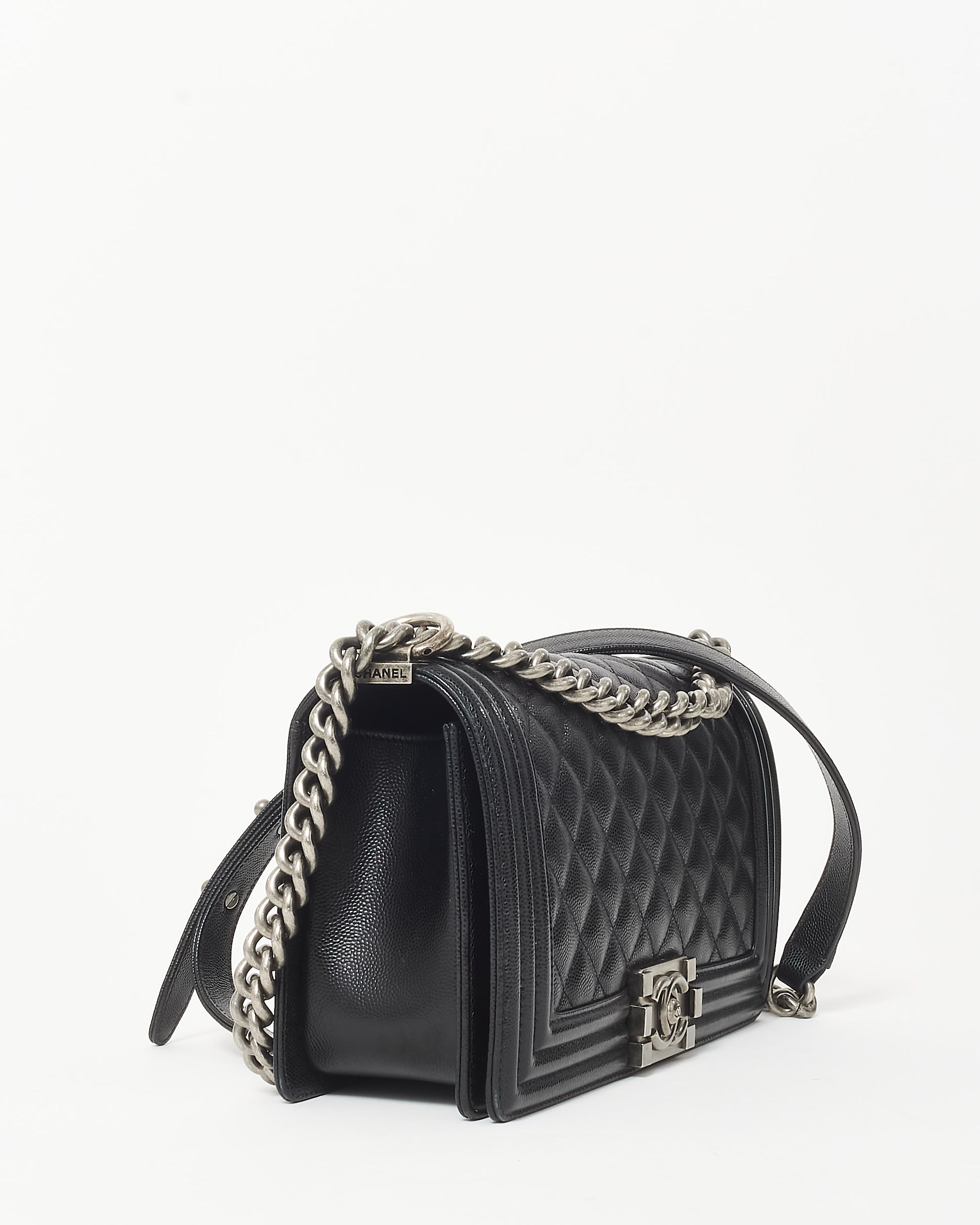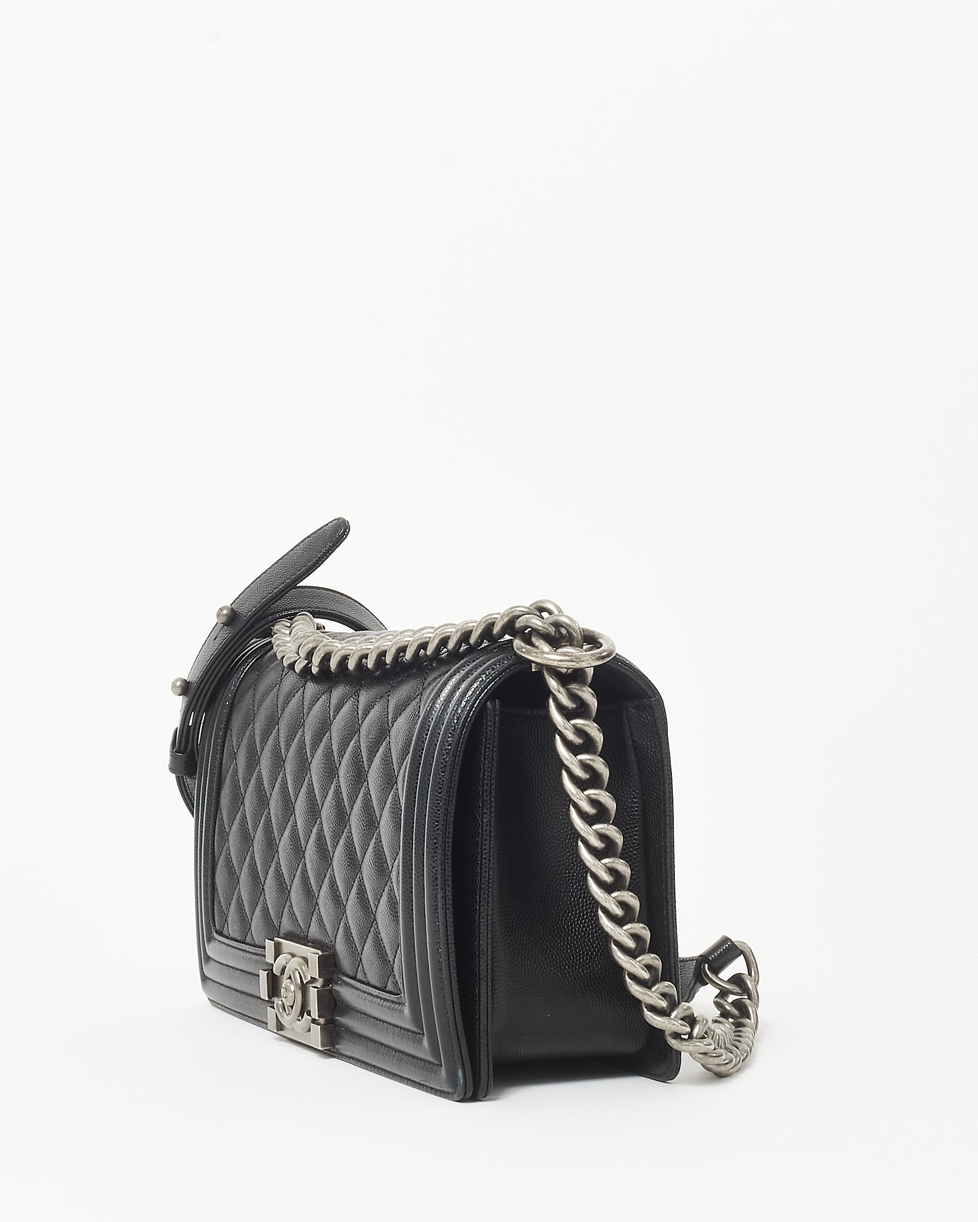 Explore this pre-owned authentic Chanel Black Caviar Quilted Old Medium Boy Bag with antiqued silver-tone hardware. This shoulder bag is crafted in black caviar leather. The bag features an aged silver chain shoulder strap with a leather shoulder pad, a diamond quilted crossover flap with a linear quilted border, and an aged silver boy CC push lock. This opens to a black fabric interior with a patch pocket. Shop pre-owned authentic Chanel handbags at Retyche.