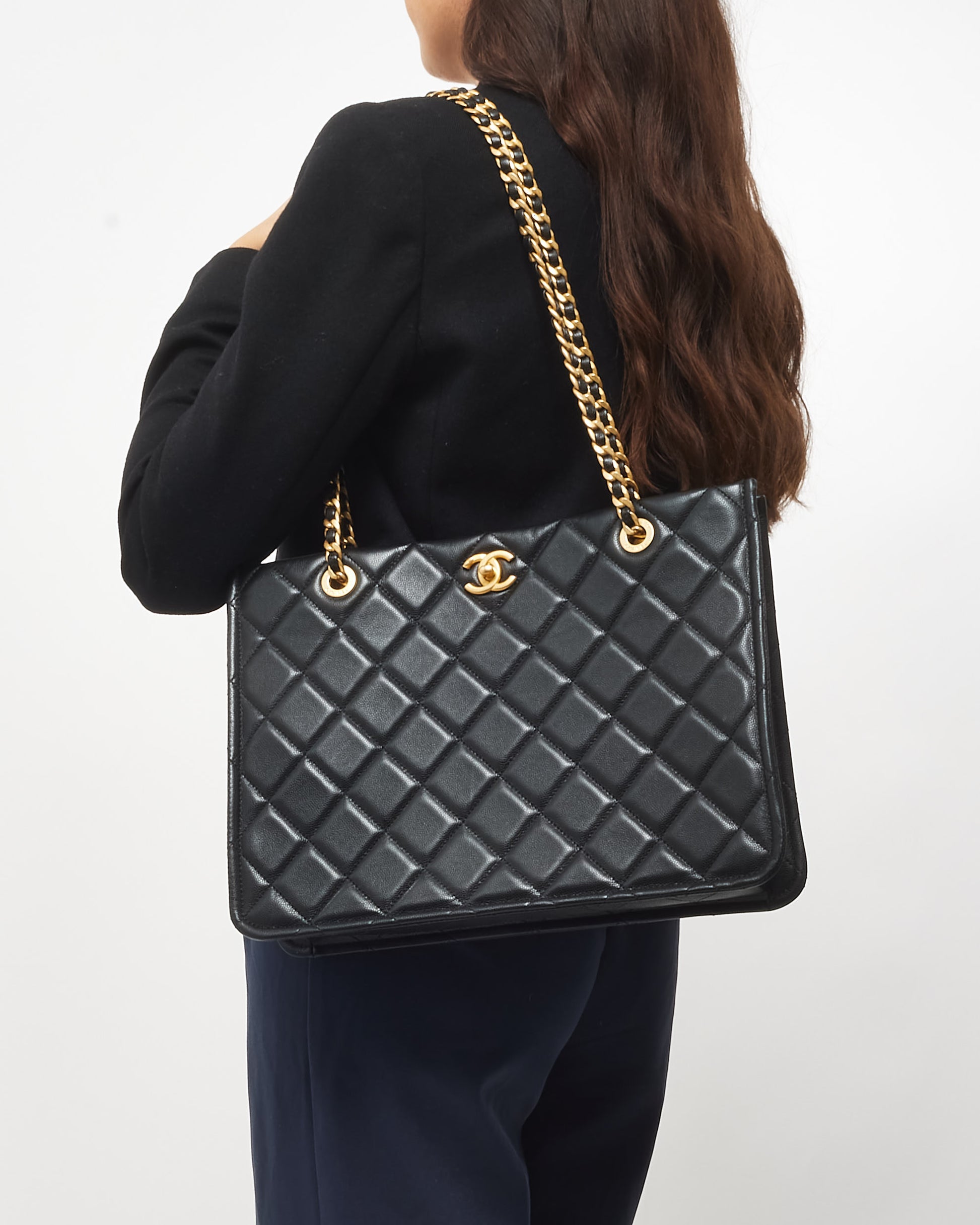 Accented with gleaming gold-tone hardware, including the iconic interlocking CC logo, this spacious tote is designed for both function and style. The dual leather-and-chain handles provide comfortable shoulder wear, while the roomy interior offers ample space for all your daily essentials.
