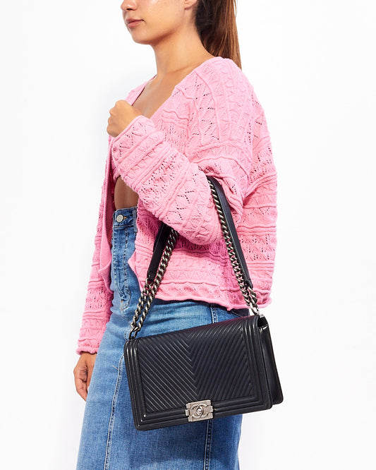 Grand sac garçon en cuir d'agneau à chevrons noir
