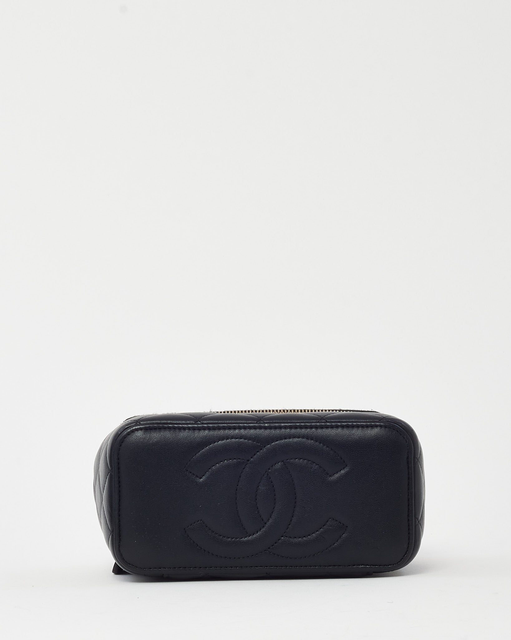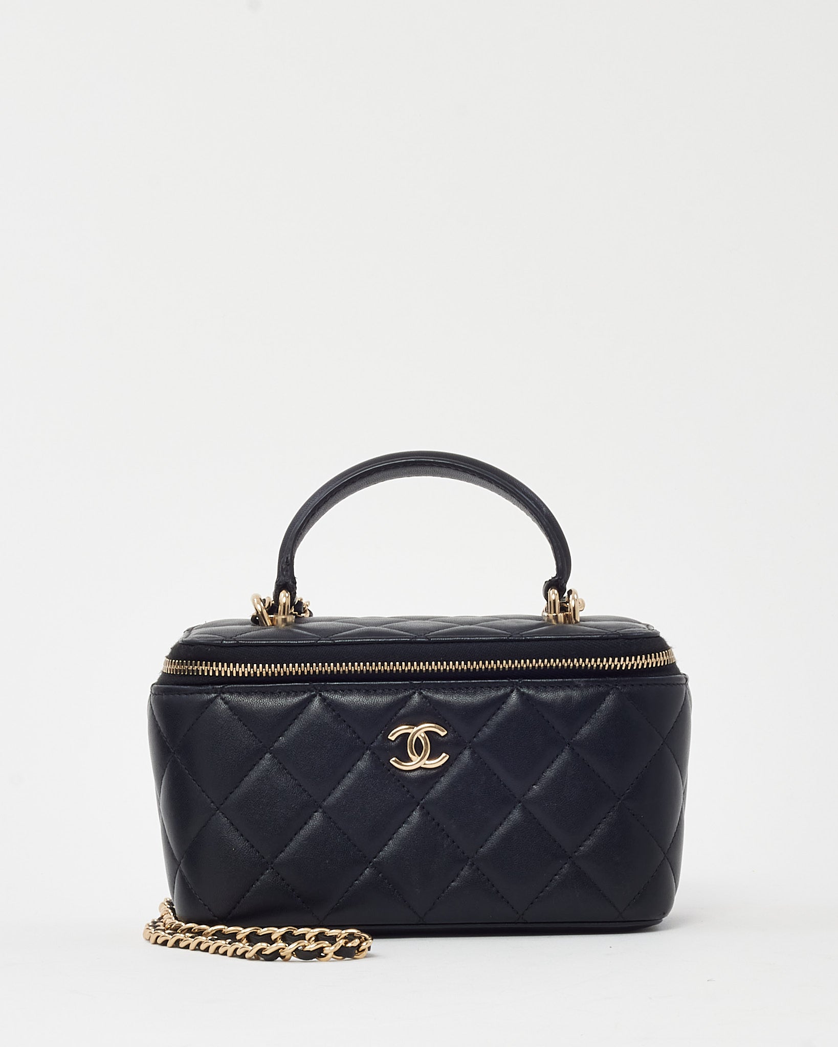 Elevate your accessory game with this pre-loved authentic Chanel Black Lambskin Leather Top Handle Chain Vanity Bag with gold hardware. Crafted from supple quilted lambskin, this compact yet chic silhouette features a structured top handle and signature leather-interwoven chain strap for versatile wear. The gold-tone CC logo charm adds a touch of timeless elegance, while the zip-around closure opens to a practical interior for your essentials. A refined blend of function and fashion, perfect for day-to-night transitions.