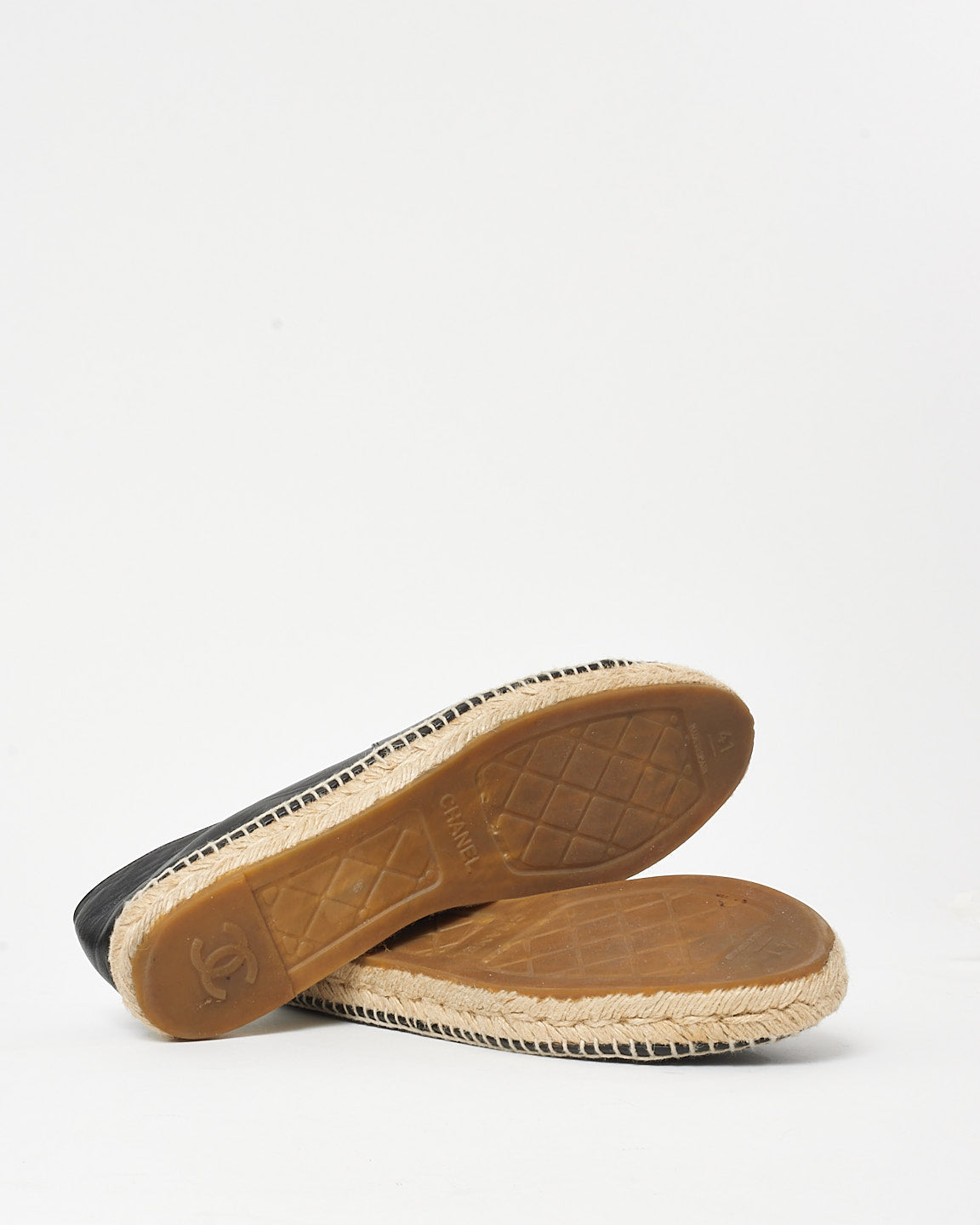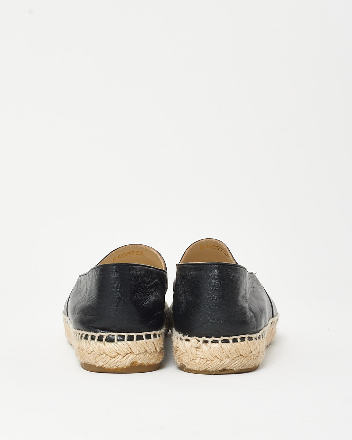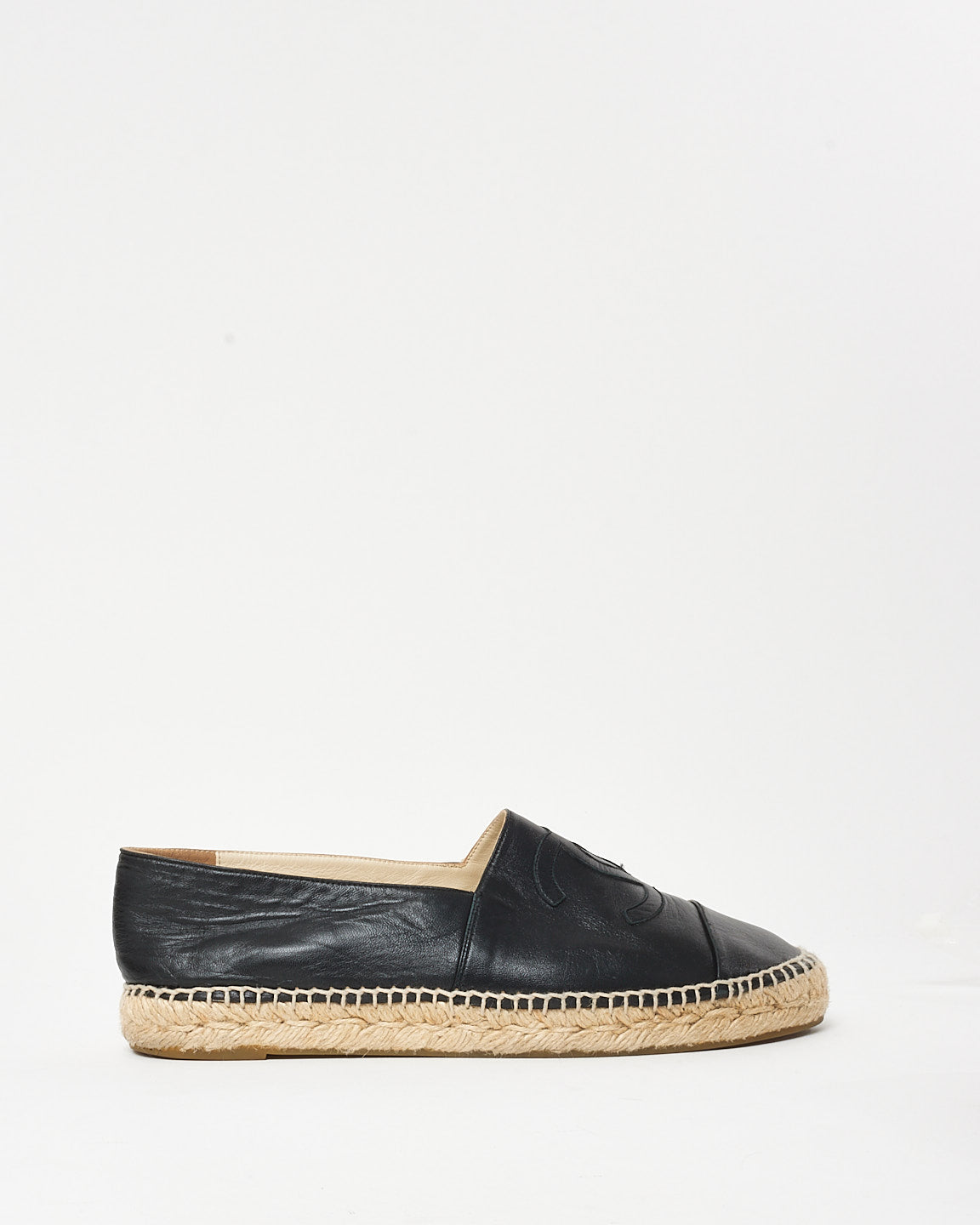 Elevate your off-duty wardrobe with the pre-owned authentic Chanel Black Leather CC Logo Espadrilles—a staple of effortless Parisian style. Crafted from luxuriously soft black leather, these iconic flats feature a contrasting black cap toe and the signature interlocking CC logo stitched across the vamp, offering a look that’s equal parts relaxed and refined.