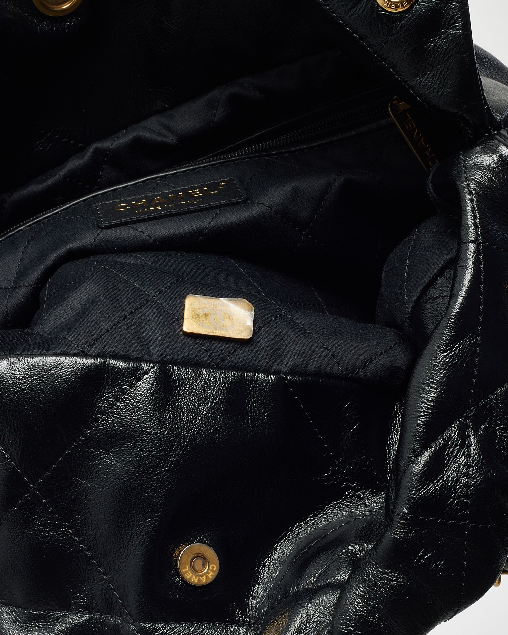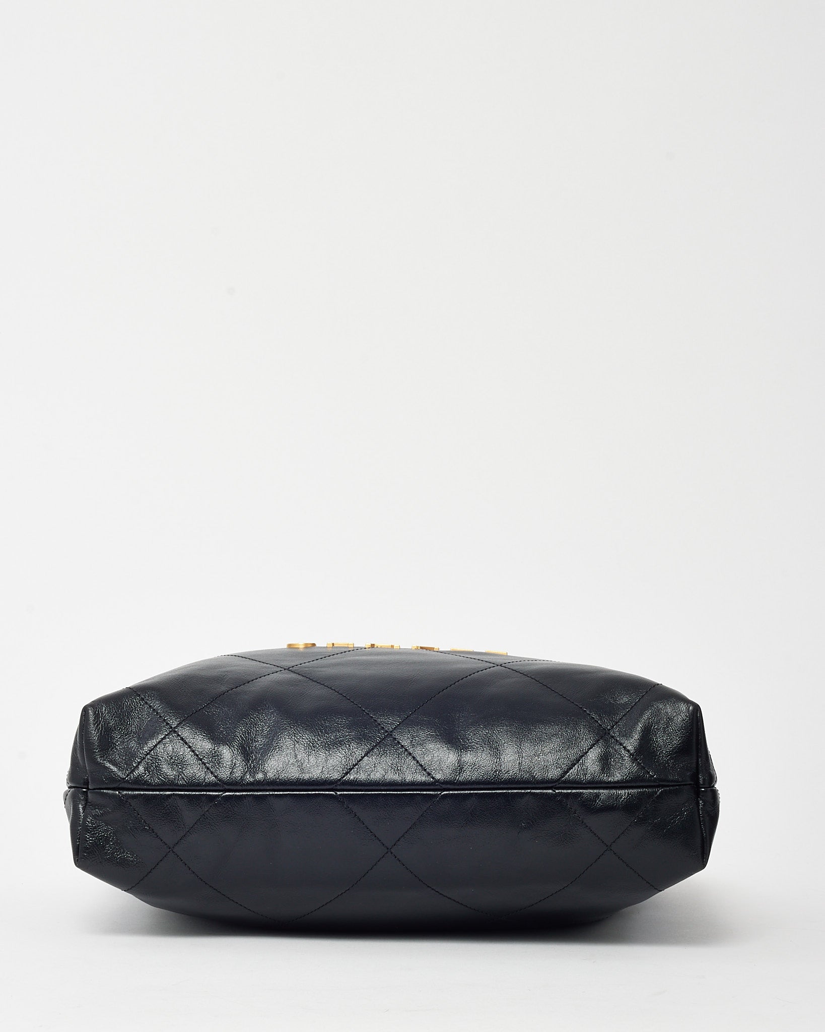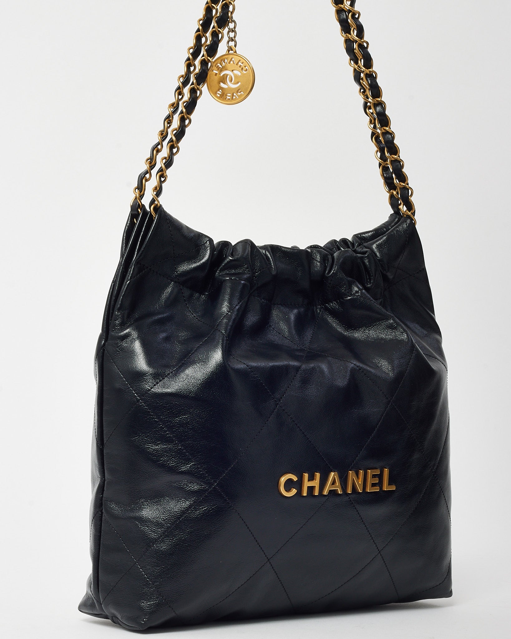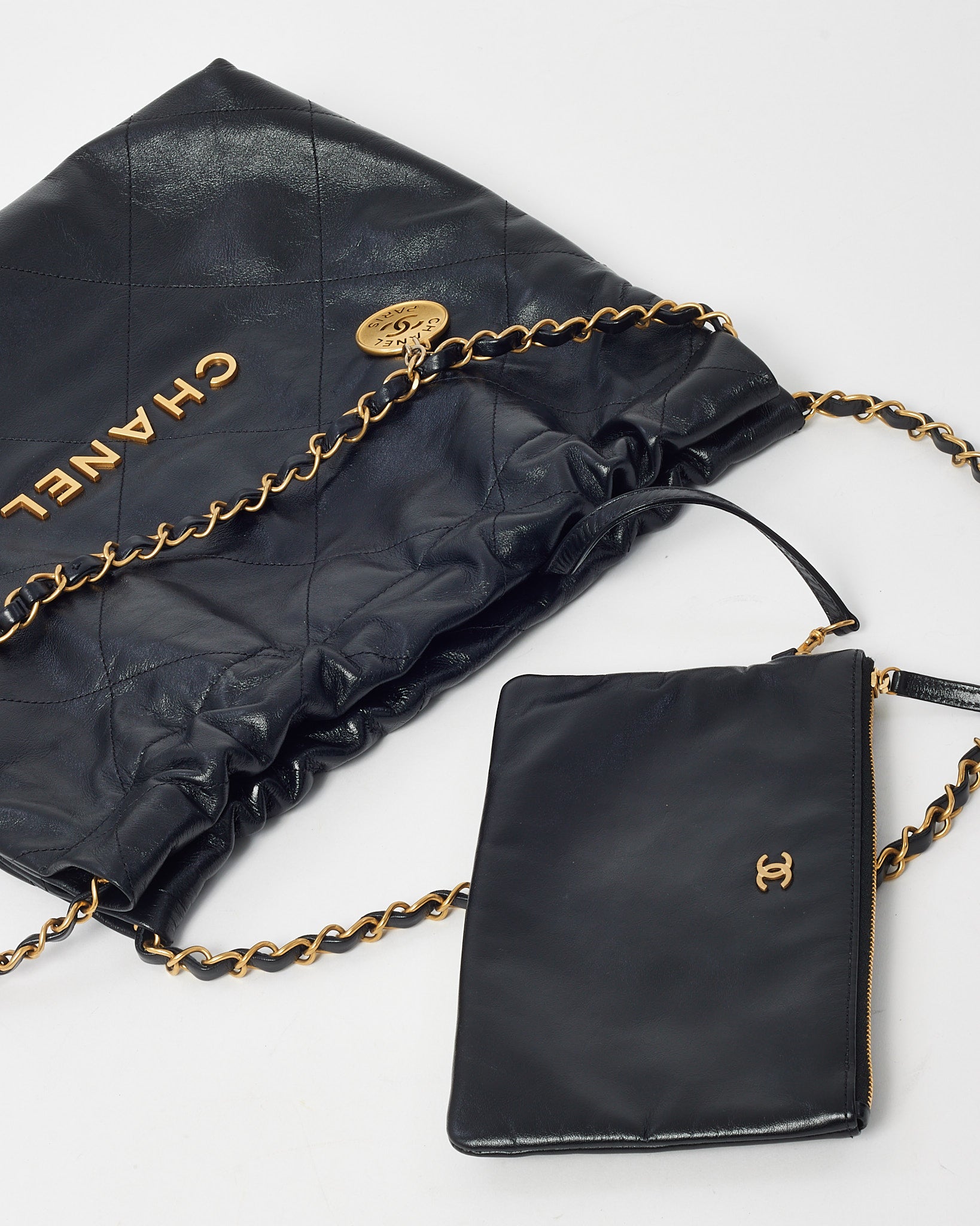 Make a bold yet effortless statement with this pre-loved authentic Chanel Black Shiny Quilted Calfskin Leather Chanel 22 Shoulder Bag with gold-tone hardware. Crafted from glossy, supple calfskin leather in Chanel’s signature diamond quilting, this modern silhouette combines relaxed elegance with iconic branding. The slouchy structure features a drawstring closure, an oversized CHANEL logo across the front, and a detachable pouch for added functionality. Finished with a leather-threaded chain shoulder strap and gold-tone accents, it’s the perfect companion for day-to-night luxury with a contemporary edge.