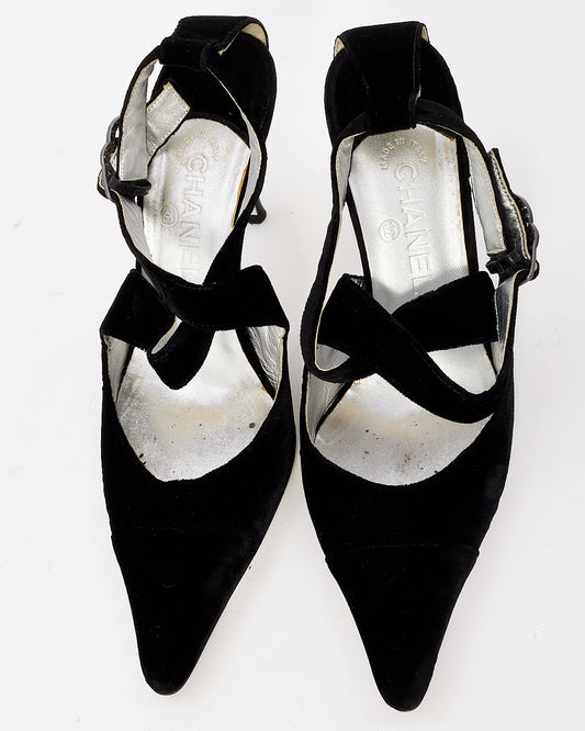 Escarpins à bout pointu avec logo en cristal CC en velours noir