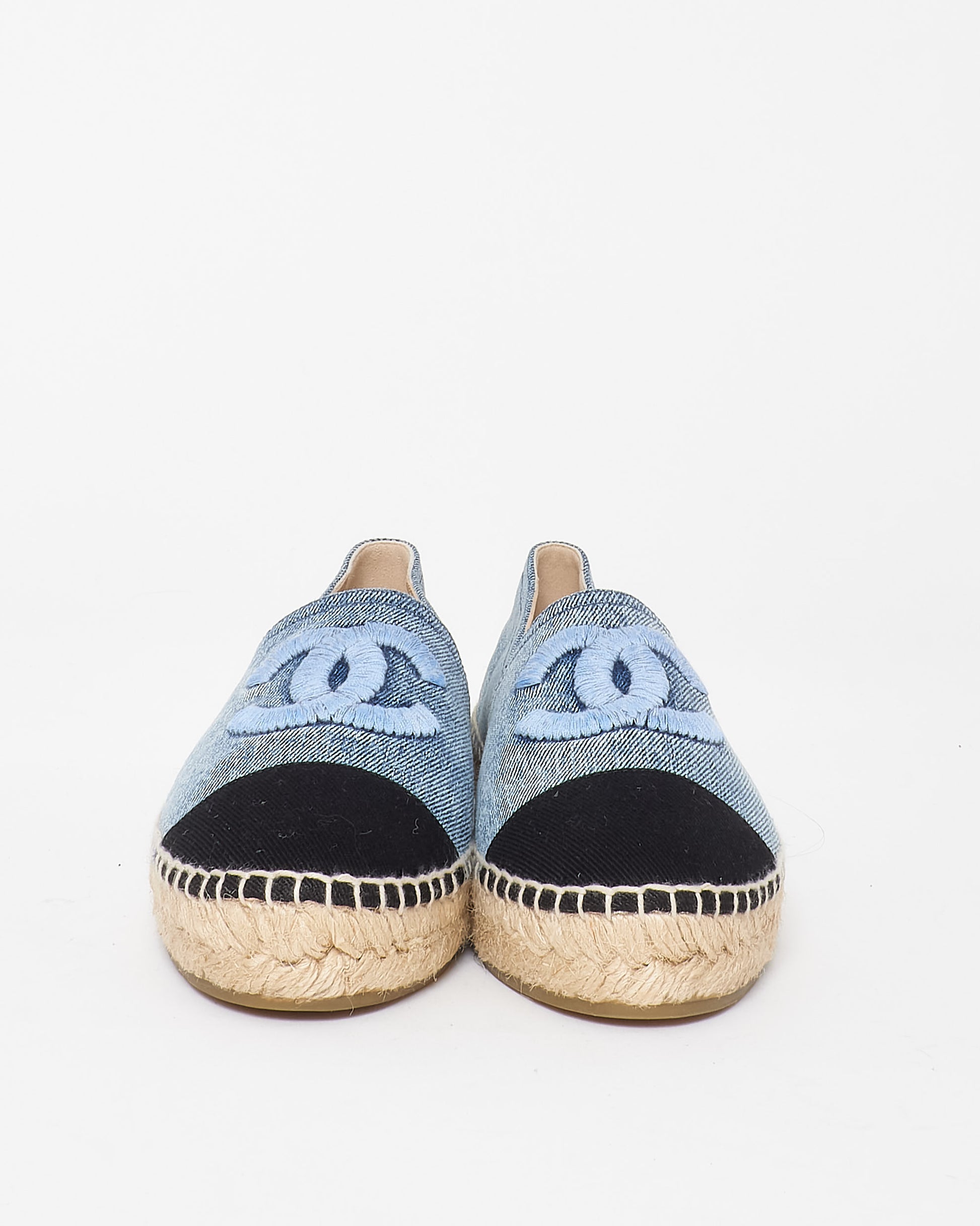 These authentic pre-owned authentic Chanel Blue Denim Logo Espadrilles in size 37 are a stylish and comfortable footwear choice, featuring blue denim uppers adorned with the iconic interlocking CC logo and a contrasting black cap toe. These espadrilles are known for their versatility, pairing well with various outfits for both casual and semi-formal occasion. Shop pre-owned authentic Chanel shoes at Retyche.