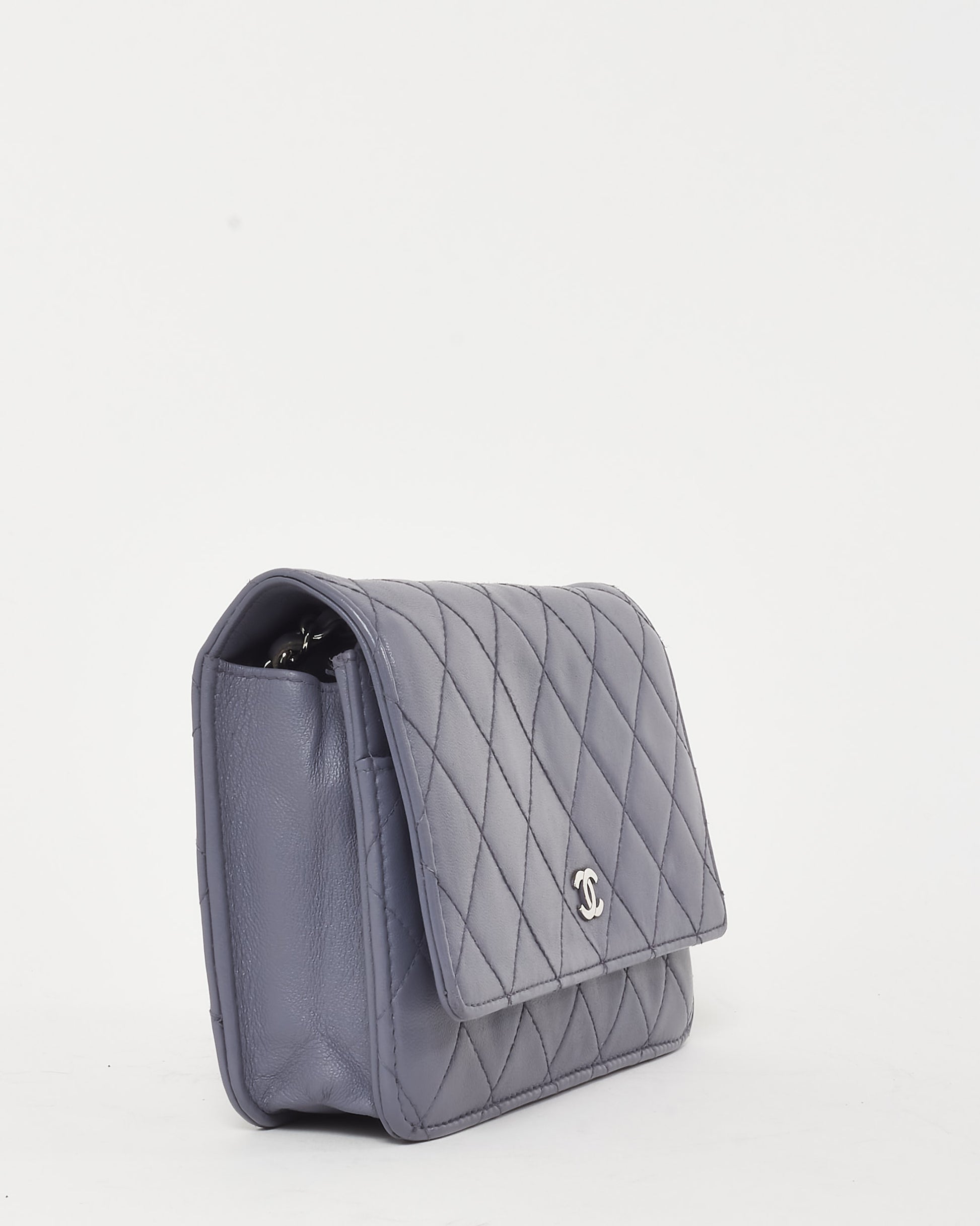 Understated and sophisticated, the pre-owned authentic Chanel Dark Lavender Purple Lambskin Leather Wallet on Chain (WOC) Crossbody is a timeless essential with modern versatility. Crafted from buttery soft grey lambskin leather, this elegant piece features the iconic CC logo on the front flap and silver-tone hardware for a sleek, polished finish.