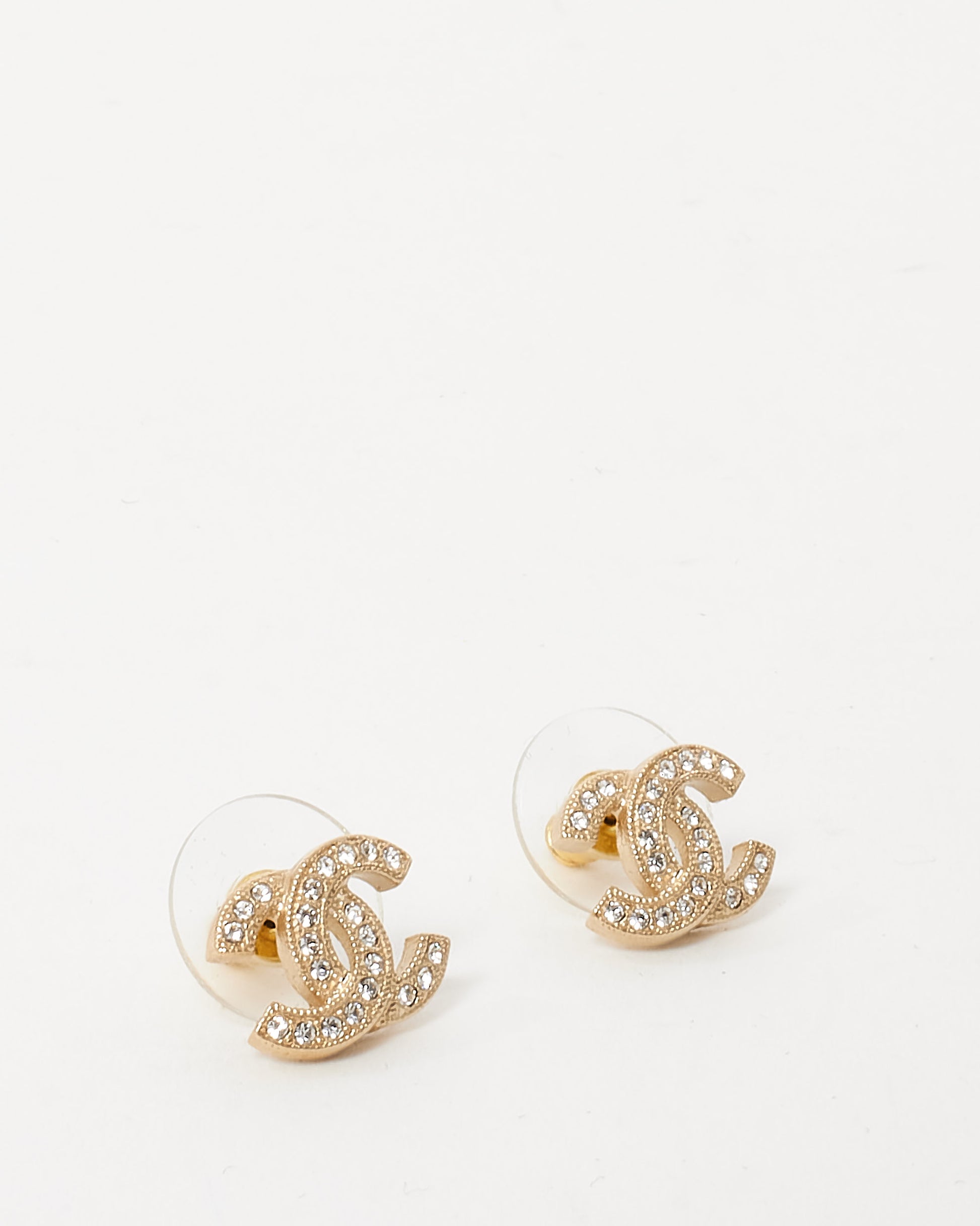 A dazzling take on a timeless classic, the pre-owned authentic 2022 Chanel Gold Crystal Studded Strass CC Logo Earrings add an elegant touch of sparkle to any ensemble. Crafted from gold-tone metal, these earrings feature Chanel’s iconic interlocking CC logo, beautifully adorned with glittering Strass crystals for a sophisticated and radiant finish.