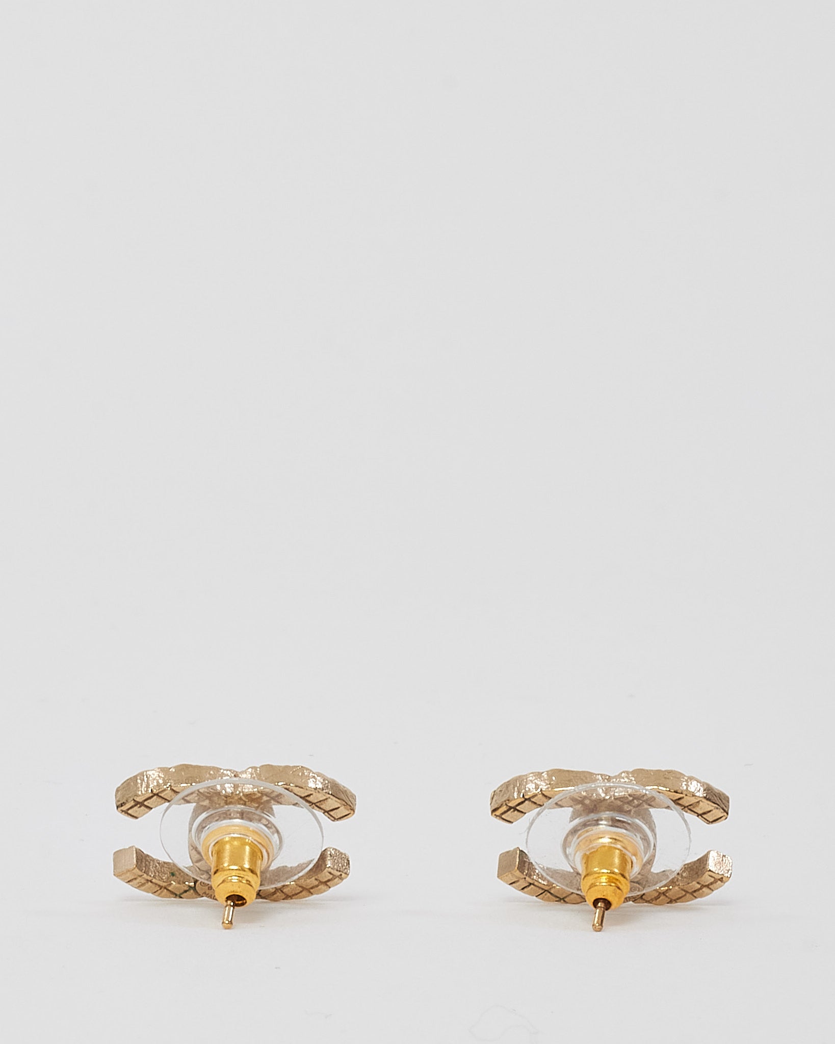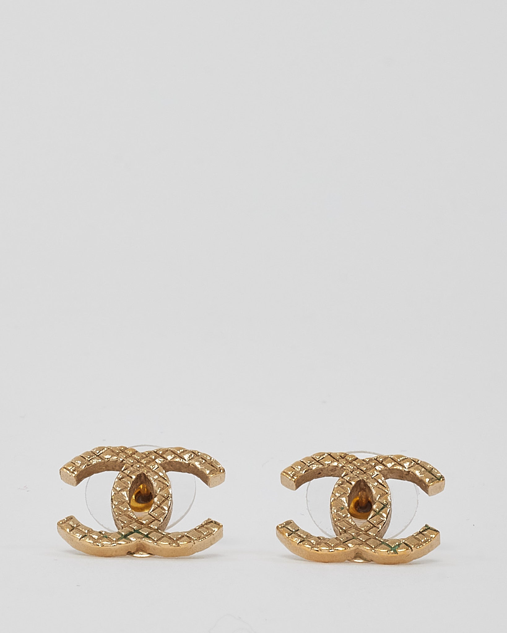 Embrace timeless elegance with these pre-loved authentic Chanel Gold Metal Textured CC Logo Earrings. Crafted from gold-tone metal with a subtly hammered texture, this classic pair showcases the iconic interlocking CC logo—instantly recognizable and eternally chic. The clip-on style offers comfortable wear, while the bold yet refined design adds vintage charm to both casual and elevated ensembles. A staple for any Chanel collector, these earrings deliver Parisian sophistication with a touch of statement shine.