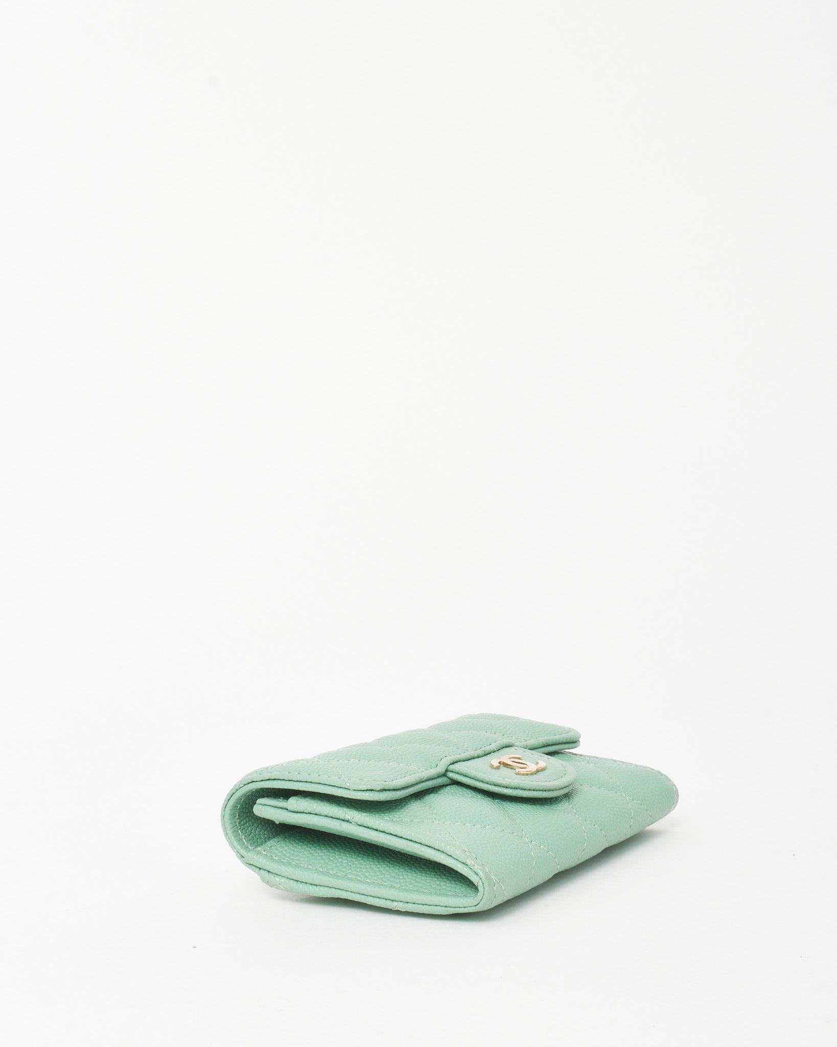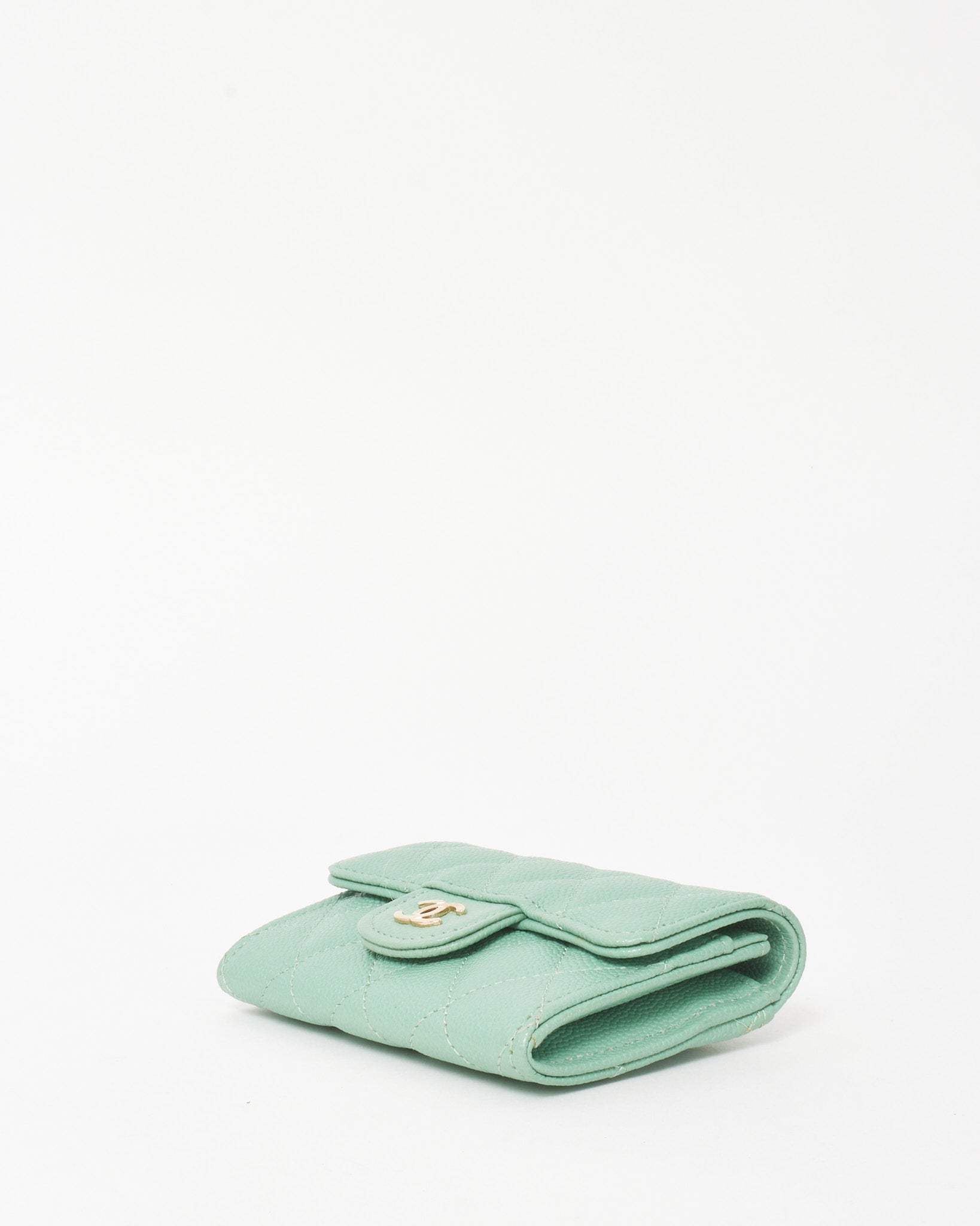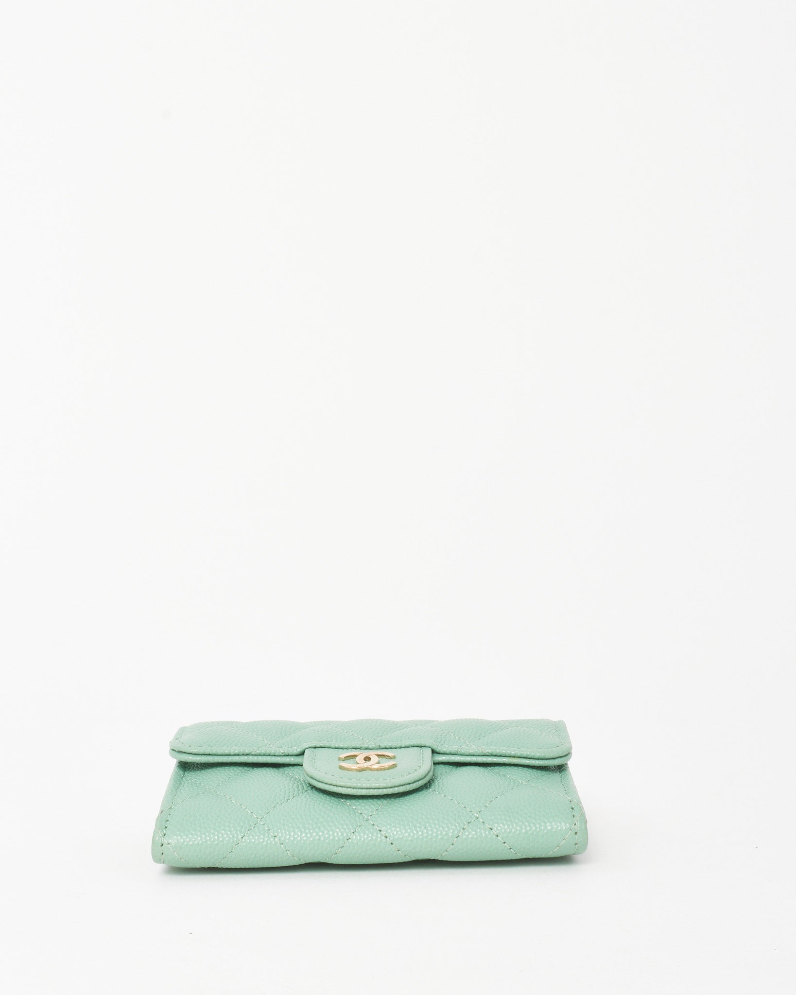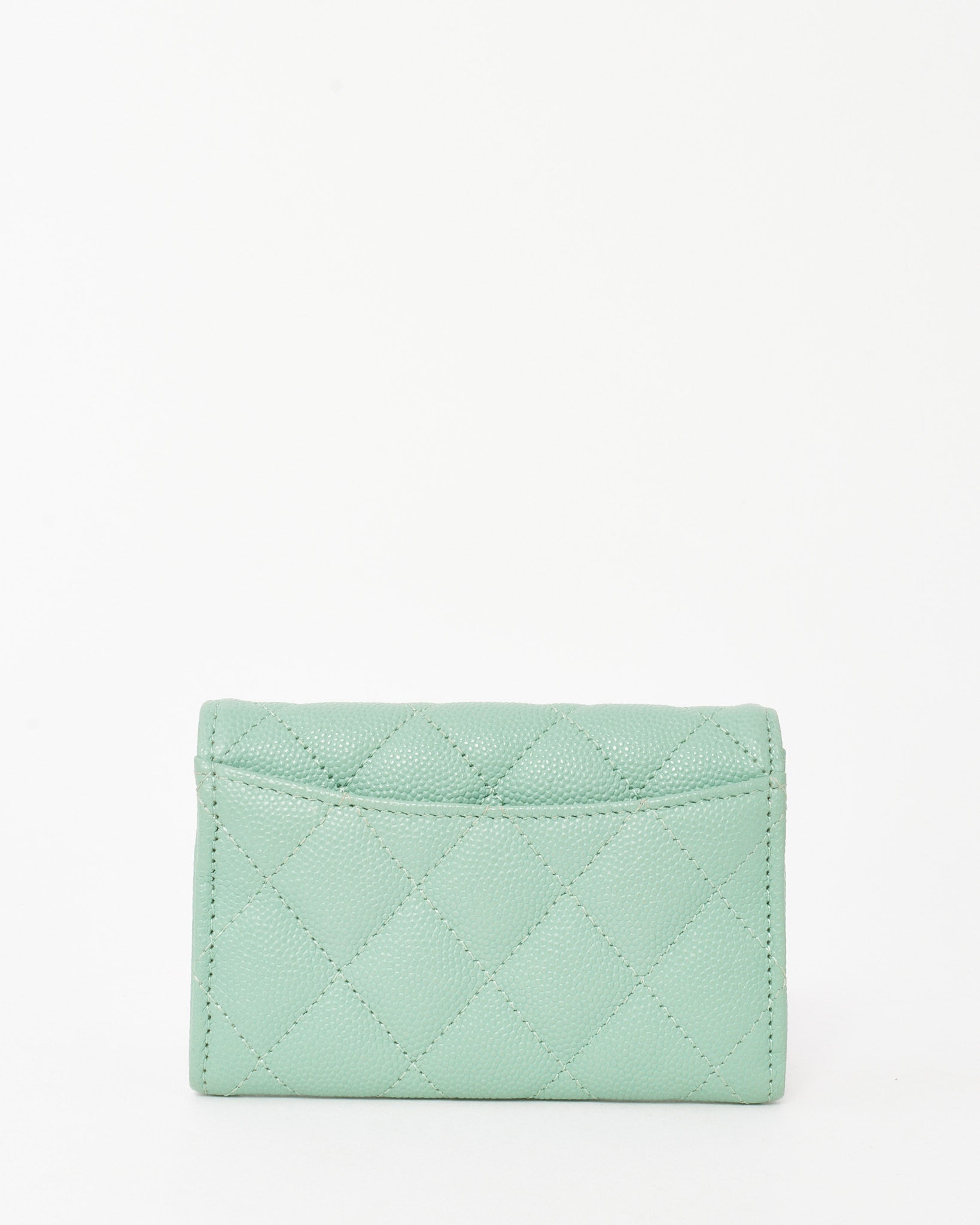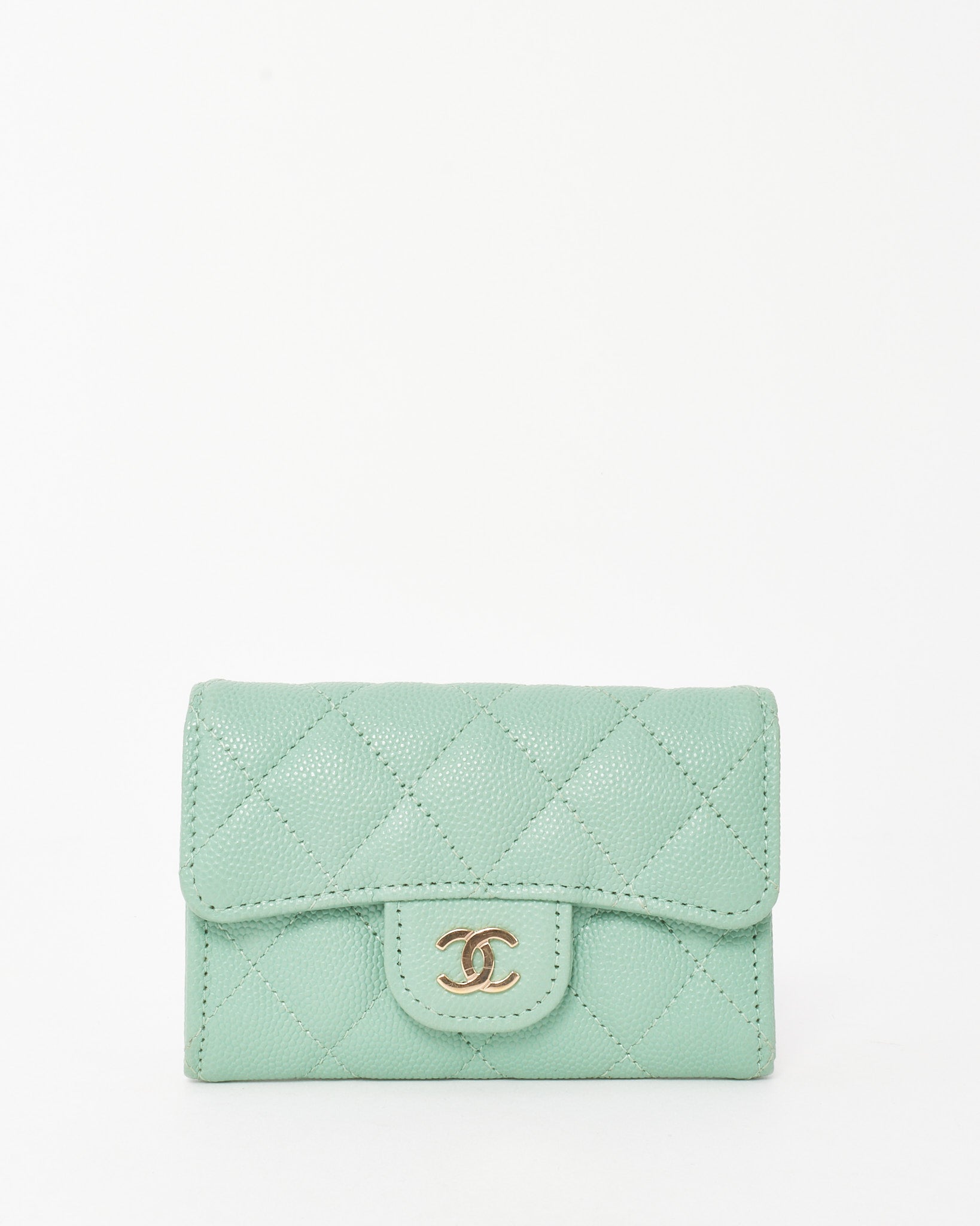 A refined blend of form and function, this pre-loved authentic Chanel Flap Card Case is crafted in mint green caviar leather and adorned with the house’s iconic CC logo. Compact yet practical, it features a snap-button flap closure and thoughtfully designed compartments for cards and essentials. A timeless accessory that brings a fresh pop of color to any luxury collection.