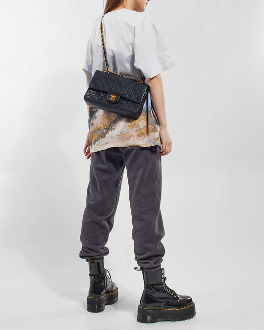 Sac à rabat moyen classique en cuir d'agneau noir vintage