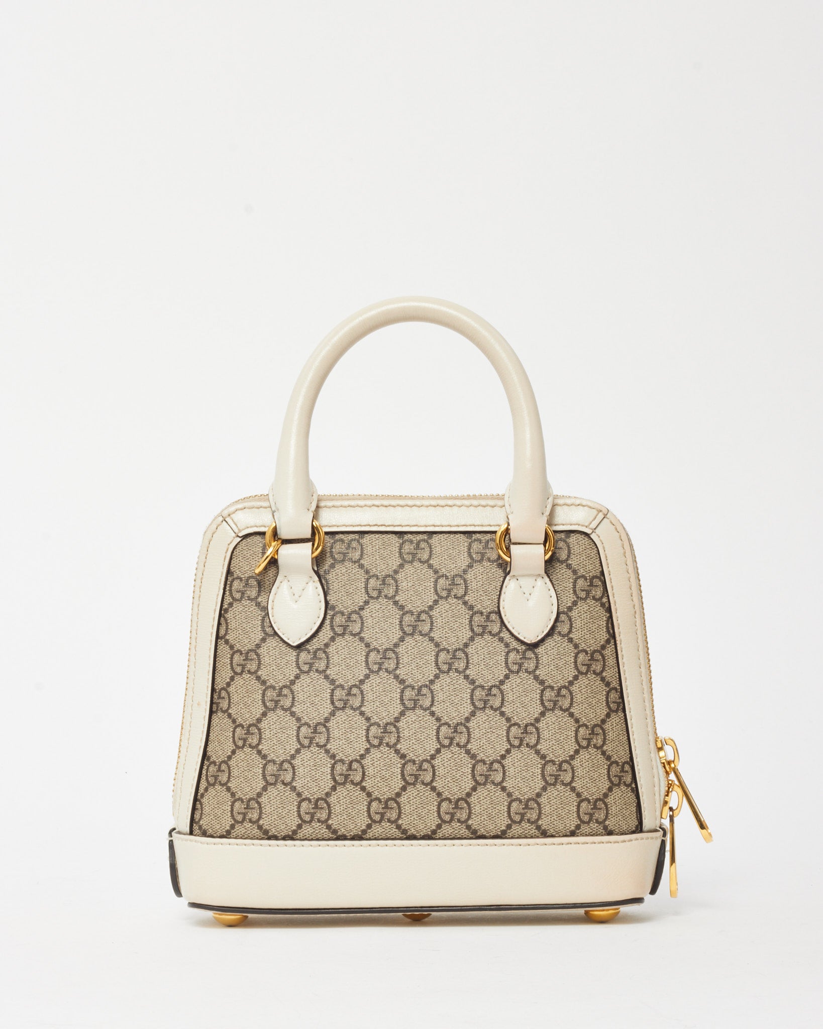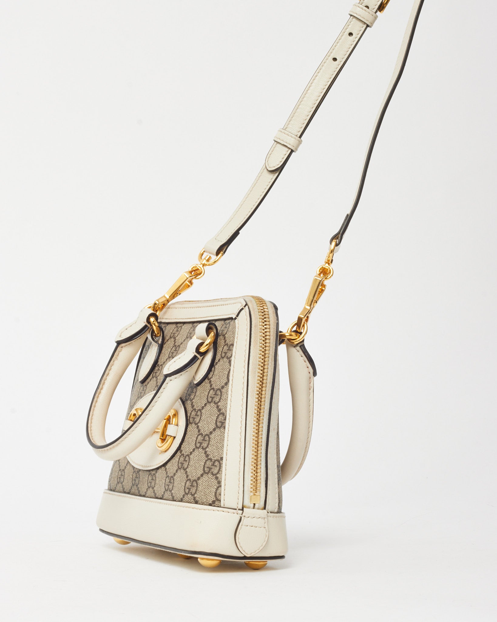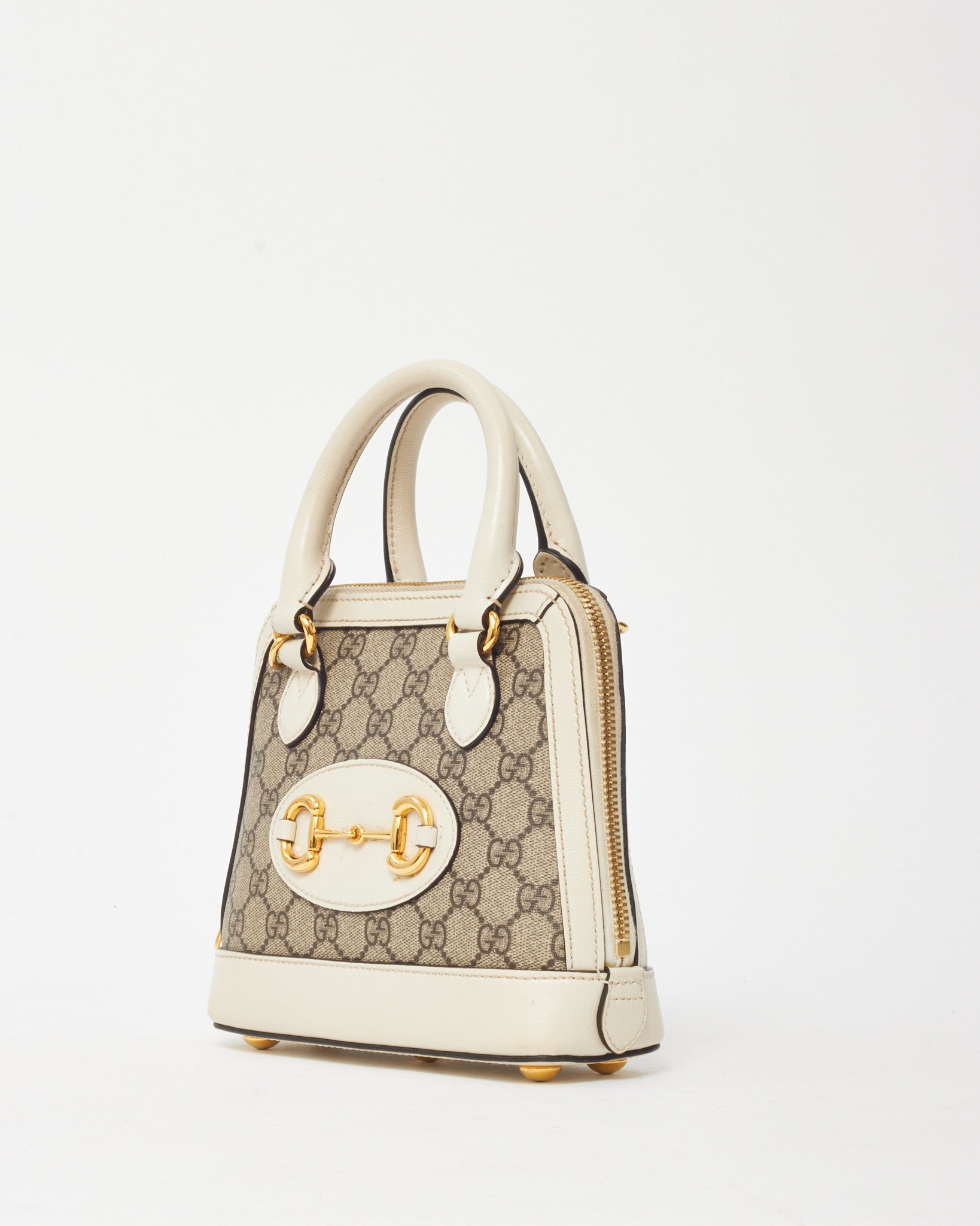 White and Beige GG Supreme Coated Canvas Mini Horsebit 1955 Top Handle Bag with Strap