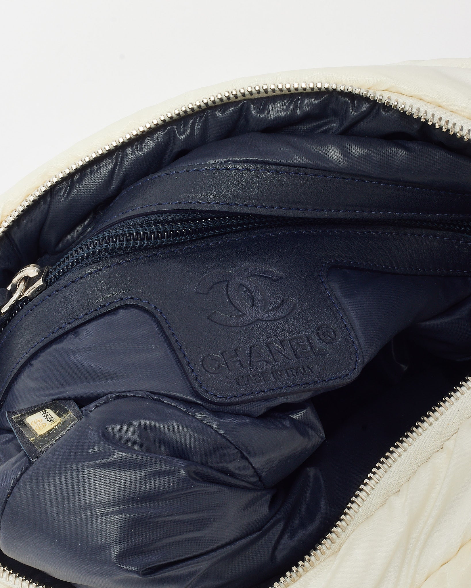 Sporty meets chic in this pre-loved authentic Chanel White Nylon Small Coco Cocoon Messenger Crossbody Bag. Crafted from lightweight, padded nylon with a modern sheen, this compact silhouette is accented with tonal stitching and a subtle CC logo for understated elegance. The adjustable shoulder strap allows for hands-free versatility, while the zip-top closure opens to a roomy interior ideal for daily essentials. Effortlessly cool and travel-ready, this piece brings a fresh, casual edge to classic Chanel style.
