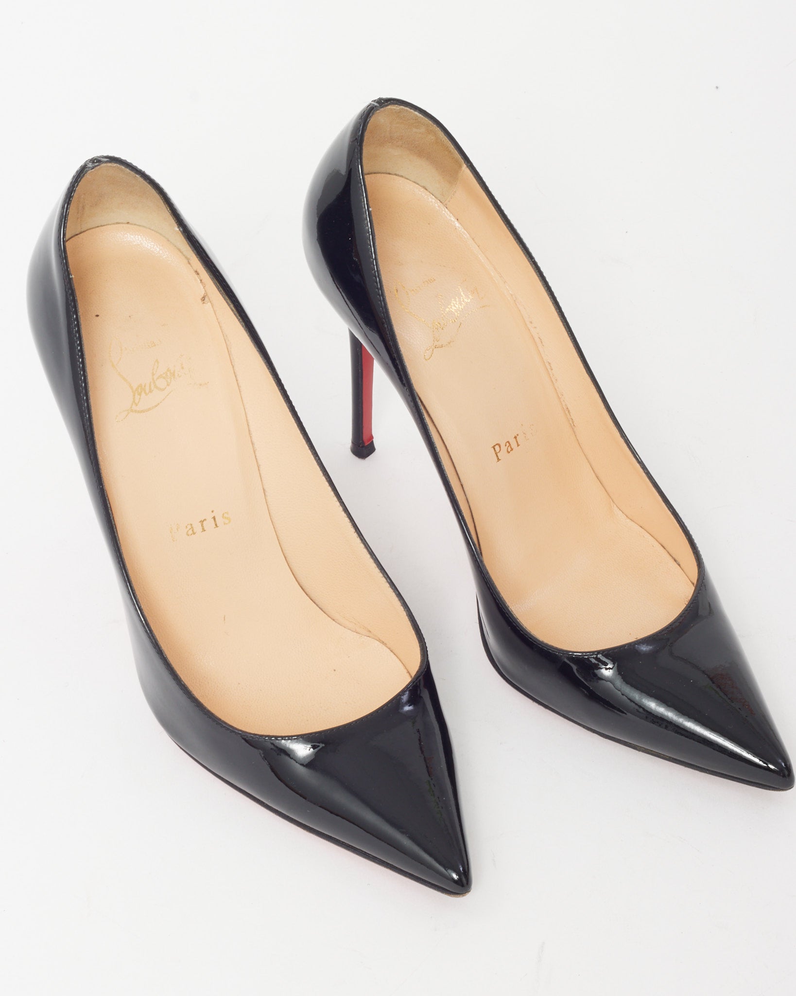 Seductive and timeless, these pre-loved authentic Christian Louboutin Black Patent Leather So Kate 100mm Pumps in size 35 are the ultimate statement of Parisian glamour. Crafted in glossy black patent leather, this iconic silhouette features a sharply pointed toe and stiletto heel that elongates the leg with striking elegance. The signature red lacquered sole adds a bold finishing touch, while the 100mm height offers a balance of drama and wearability. A coveted classic for evening wear, power dressing, or elevating everyday looks.
