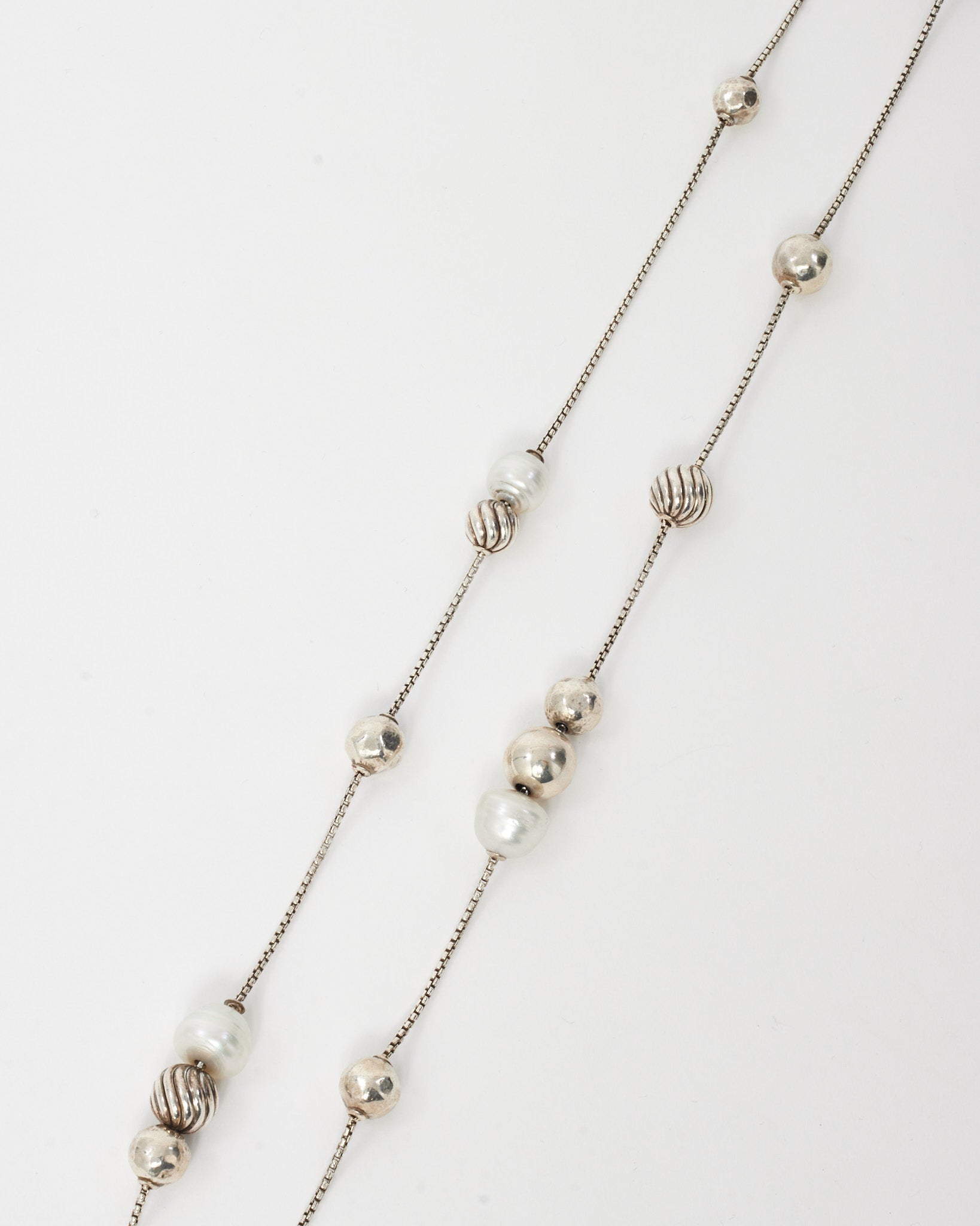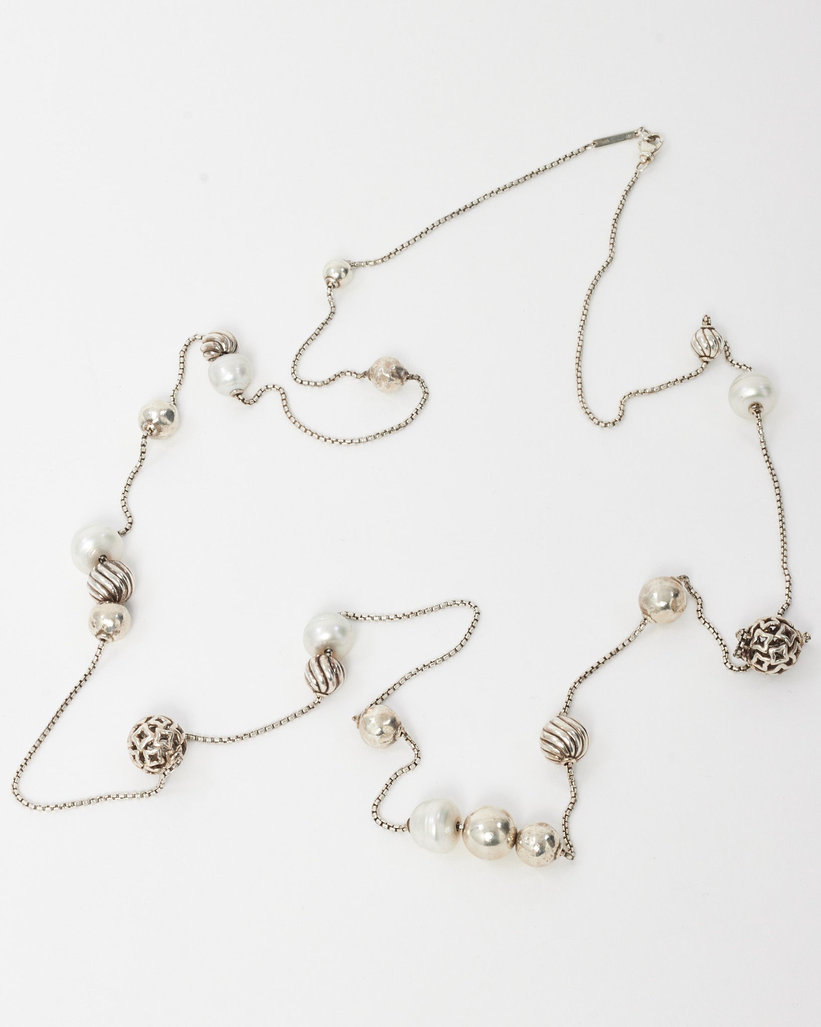 Sterling Silver Geometric Ball and Pearl Station Strand Necklace