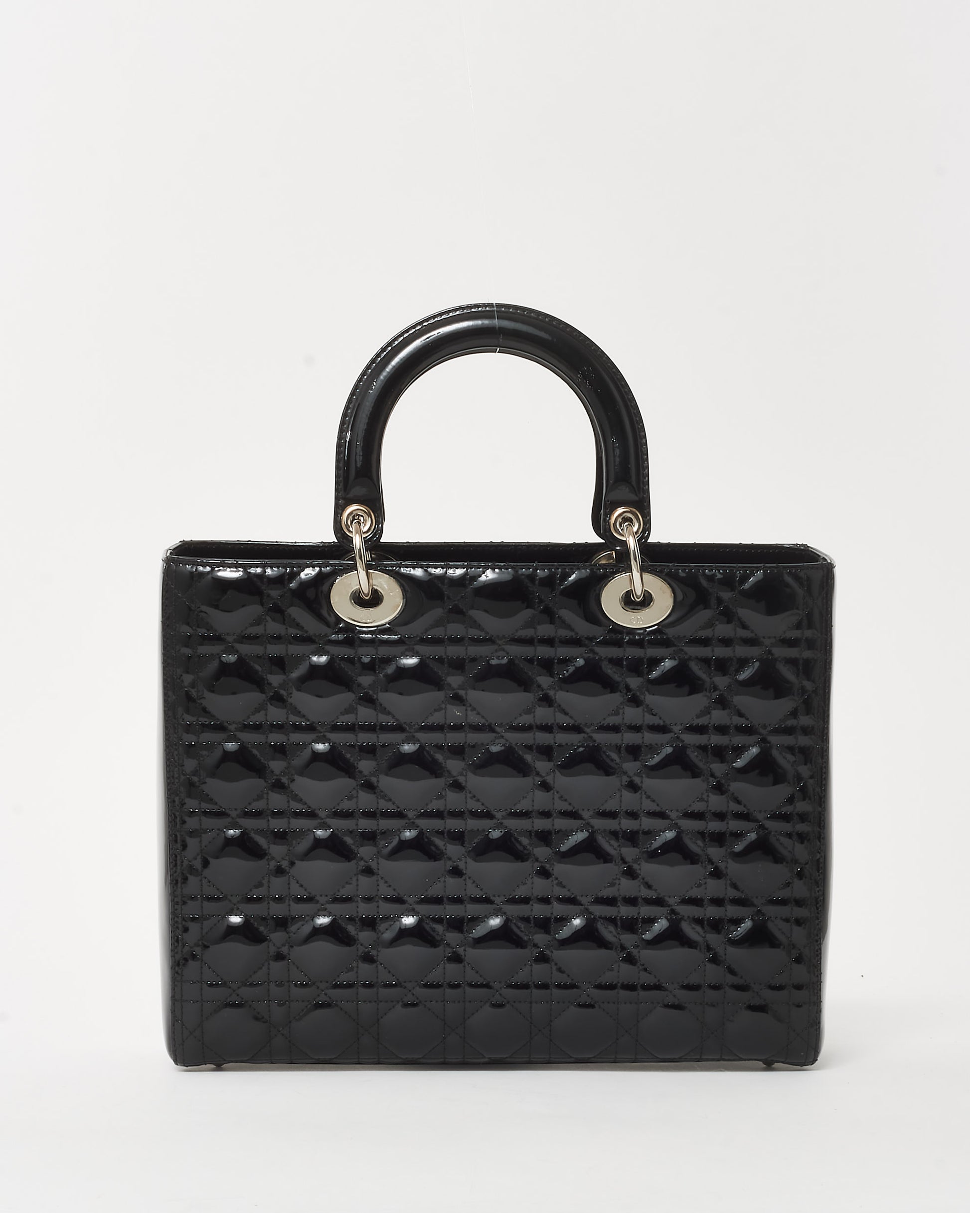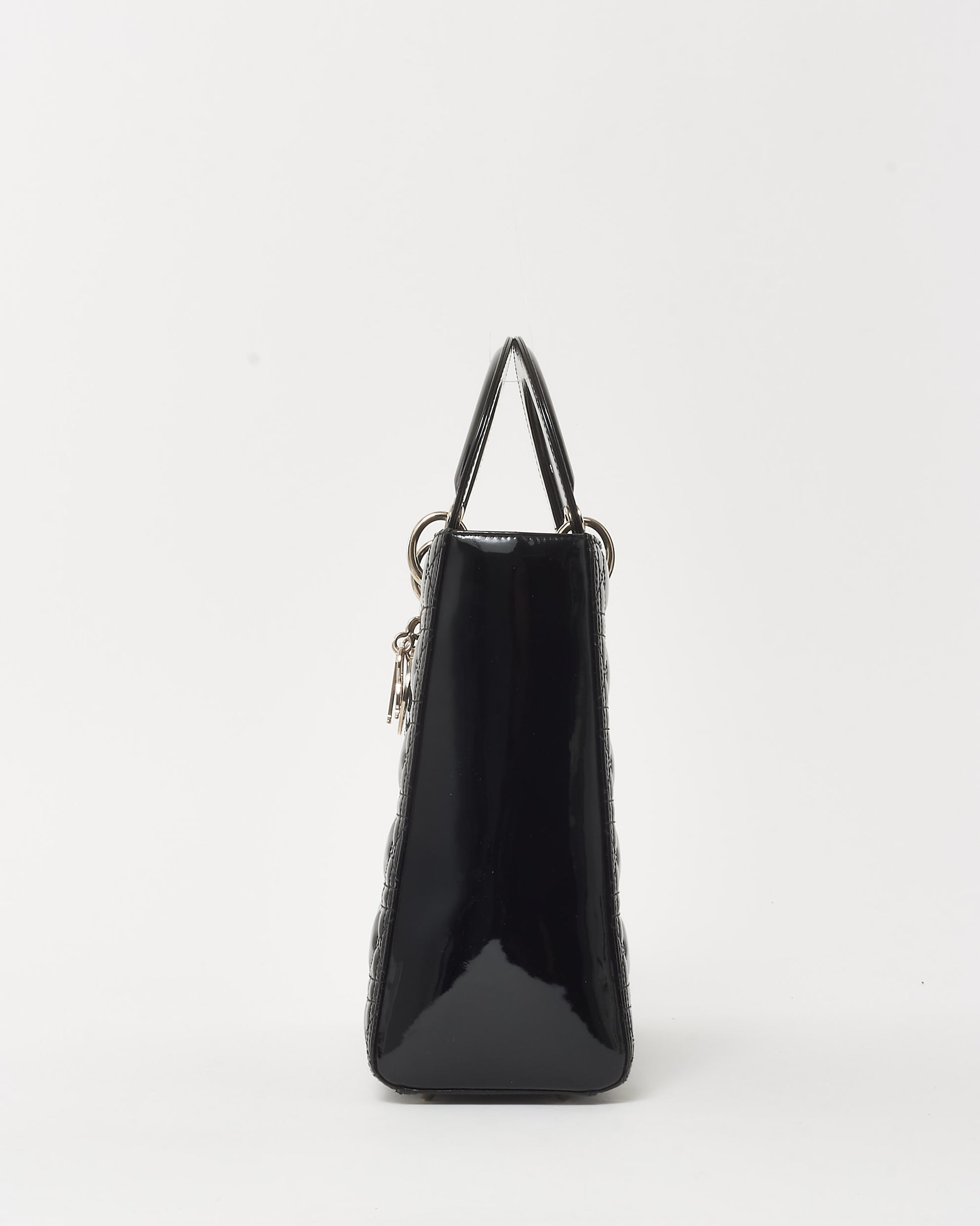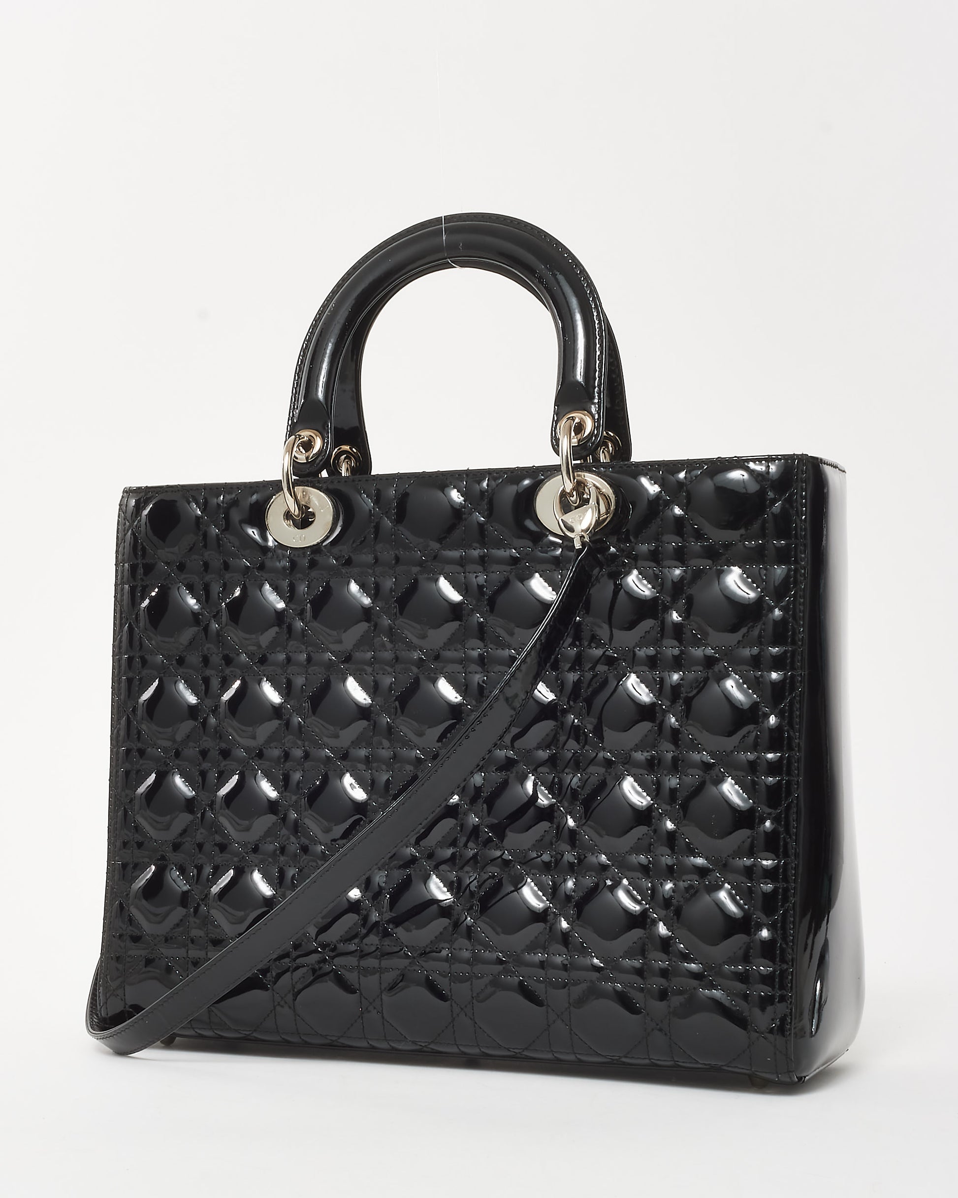 Timeless elegance with a bold finish, this pre-loved authentic Dior Large Lady Dior Tote is crafted from glossy black patent leather in the house’s iconic Cannage stitching. The structured silhouette is elevated by silver-tone hardware and signature ‘D.I.O.R.’ charms that add a touch of refined glamour.