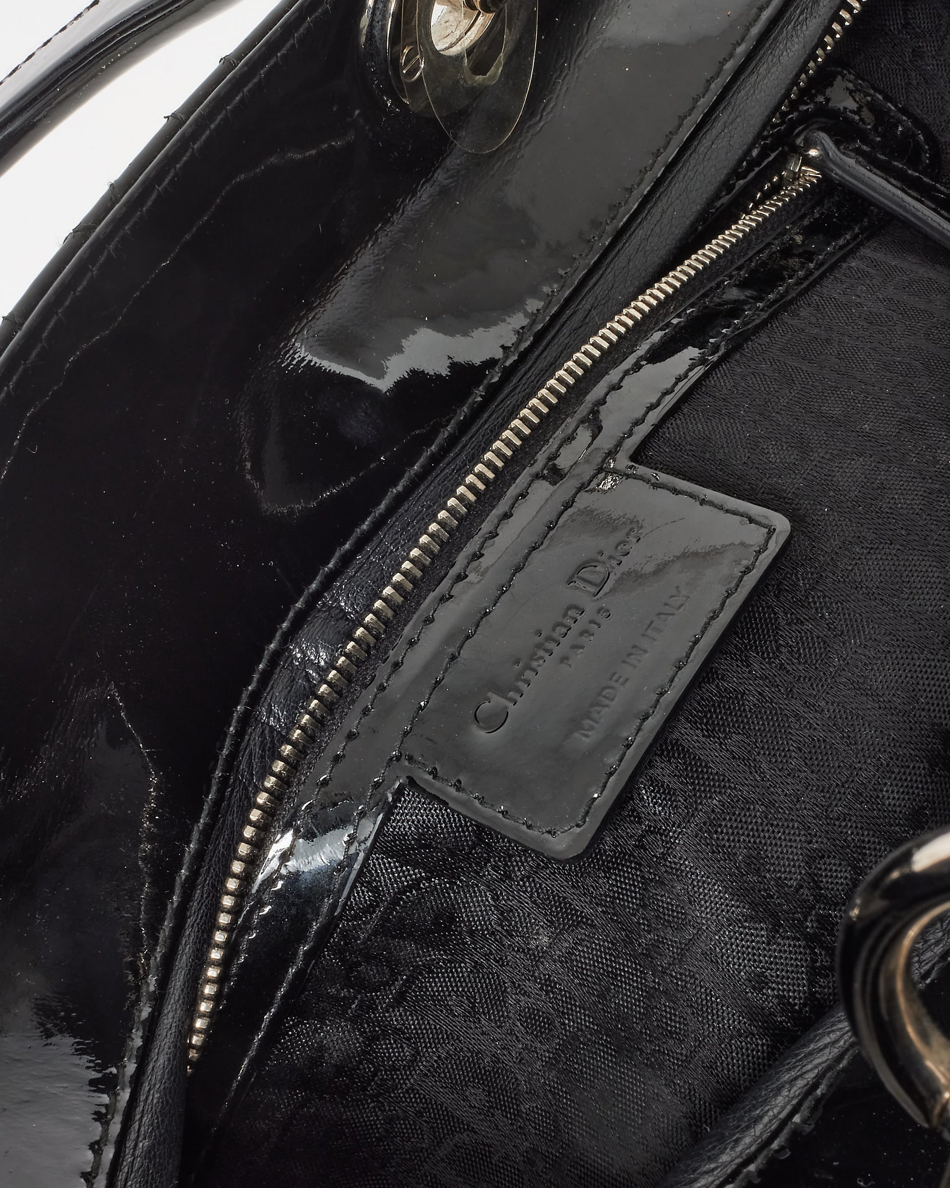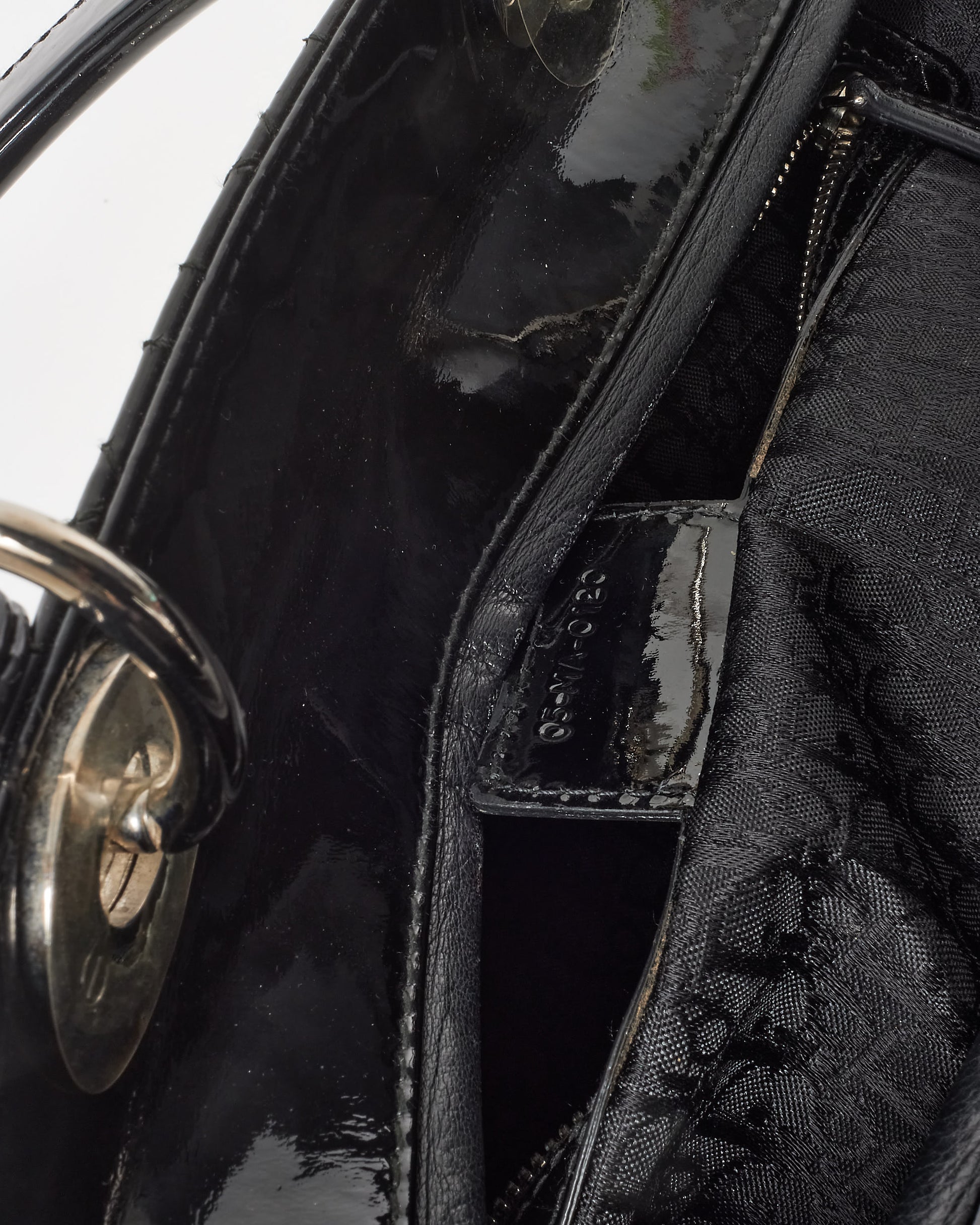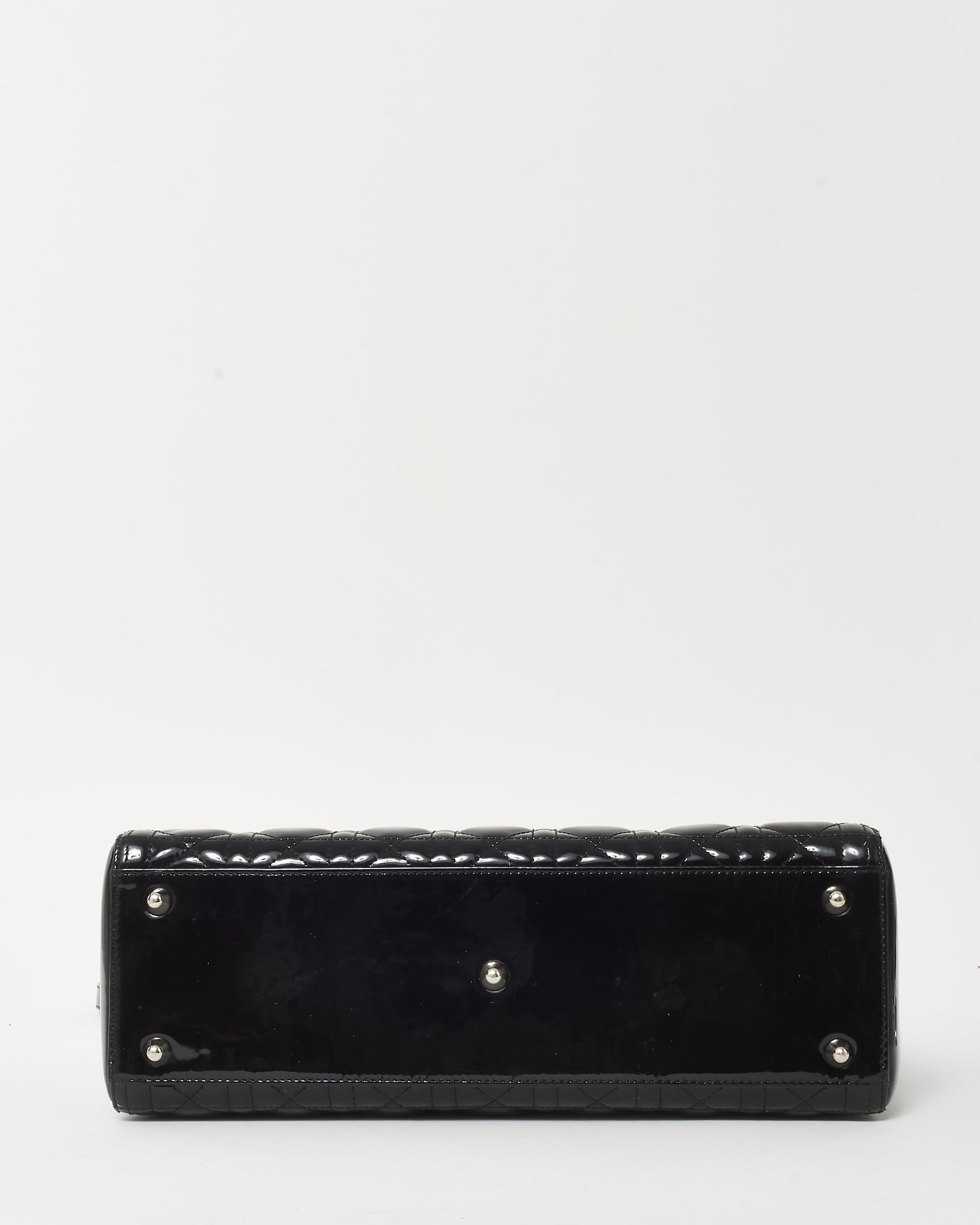 Timeless elegance with a bold finish, this pre-loved authentic Dior Large Lady Dior Tote is crafted from glossy black patent leather in the house’s iconic Cannage stitching. The structured silhouette is elevated by silver-tone hardware and signature ‘D.I.O.R.’ charms that add a touch of refined glamour.