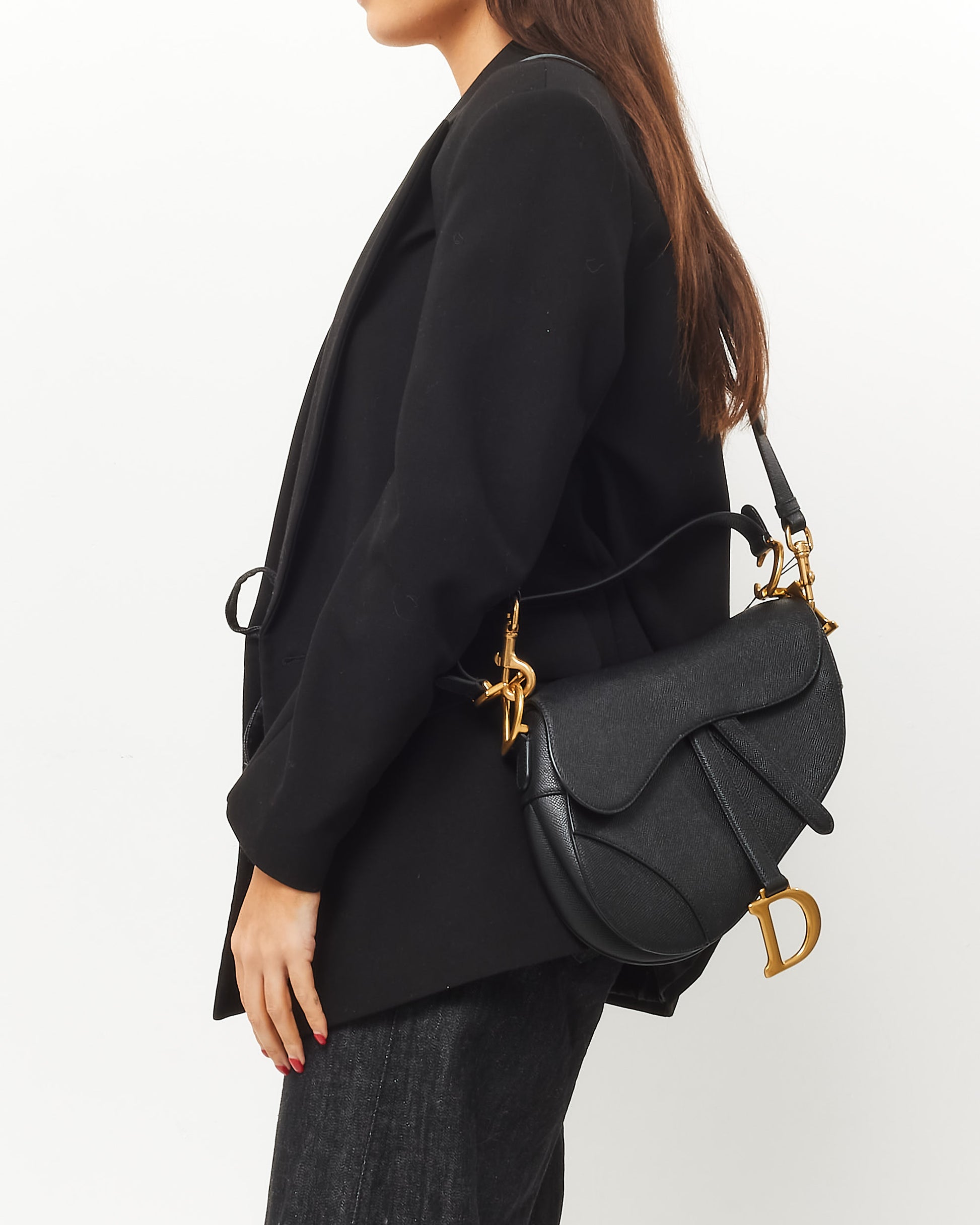 Bold, iconic, and undeniably elegant, the pre-owned authentic Dior Black Grained Calfskin Leather Saddle Bag with Strap is a contemporary classic with a rebellious spirit. Crafted from rich black grained calfskin leather, this statement silhouette showcases the signature asymmetric flap and antique gold-tone ‘D’ charm hardware, embodying the house’s heritage with a modern twist.