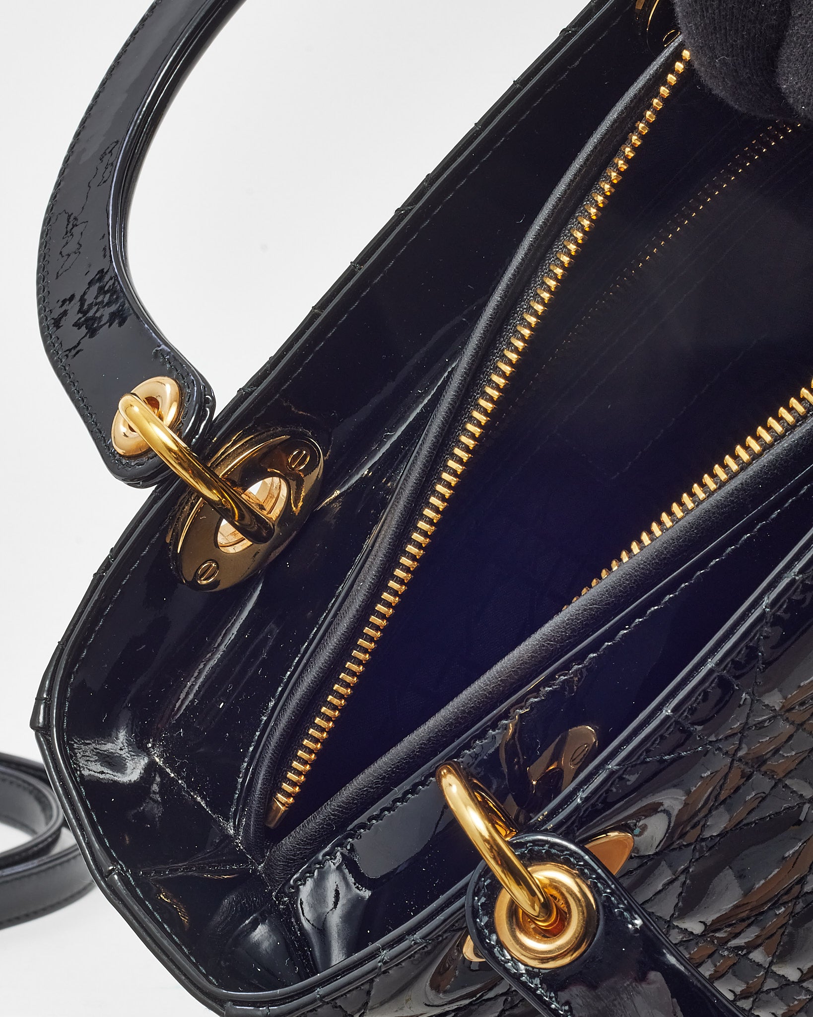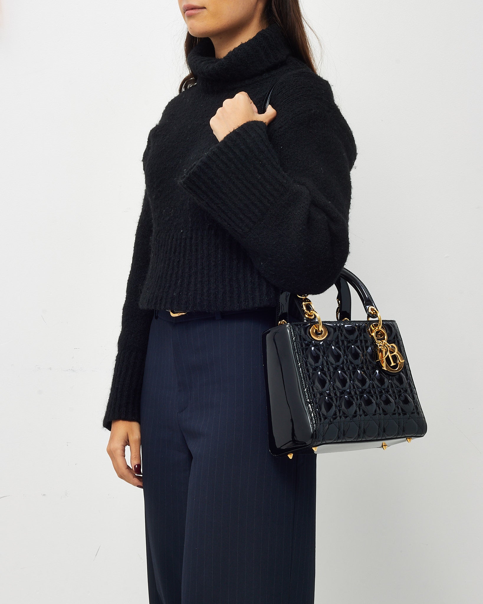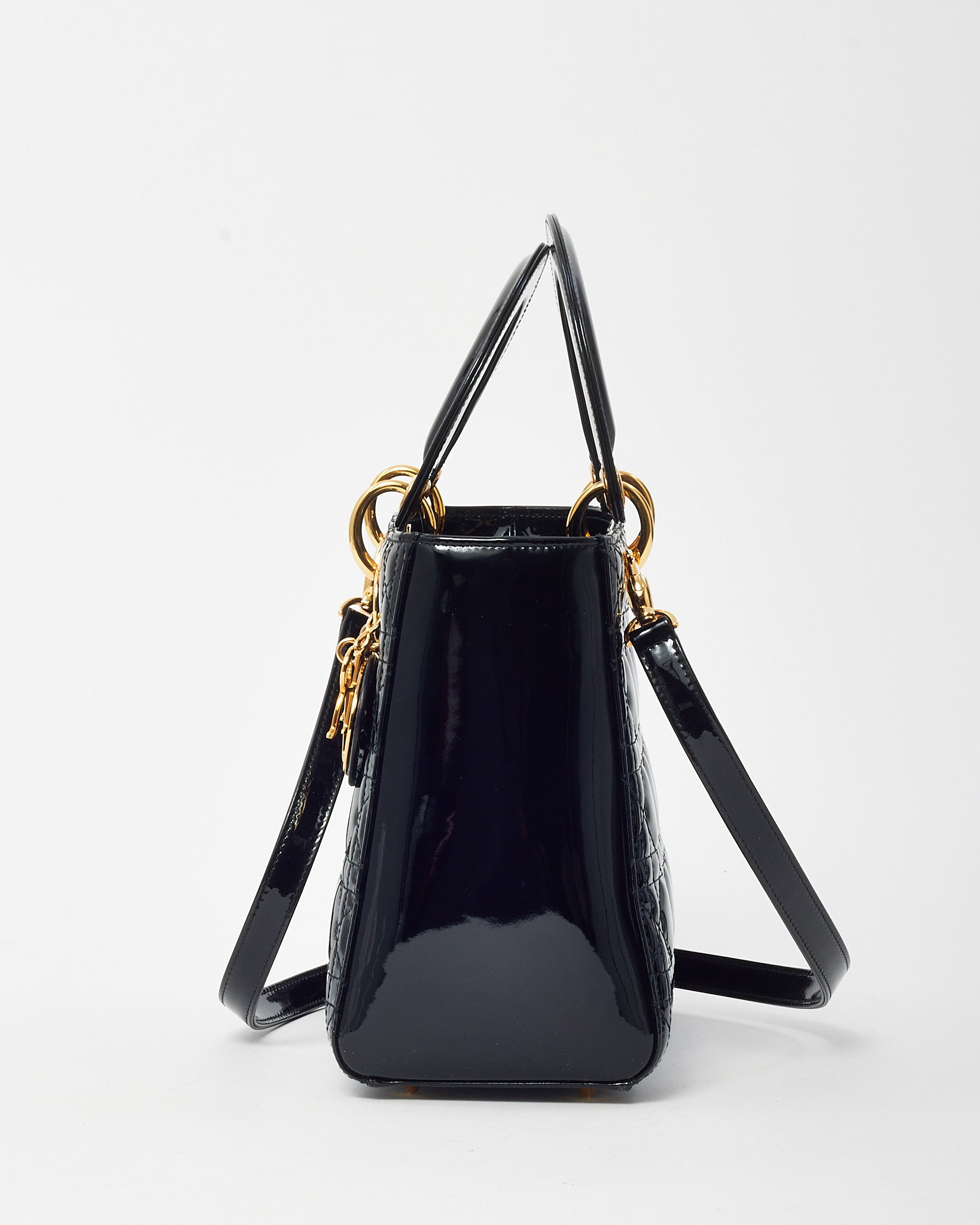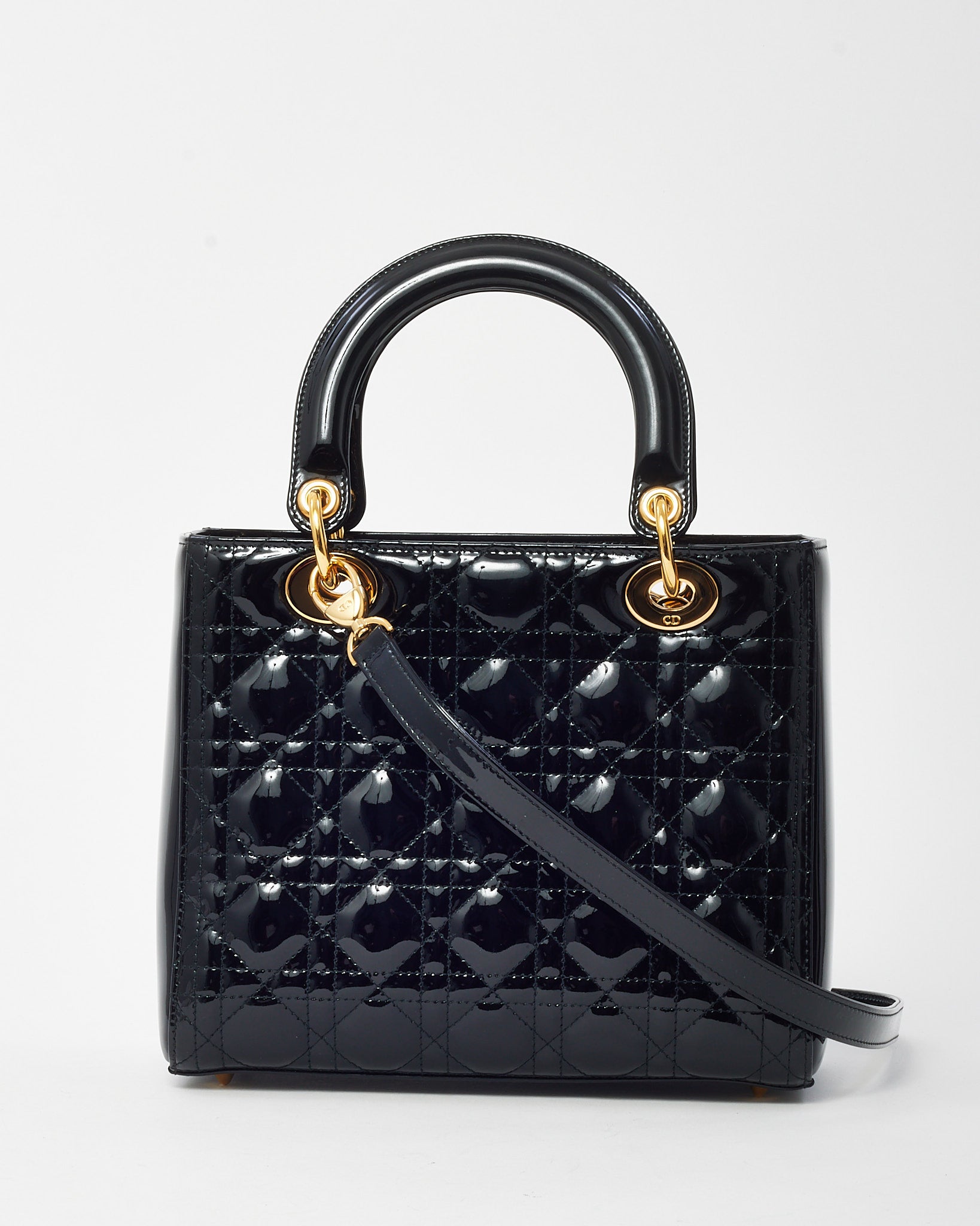 Elevate your wardrobe with the timeless elegance of this pre-loved authentic Dior Medium Lady Dior Bag, crafted in glossy black patent leather. Featuring the iconic Cannage quilting and structured silhouette, this sophisticated piece is accented with gold-tone hardware and signature Dior letter charms that add a polished finish. The top handles offer ladylike charm, while the optional strap allows for hands-free versatility. A symbol of refined Parisian style, this classic Lady Dior transitions effortlessly from day to evening with enduring grace and iconic appeal.