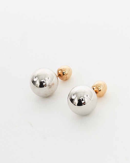 Make a statement with the authenticated pre-owned Dior Gold & Silver Mise En Dior Tribal Earrings, an iconic piece that seamlessly blends modern elegance with timeless sophistication. Featuring a double-sided design, these earrings showcase a smaller gold-tone stud on the front and a larger silver-tone sphere at the back, creating a bold and contemporary aesthetic.
