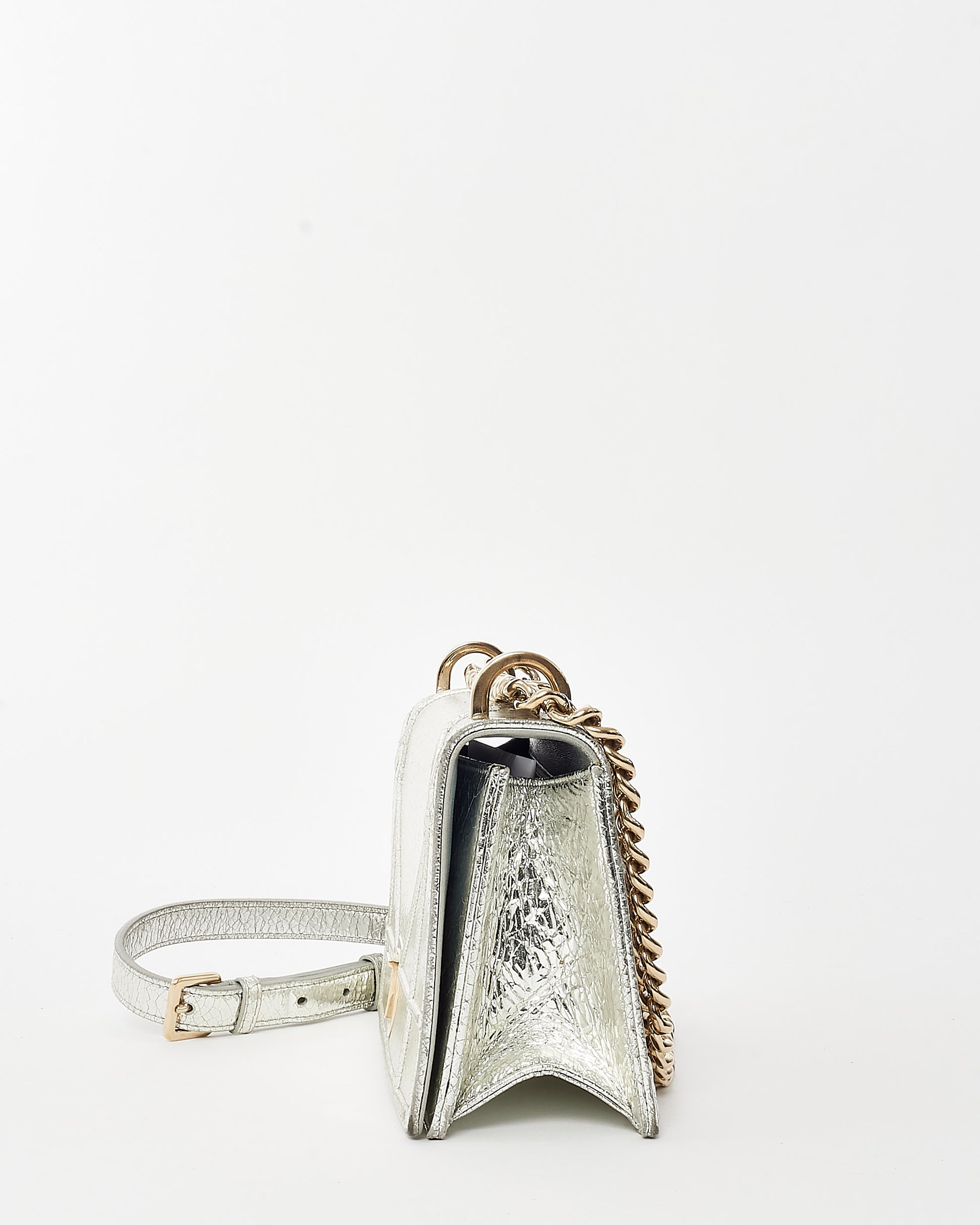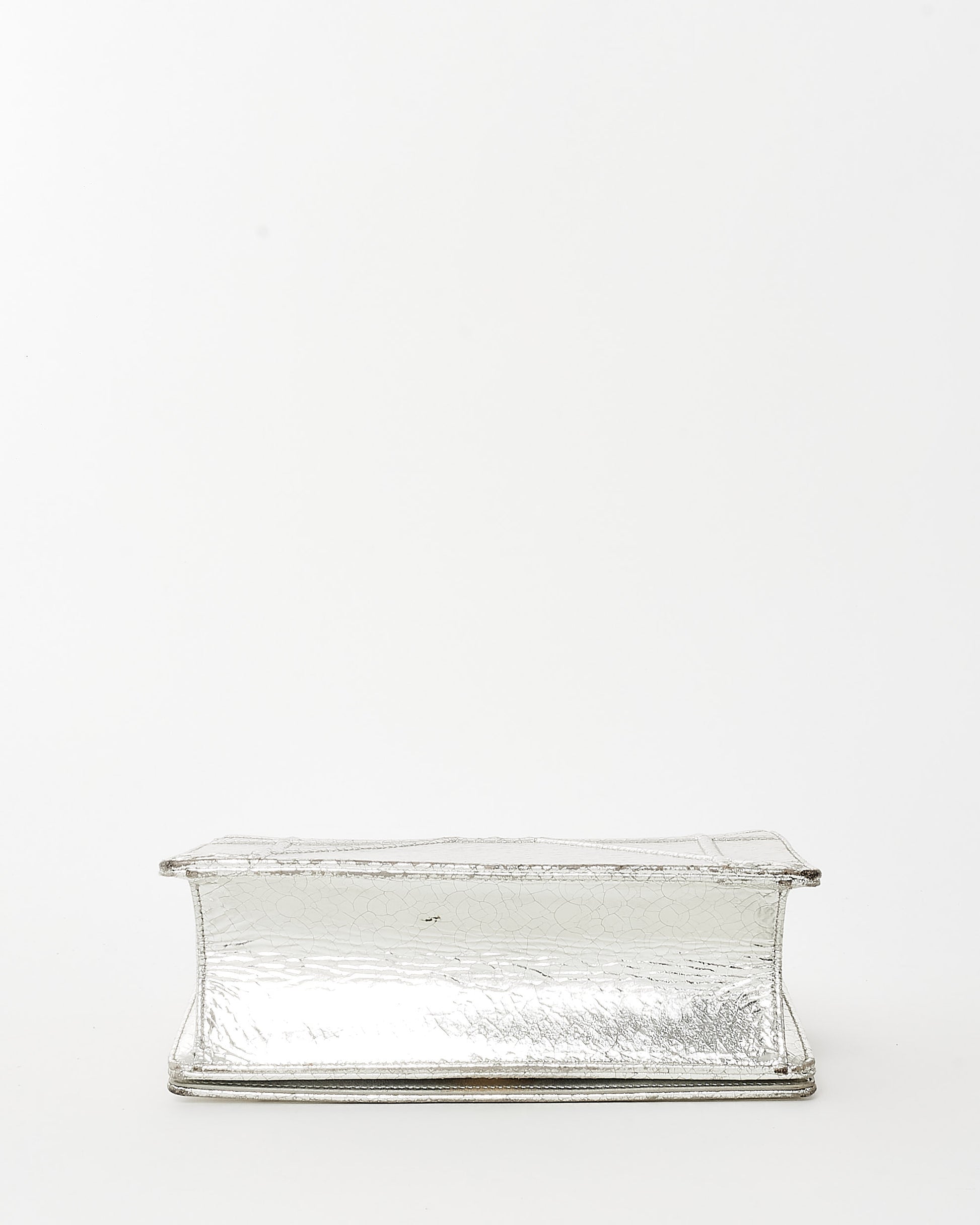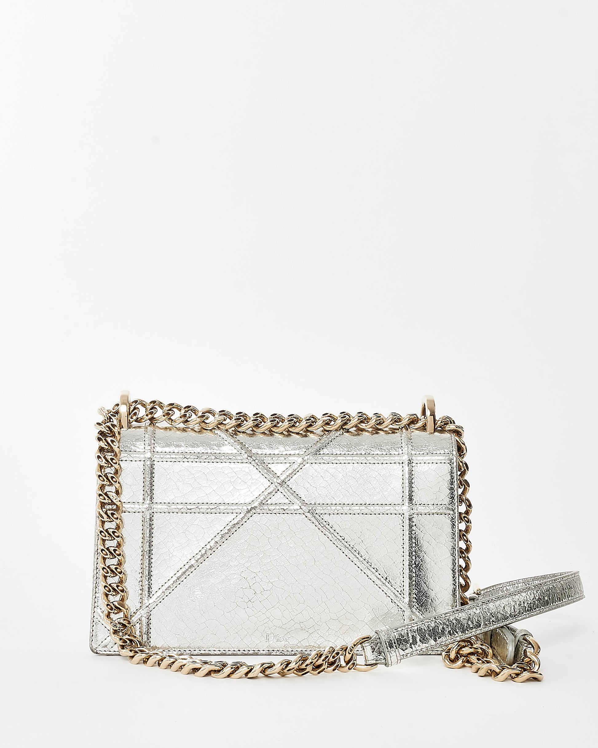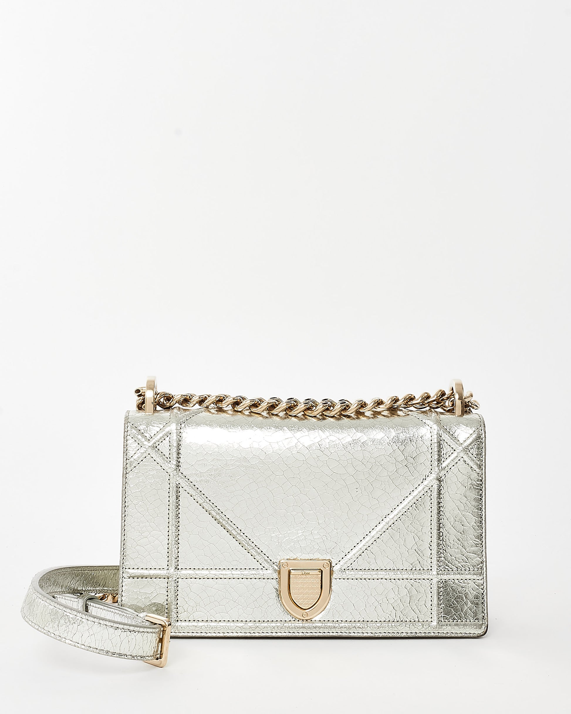 Futuristic edge meets Parisian elegance in the pre-owned authentic Dior Metallic Silver Crackled Leather Small Diorama Flap Bag. Crafted from textured crackled metallic silver leather, this striking bag features the signature cannage-patterned crest-shaped clasp and structured silhouette, offering a bold yet sophisticated finish.