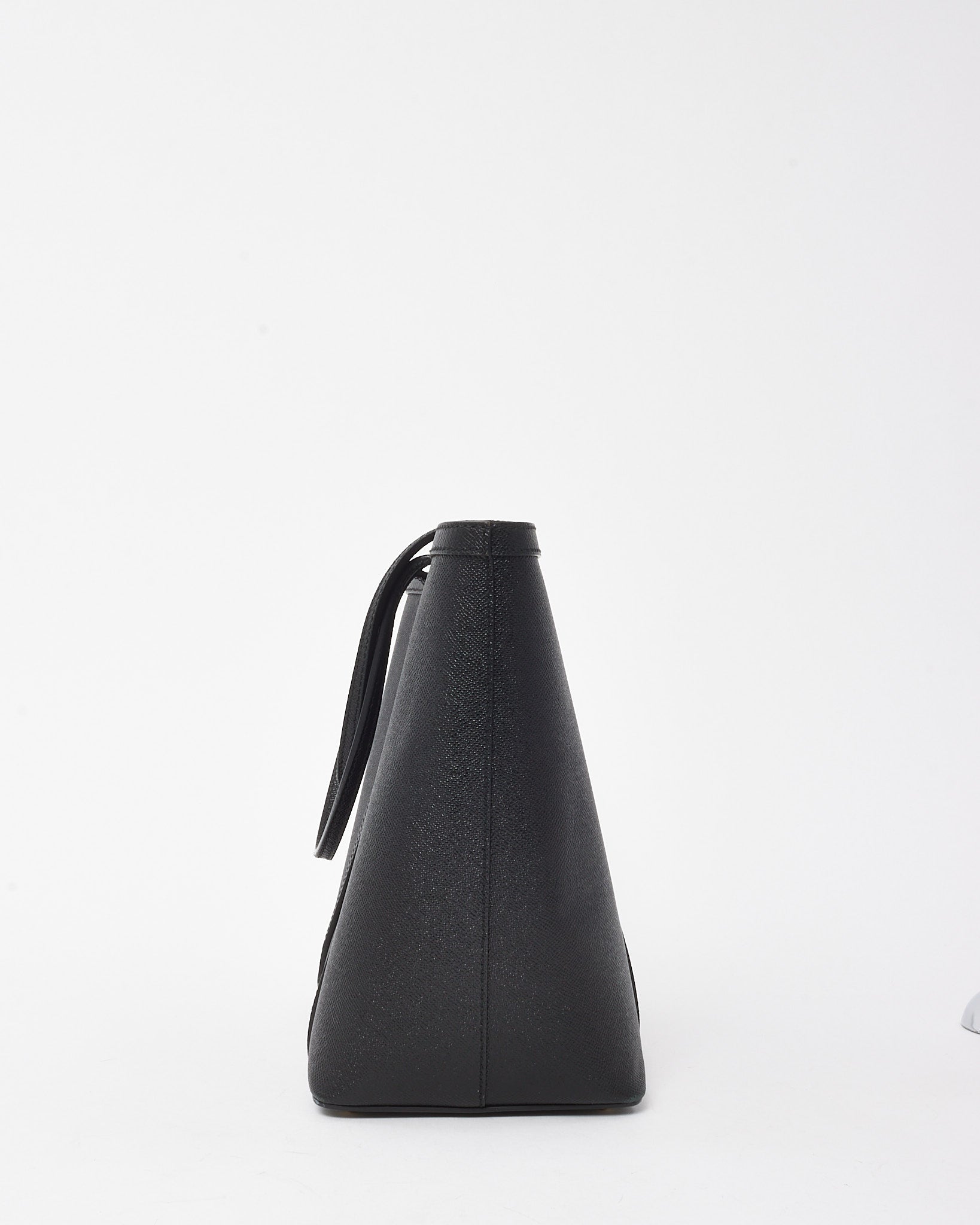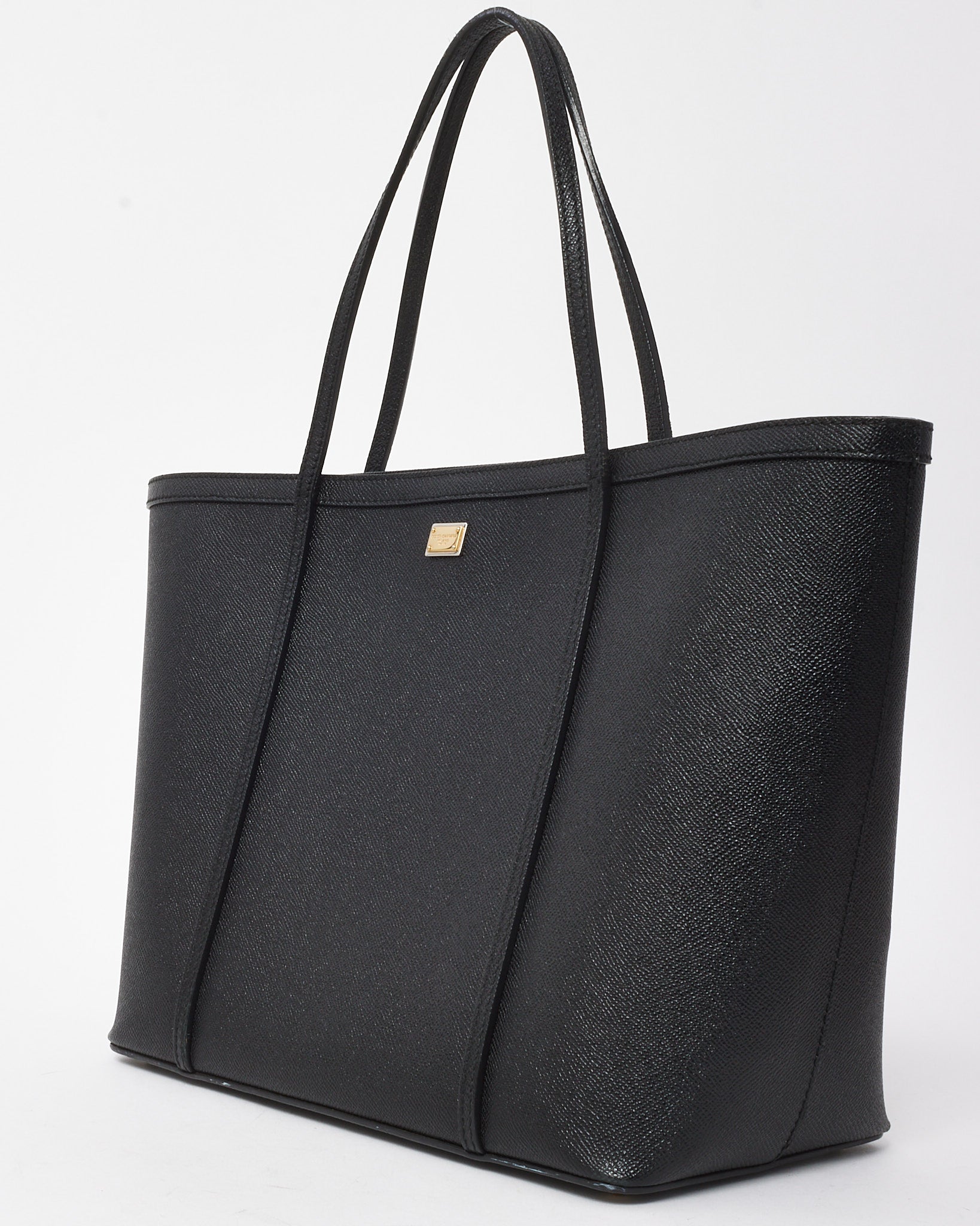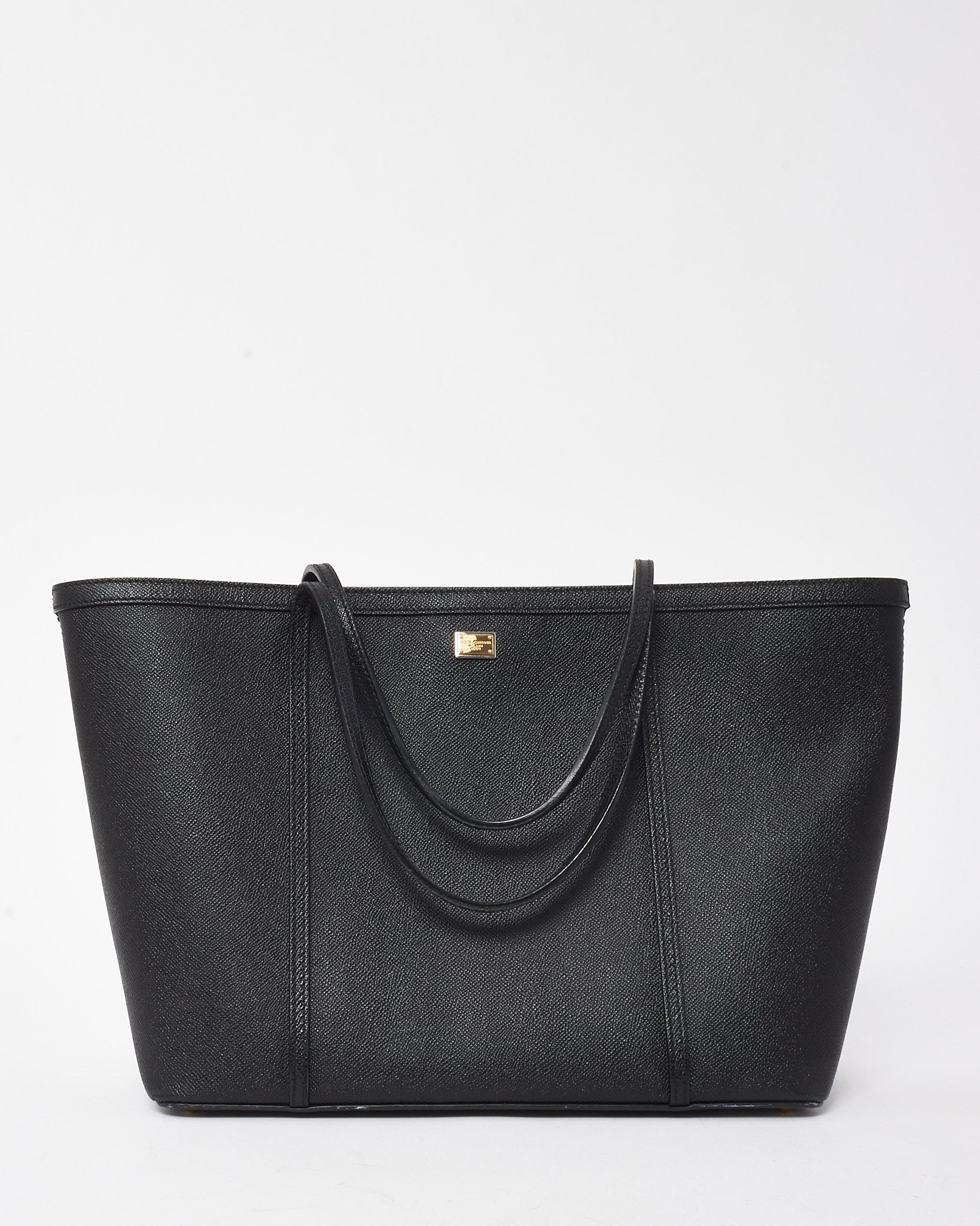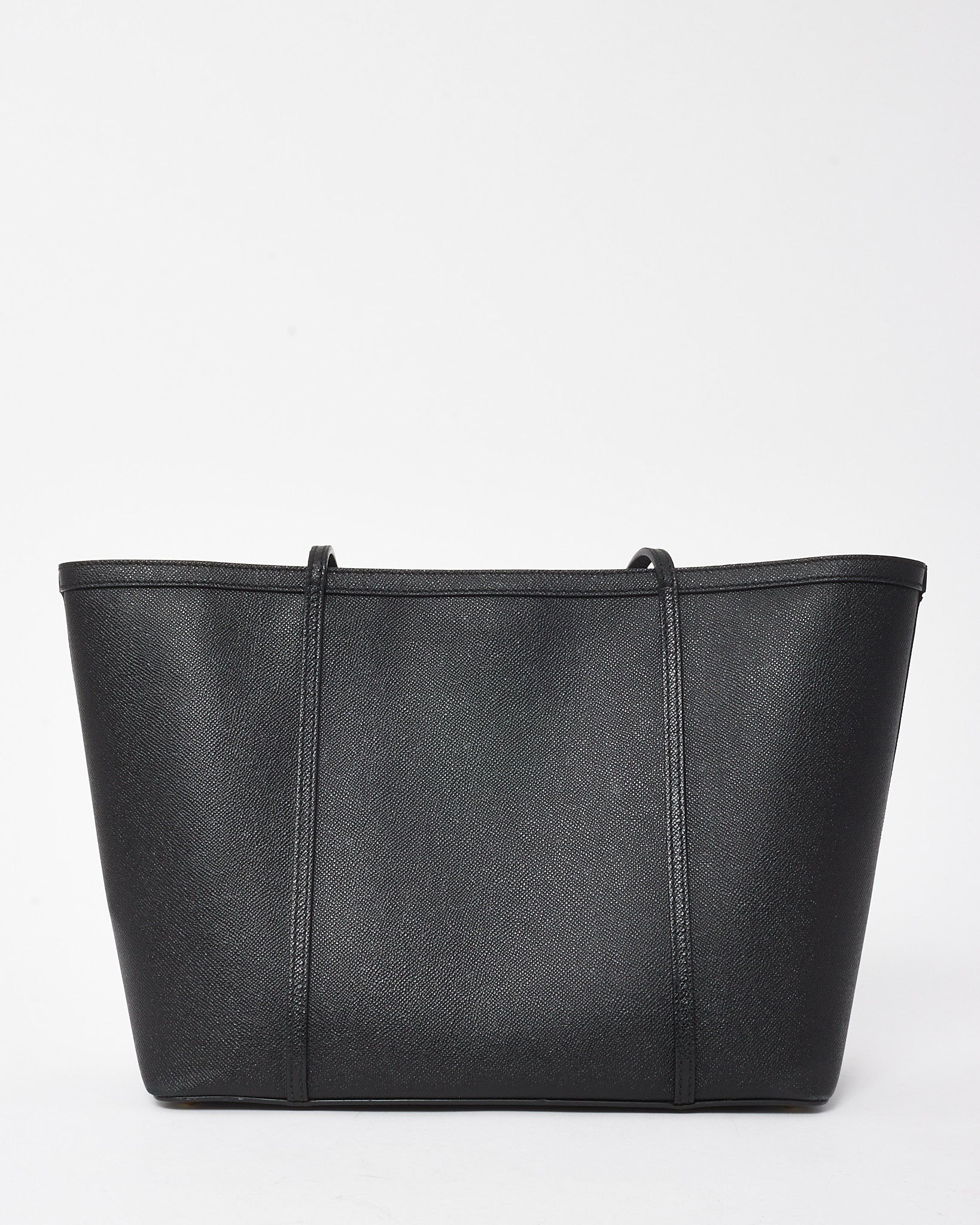 Command attention with this pre-loved authentic Dolce & Gabbana Miss Escape shopping tote, a timeless expression of Italian luxury. Crafted in supple black grained leather, this spacious silhouette is designed for both function and flair. The minimal exterior is subtly embossed with the house logo and finished with rolled top handles for a polished carry. A roomy interior with ample space for daily or travel essentials makes it a chic companion for workdays and weekends alike. Effortlessly elegant and endlessly versatile, this tote captures Dolce & Gabbana’s refined yet practical sensibility.