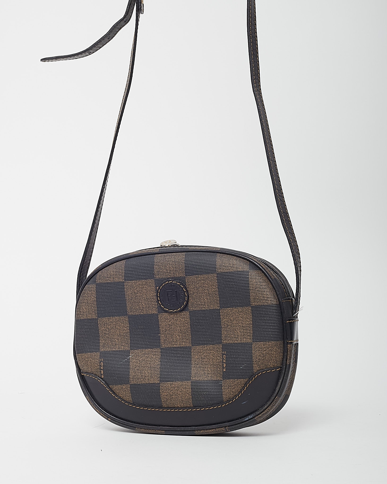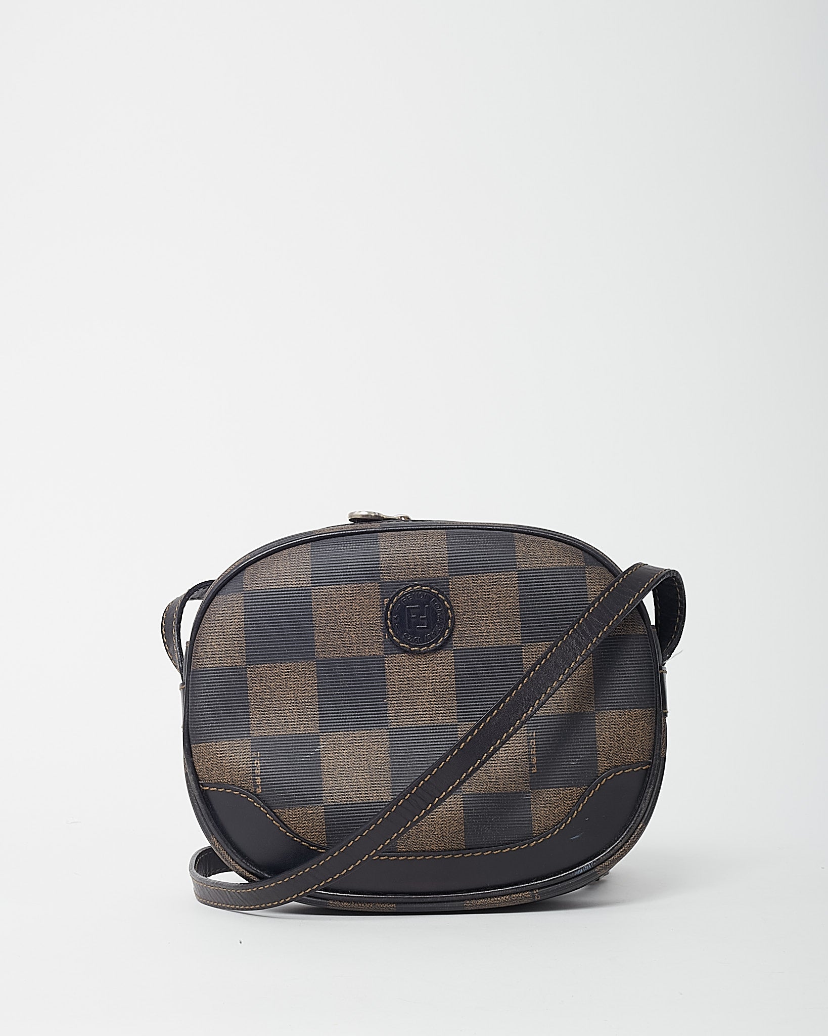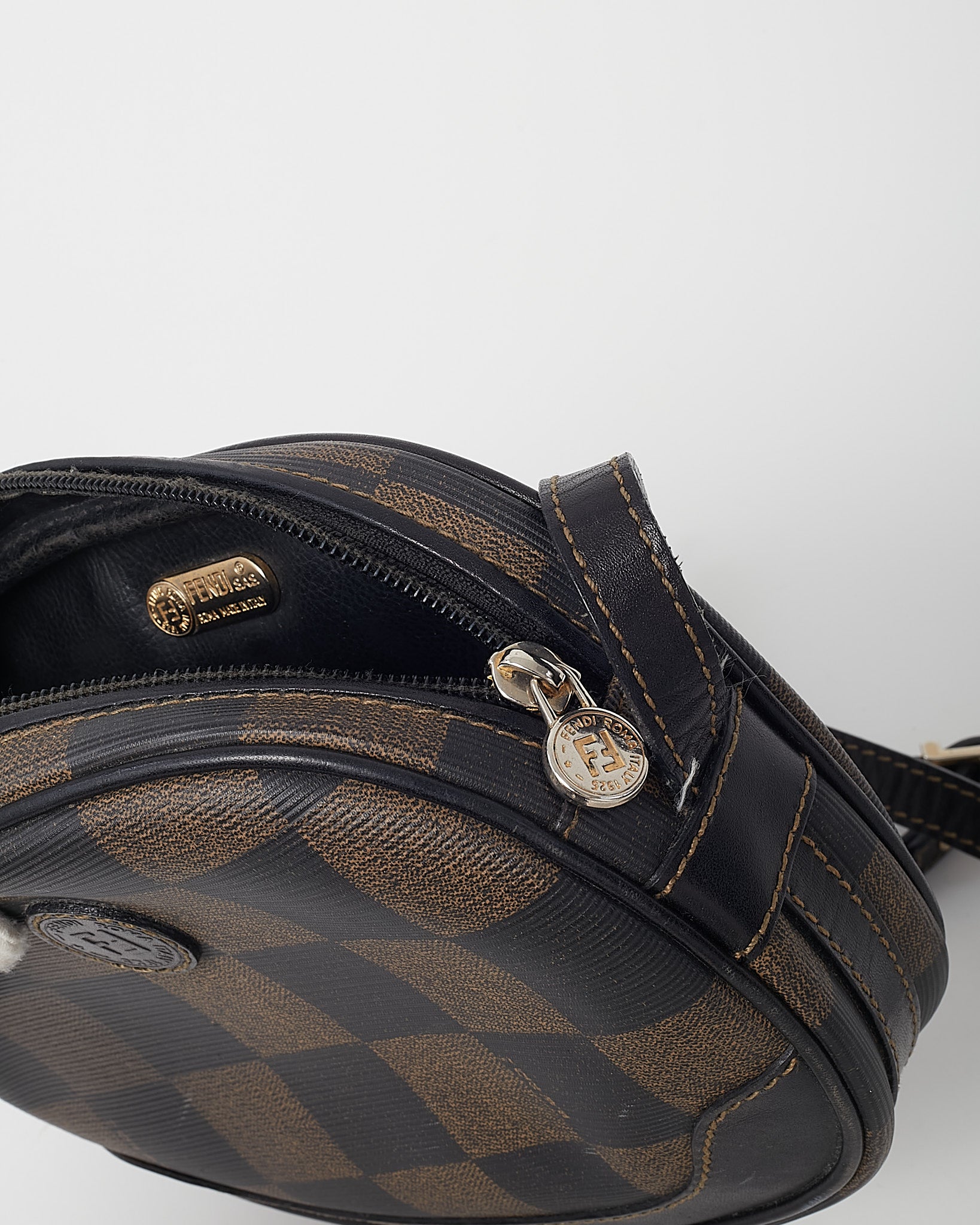 Add a touch of vintage Fendi charm to your collection with this pre-loved authentic Fendi Vintage Brown Pequin Check Coated Canvas Mini Round Crossbody Bag, crafted in the house’s iconic Pequin striped coated canvas with rich brown leather accents. The unique mini round silhouette offers a compact yet eye-catching design, perfect for carrying essentials while making a statement. Finished with an adjustable crossbody strap for hands-free wear, this Fendi bag blends heritage patterning with playful proportions. A distinctive vintage designer piece that delivers timeless Italian craftsmanship and effortless everyday style.