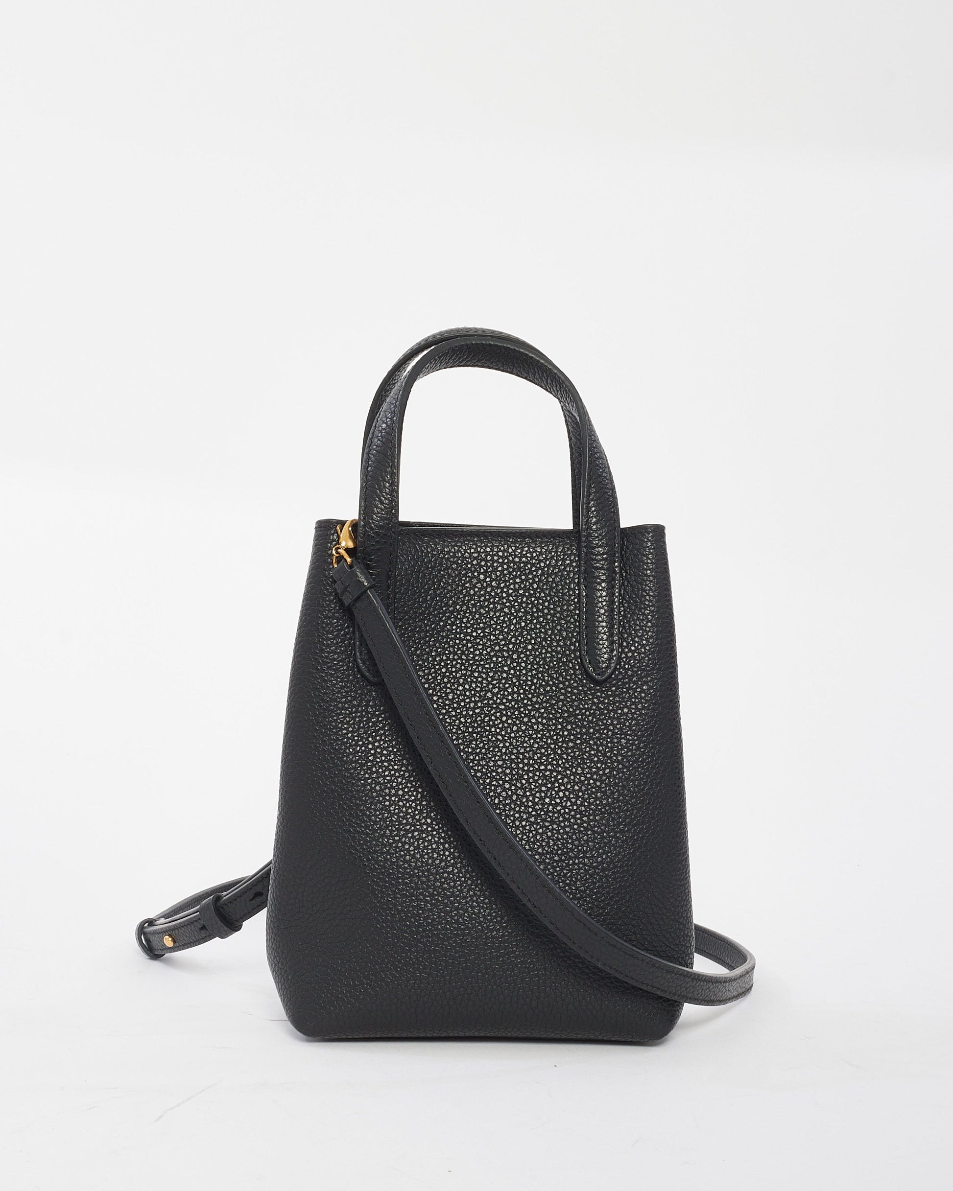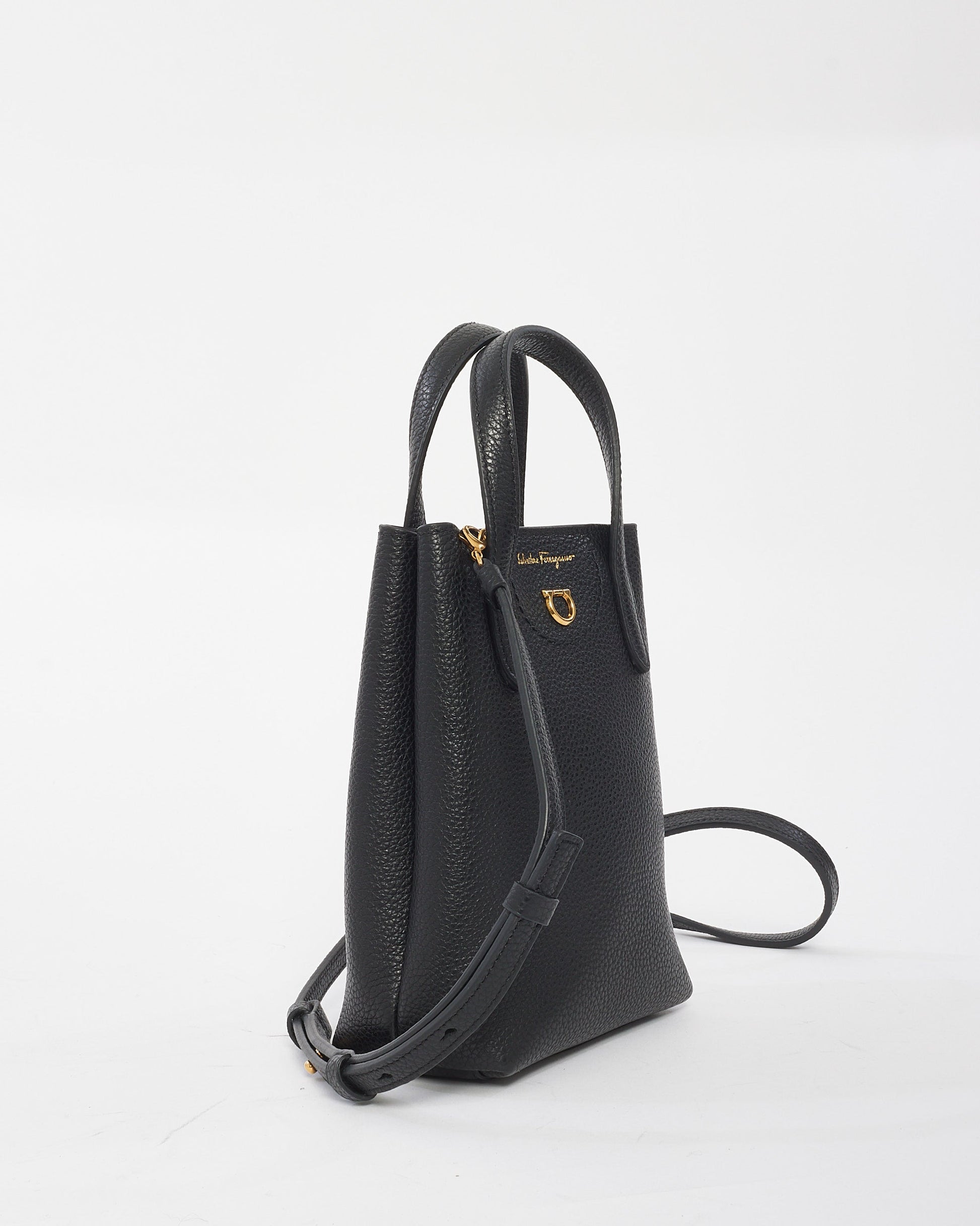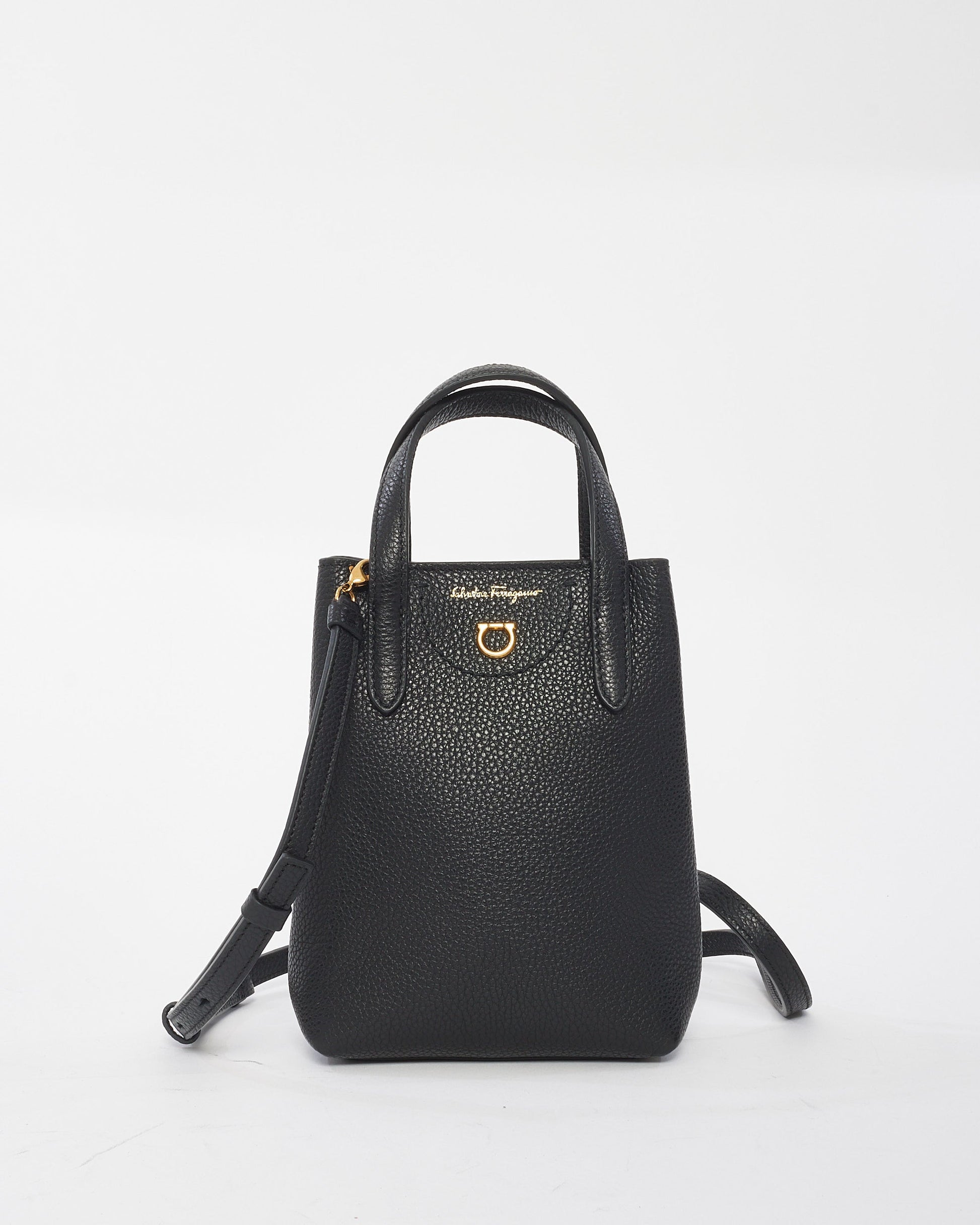 Explore Salvatore Ferragamo's exquisite collection of handbags, featuring this certified pre-owned Black Leather Mini Grancini Crossbody Bag. Embodying timeless elegance and modern sustainability, each piece, including favorites like this, is authenticated by Retyche. Discover sustainable luxury — shop our current treasures or find inspiration for your next coveted find.