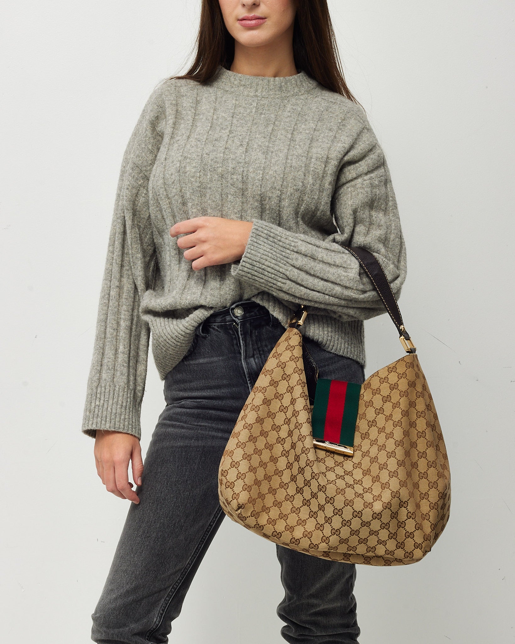 Beige and Brown GG Monogram Canvas New Ladies Web Large Hobo Bag