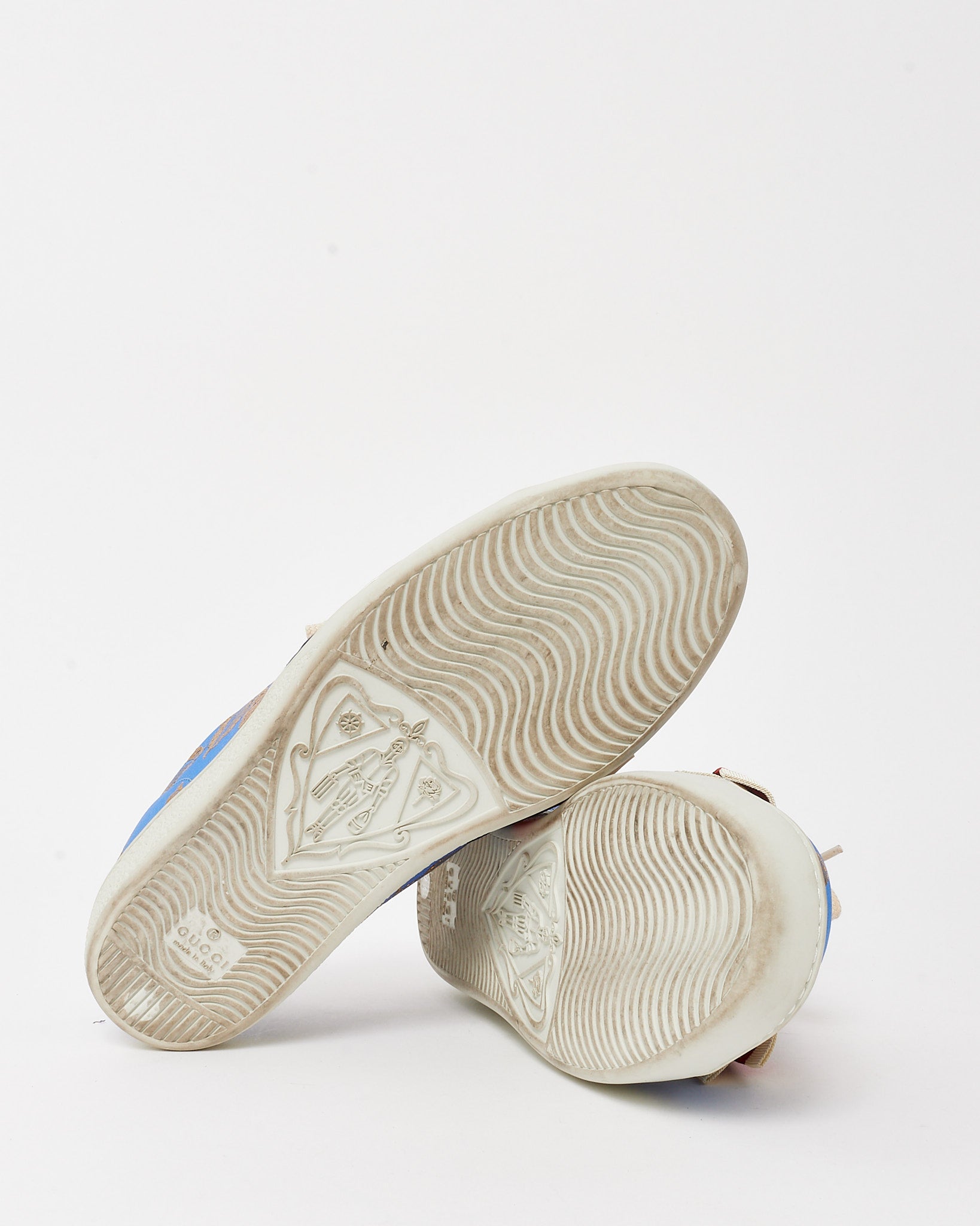 Elevate your sneaker game with these pre-loved authentic Gucci low-top sneakers, crafted in rich blue leather and adorned with crystal-encrusted bow appliqués. A statement in maximalist glamour, these bold kicks feature intricate gold-tone leaf embroidery and glittering embellishments that add runway-level sparkle to any look. Set on a rubber sole with classic Gucci detailing, they’re the perfect fusion of high fashion and sporty chic—ideal for turning heads from street style to soirées.