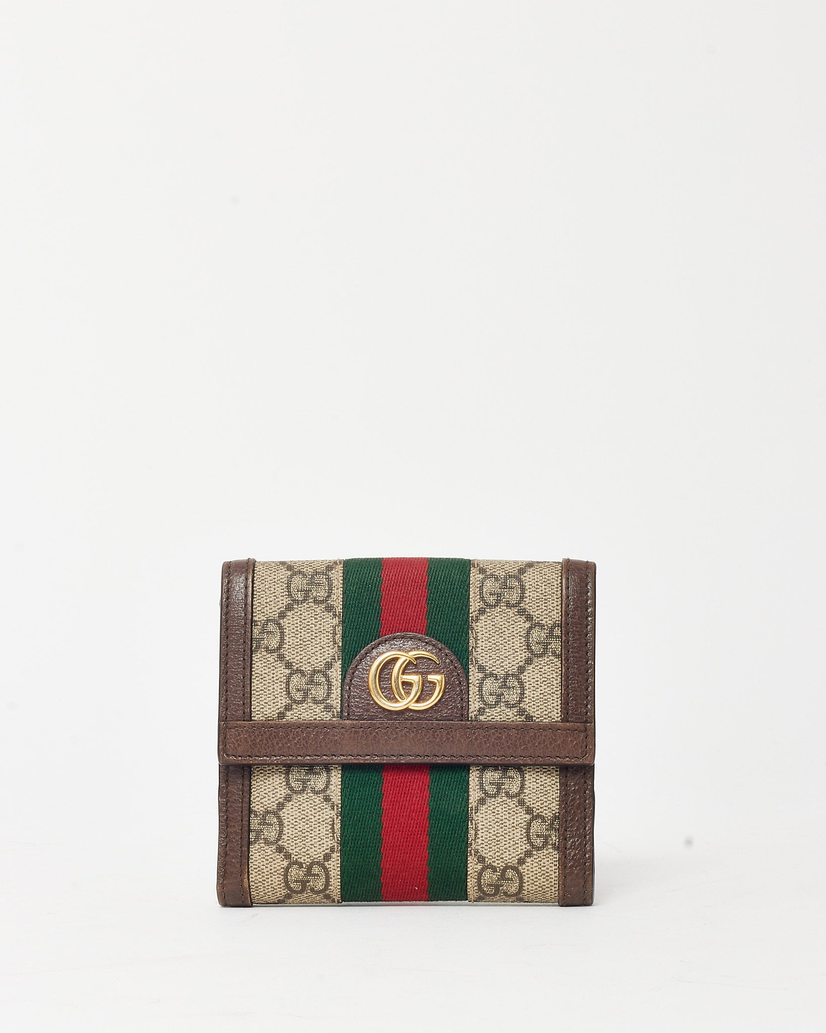 Timelessly elegant, this pre-loved authentic Gucci Brown Leather & GG Supreme Canvas Ophidia French Flap Wallet combines signature House codes with everyday functionality. Crafted from classic GG Supreme coated canvas with brown leather trim, it features a front flap adorned with the iconic green and red Web stripe and gold-tone GG logo. Inside, you’ll find a thoughtfully organized interior with multiple card slots, a bill compartment, and a coin pocket. Compact yet refined, it’s a sophisticated addition to any accessory collection.