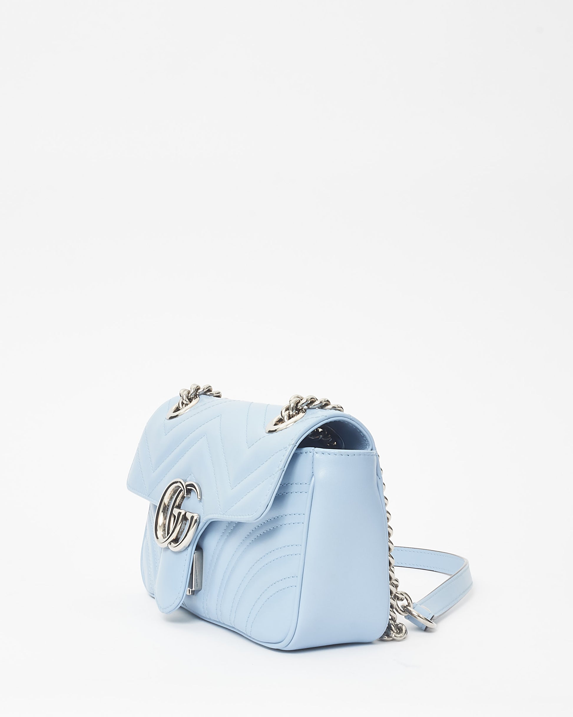 Explore Gucci's exquisite collection of handbags, featuring this certified pre-owned Light Blue Leather Mini Marmont Flap Shoulder Bag. Embodying timeless elegance and modern sustainability, each piece, including favorites like this, is authenticated by Retyche. Discover sustainable luxury — shop our current treasures or find inspiration for your next coveted find.