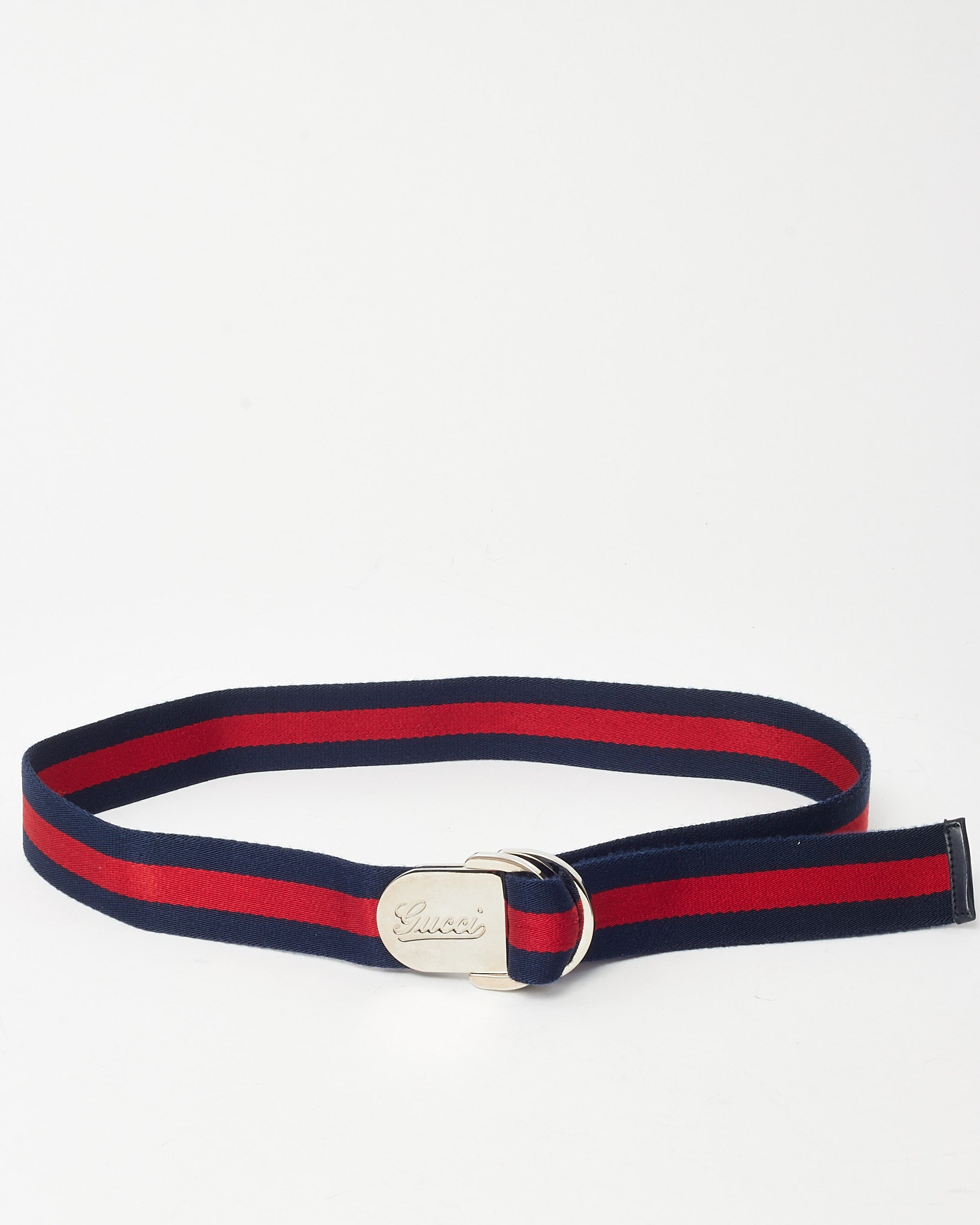 Add a signature touch of heritage style to your wardrobe with this pre-loved authentic Gucci Navy and Red Web Stripe Canvas SHW D-Ring Buckle Belt - 90/36, crafted in durable canvas featuring the iconic navy and red Web stripe. The statement D-ring buckle in silver-tone hardware delivers a modern, utilitarian edge while staying true to Gucci’s archival design codes. Designed for versatile everyday wear, this luxury canvas belt pairs effortlessly with denim, streetwear, or tailored looks for a polished yet relaxed finish. Blending classic Gucci branding with contemporary functionality, this designer belt is a standout accessory for any curated collection.