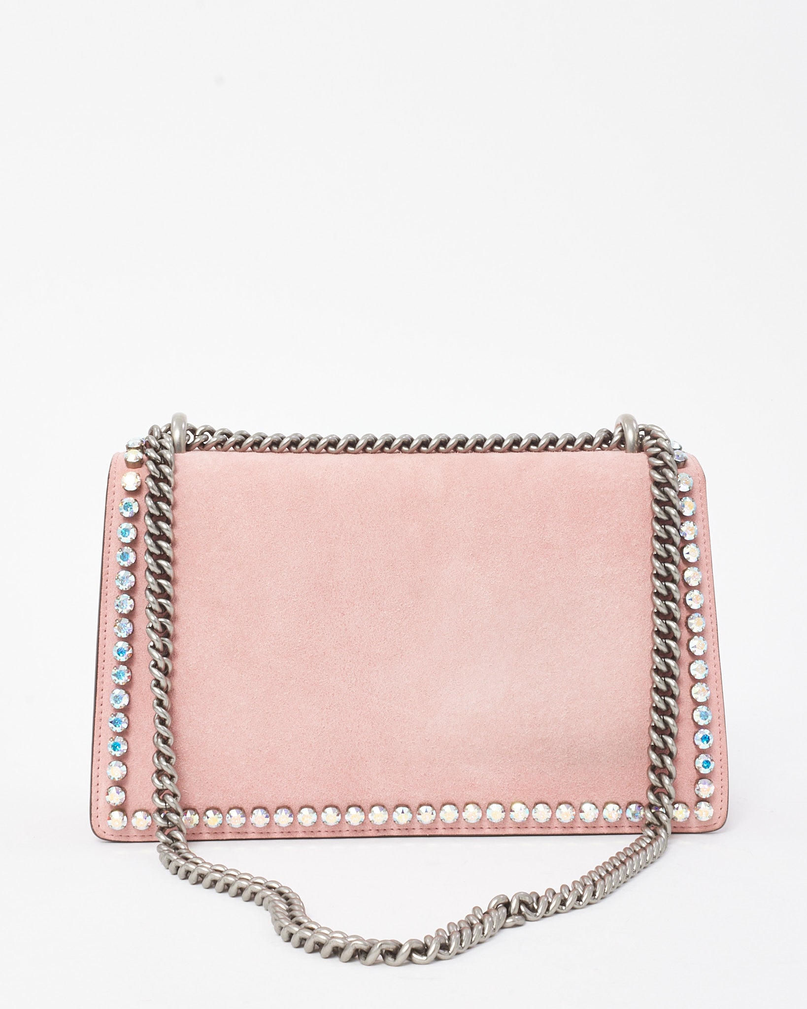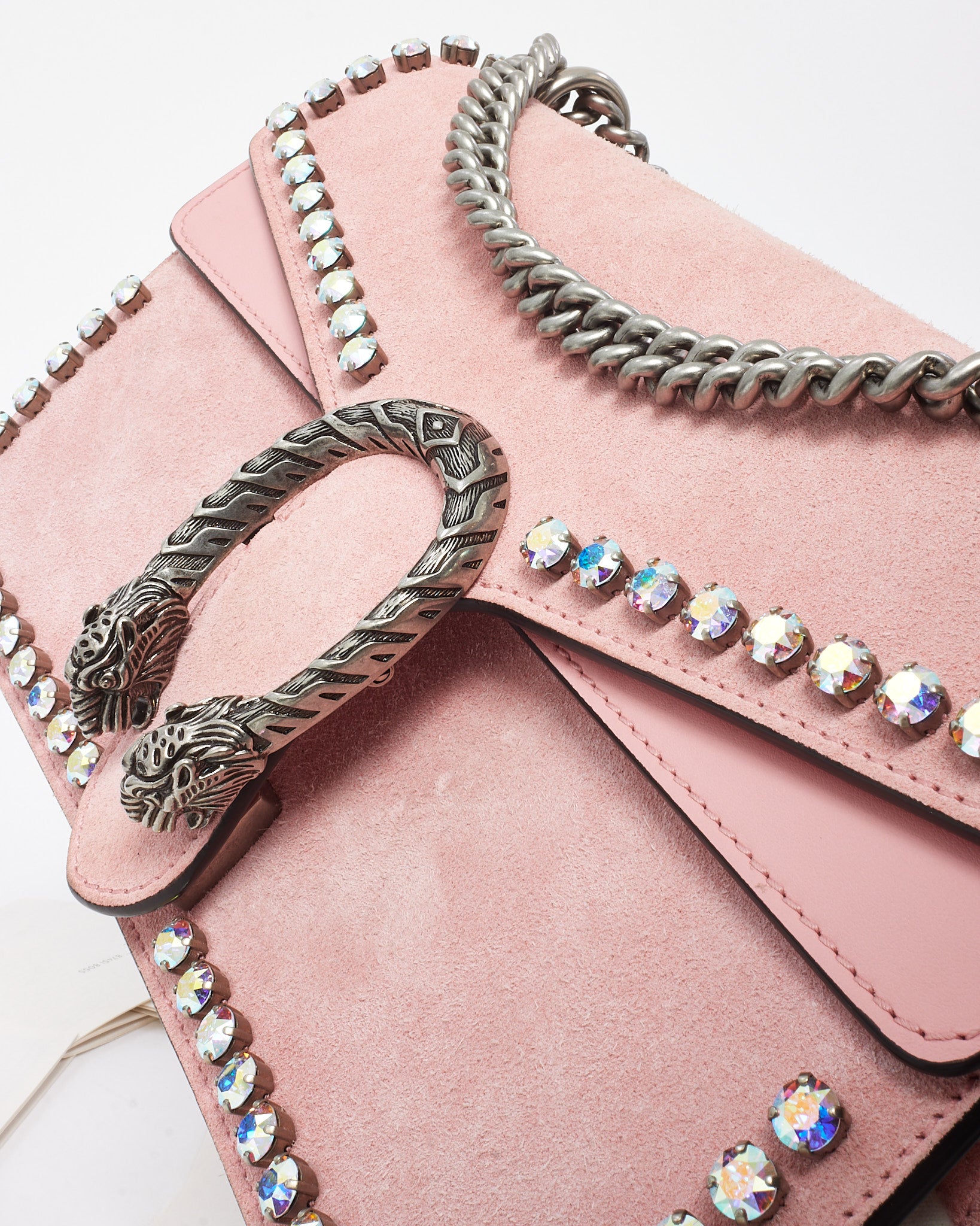 Make a statement with this pre-loved authentic Pink Suede and Crystal Small Dionysus Shoulder Bag by Gucci. Crafted in Italy from plush pink suede, this standout piece is elevated by shimmering crystal embellishments and the iconic tiger head closure—an homage to the mythological god Dionysus. The antique silver-tone hardware and hand-painted edges add depth and luxury, while the sliding chain strap allows for shoulder or top-handle carry. Compact yet structured, it features an interior zip compartment and pocket under the flap for easy organization. A dazzling fusion of elegance and edge, perfect for day-to-night transitions.