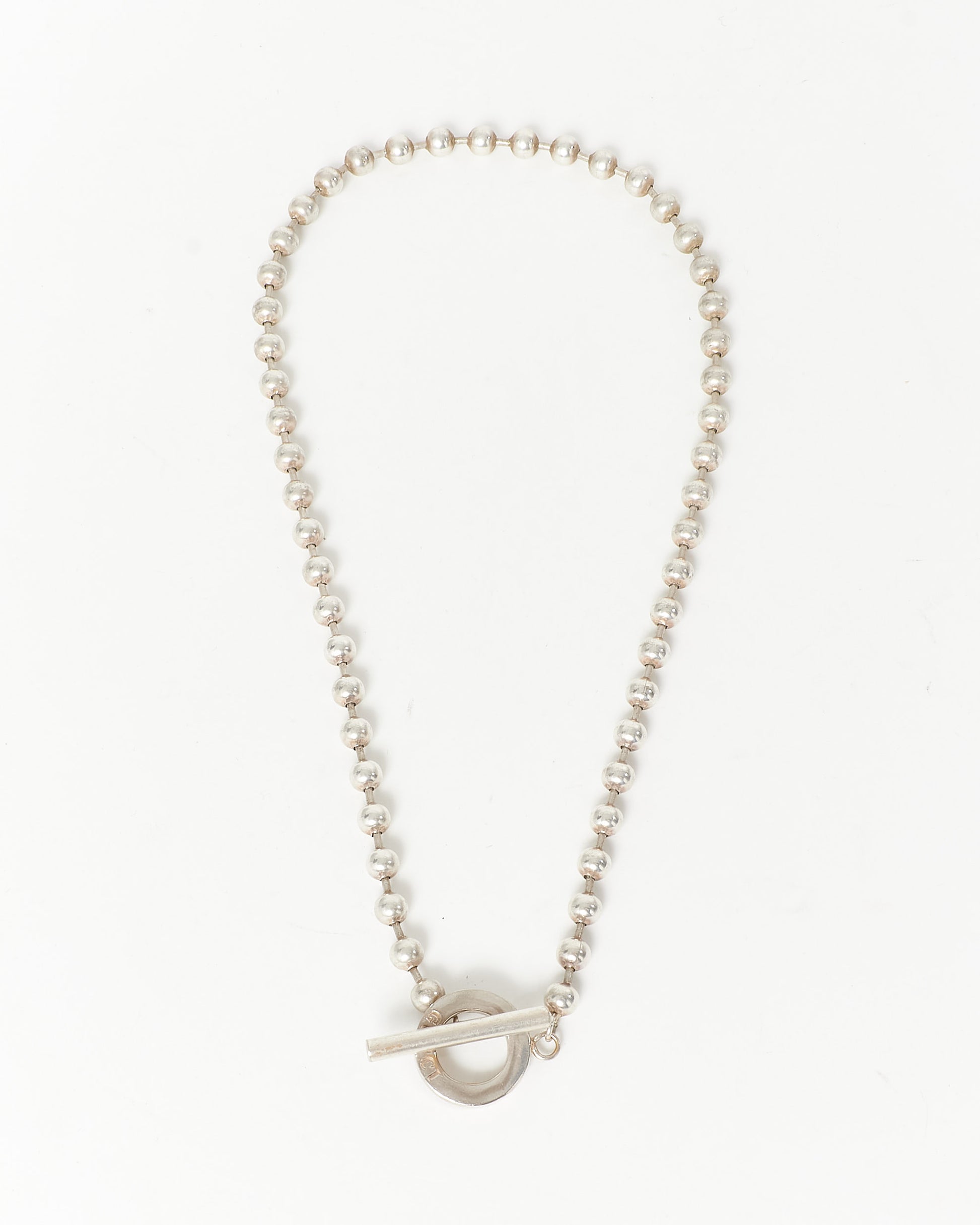 This is an authentic pre-owned Gucci Sterling Silver Beaded Toggle Logo Necklace. This necklace features a series of polished sterling silver beads, culminating in a toggle clasp adorned with the iconic Gucci logo. Crafted from 925 sterling silver, necklace comprises uniformly sized beads, offering a classic and elegant appearance. The toggle closure is both functional and decorative, engraved with the Gucci logo for brand recognition. Shop pre-owned authentic Gucci jewelry at Retyche.