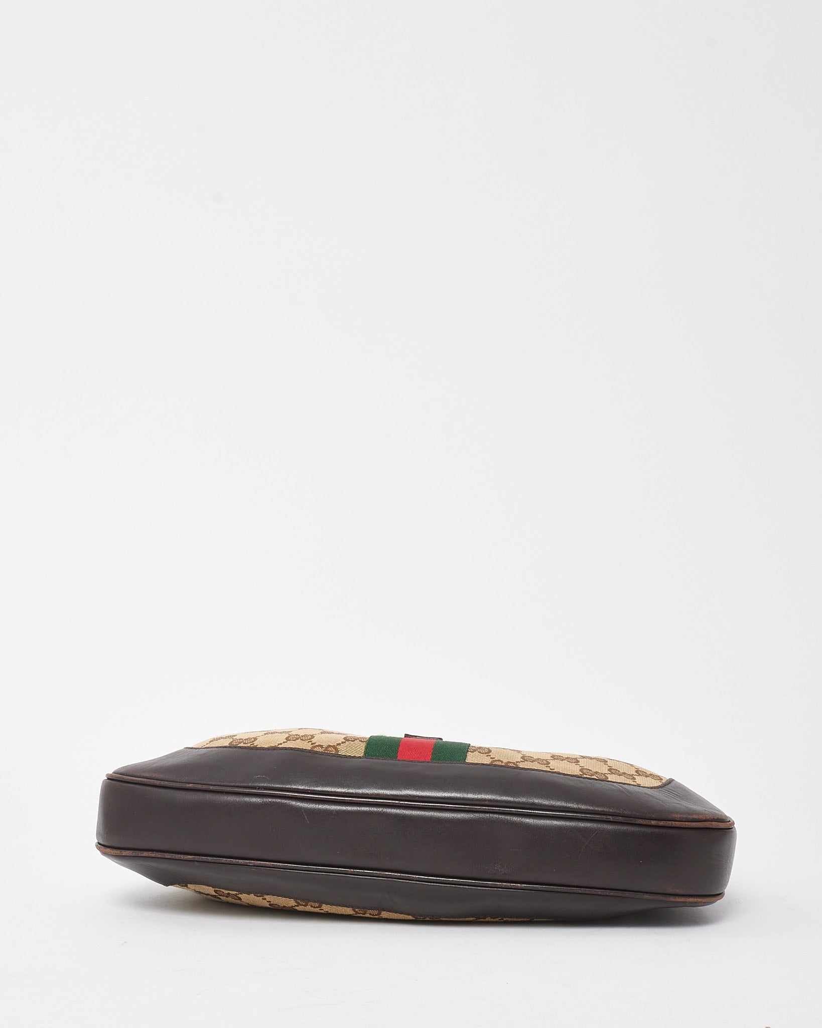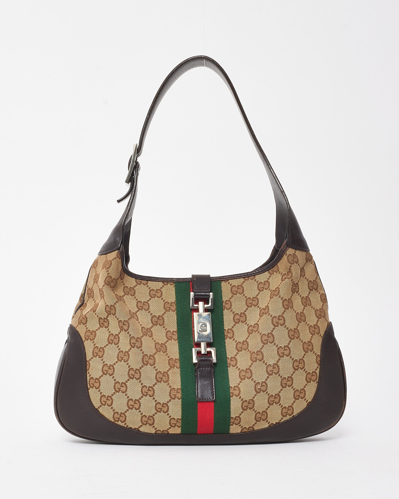 Add vintage sophistication to your collection with this pre-loved authentic Gucci Vintage Brown Leather and Beige GG Monogram Canvas Web Jackie Shoulder Bag. Crafted in the house’s iconic GG monogram canvas and trimmed in rich brown leather, this heritage design features the signature green and red web stripe and a gold-tone piston push-lock closure—hallmarks of the timeless Jackie silhouette. The spacious interior and classic shoulder strap make it a versatile choice for everyday elegance, embodying the enduring allure of vintage Gucci craftsmanship.