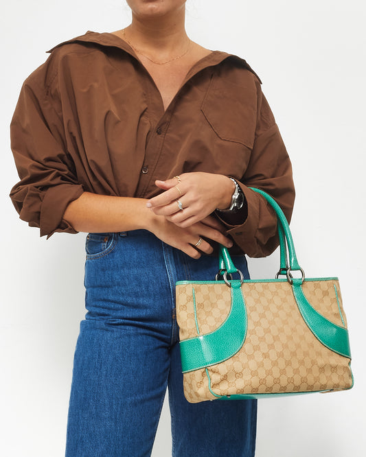 Explore Gucci's exquisite collection of handbags, featuring this certified pre-owned Vintage Monogram Canvas & Green Leather Shoulder Bag. Signature GG monogram canvas with green leather detailed. Zip closure with green fabric lining. Embodying timeless elegance and modern sustainability, each piece, including favorites like this, is authenticated by Retyche. Discover sustainable luxury — shop our current treasures or find inspiration for your next coveted find.